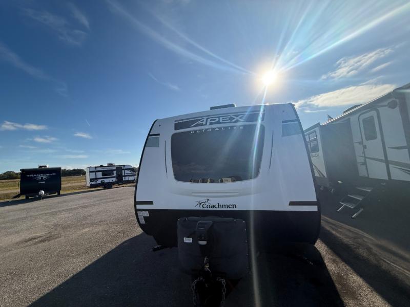 Lightweight living and camping is found with the Apex Ultra-Lite travel trailers by Coachmen. These eco-friendly units are made to last thanks to the Azdel composite sidewalls, the laminated aluminum floor, and the vacuum-bonded laminated crowned roof. Lippert axles and nitrogen filled radial tires make towing easier than ever, plus there is a friction hinge entrance door, a 100-watt solar panel with a 10 Amp control charger, and slam latch baggage door catches for easy unloading. Some of the interior comforts you'll fall in love with are the one-piece seamless edge countertops, the hard valances with night shades throughout, the matte black hardware, and the residential comforter. The Apex Ultra-Lite trailers also include USB ports, a digital TV antenna with cable hook-ups and Wi-Fi capability, and an AM/FM stereo with Bluetooth to ensure you'll never go bored on rainy camp days!