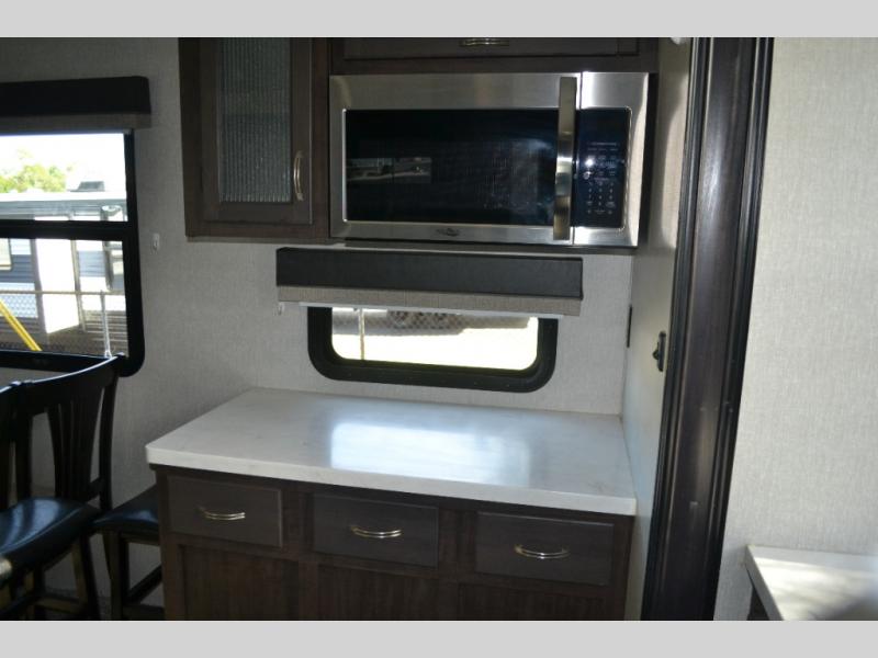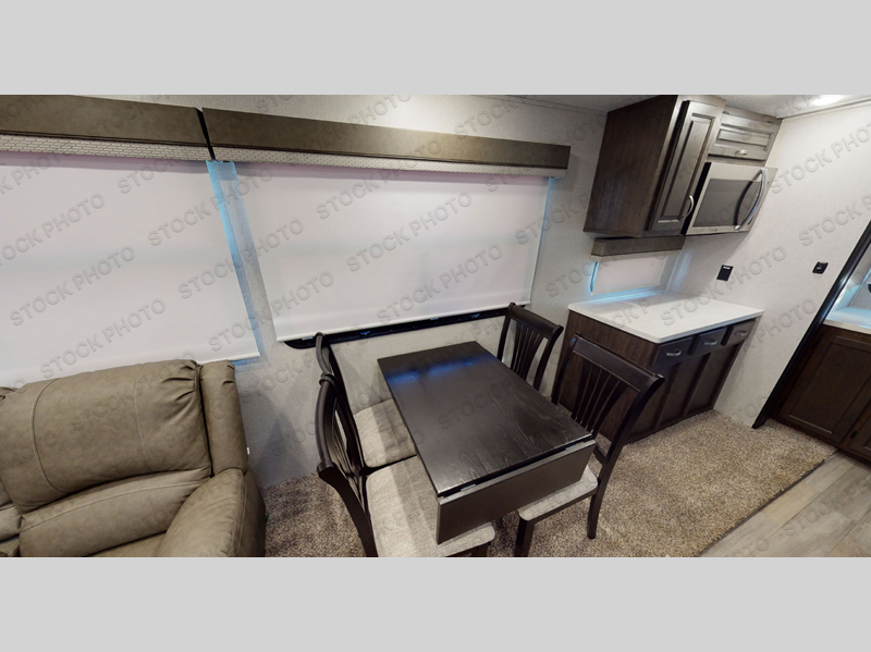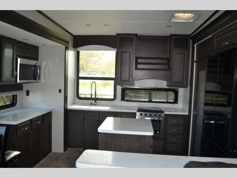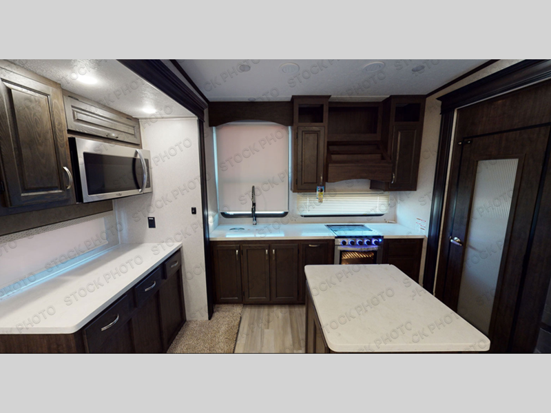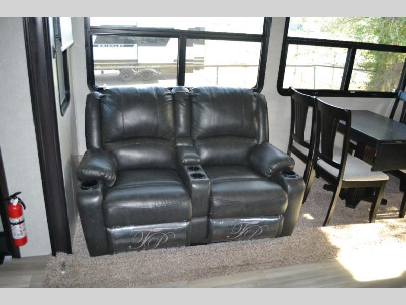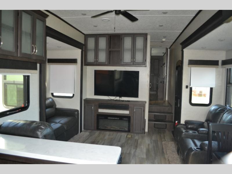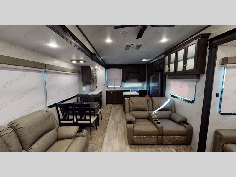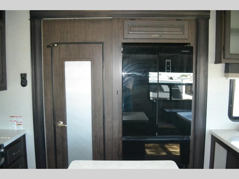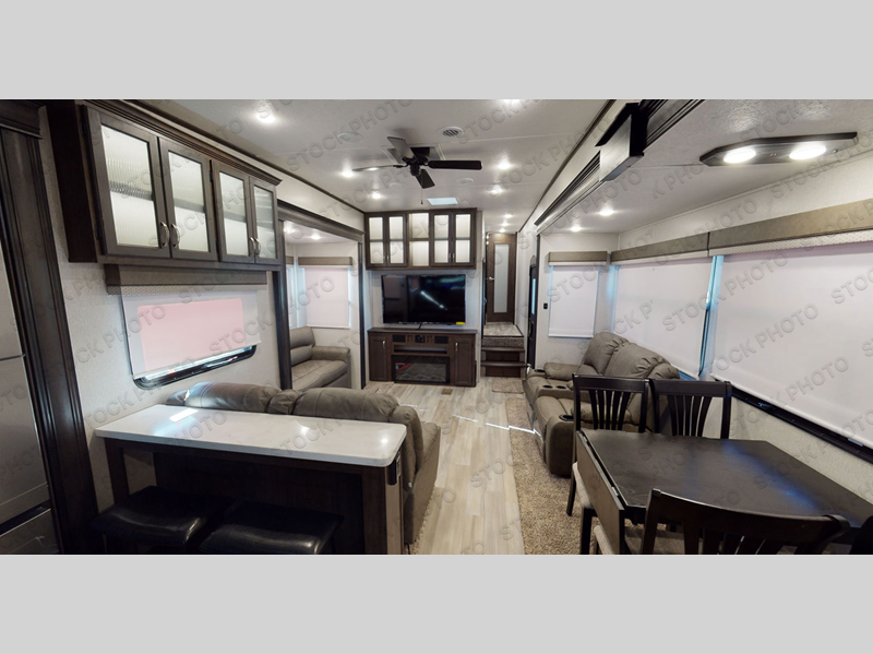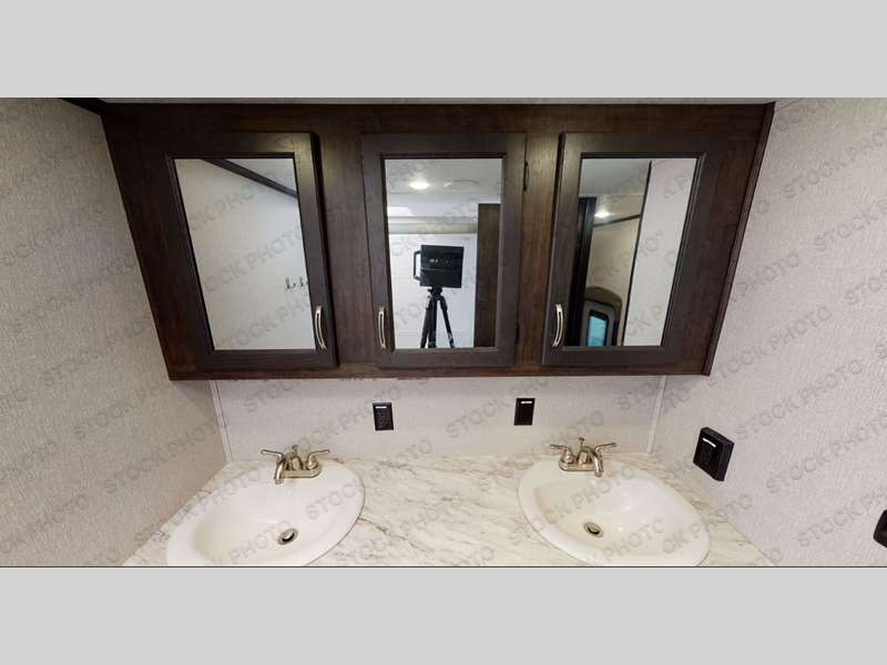 One look at this fifth wheel and you'll be sold. You'll find tons of counter space in the rear kitchen, along with a kitchen island, a large pantry, and a hutch for even more storage. Visit in the main living area on the two theater seats and tri-fold sofa, or you may want to head outdoors under the two power awnings! There is even an outside refrigerator here to entertain guests. The spacious full bath will allow you to clean up after a day of adventuring, and here you'll find a full-size shower with sliding glass doors and a seat, plus a dual sink vanity. The front private bedroom will feel just like home with its queen bed slide out, large wardrobe, and dresser to keep your clothes tidy.