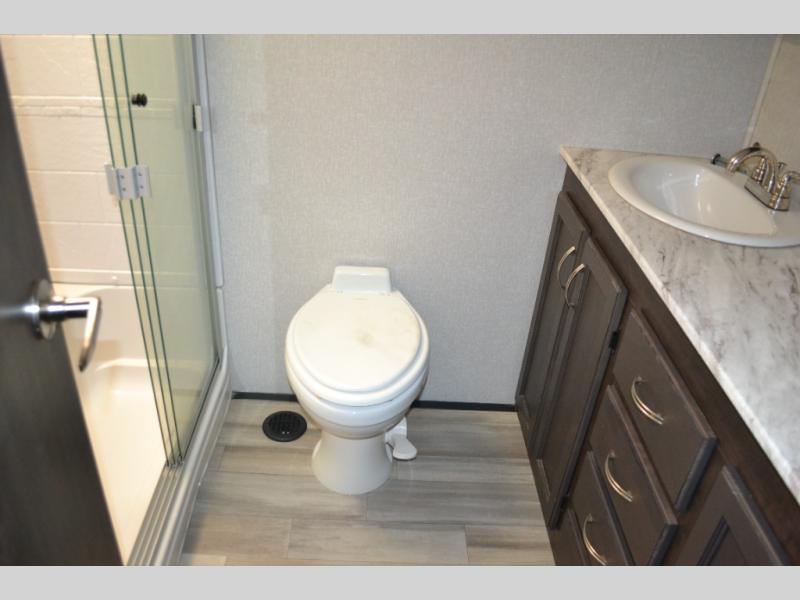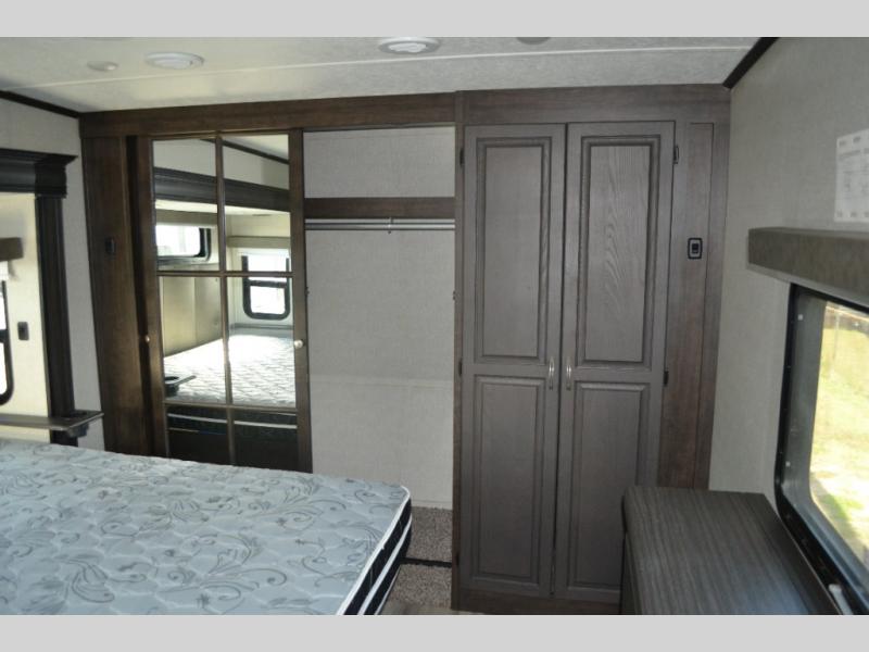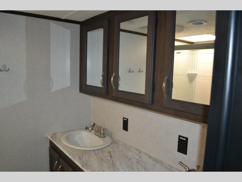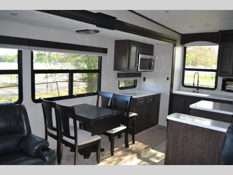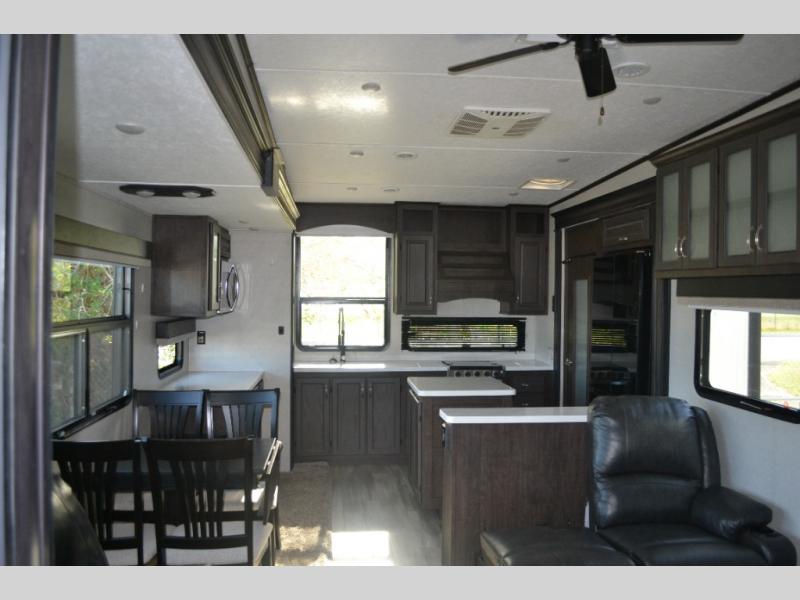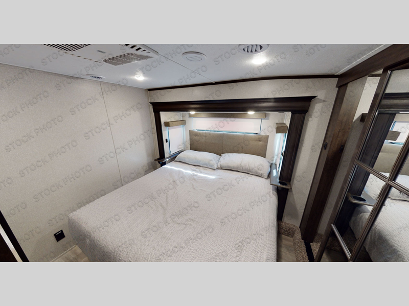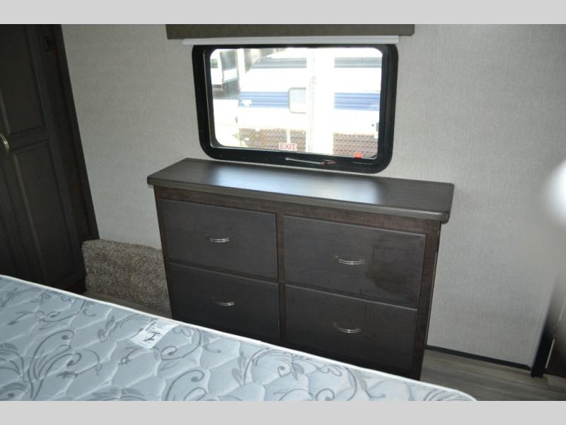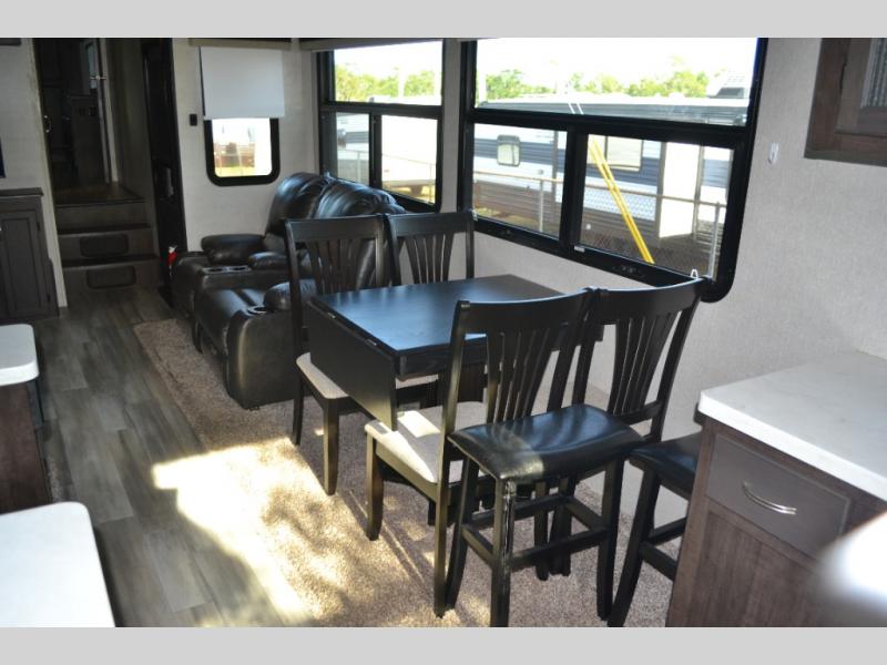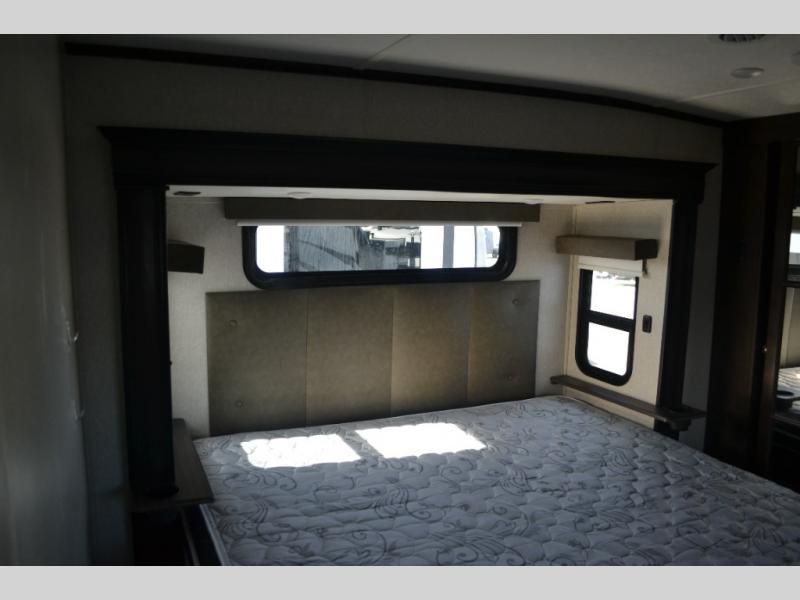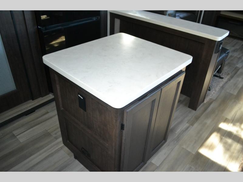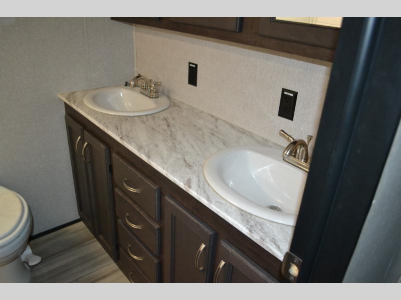 One look at this fifth wheel and you'll be sold. You'll find tons of counter space in the rear kitchen, along with a kitchen island, a large pantry, and a hutch for even more storage. Visit in the main living area on the two theater seats and tri-fold sofa, or you may want to head outdoors under the two power awnings! There is even an outside refrigerator here to entertain guests. The spacious full bath will allow you to clean up after a day of adventuring, and here you'll find a full-size shower with sliding glass doors and a seat, plus a dual sink vanity. The front private bedroom will feel just like home with its queen bed slide out, large wardrobe, and dresser to keep your clothes tidy.