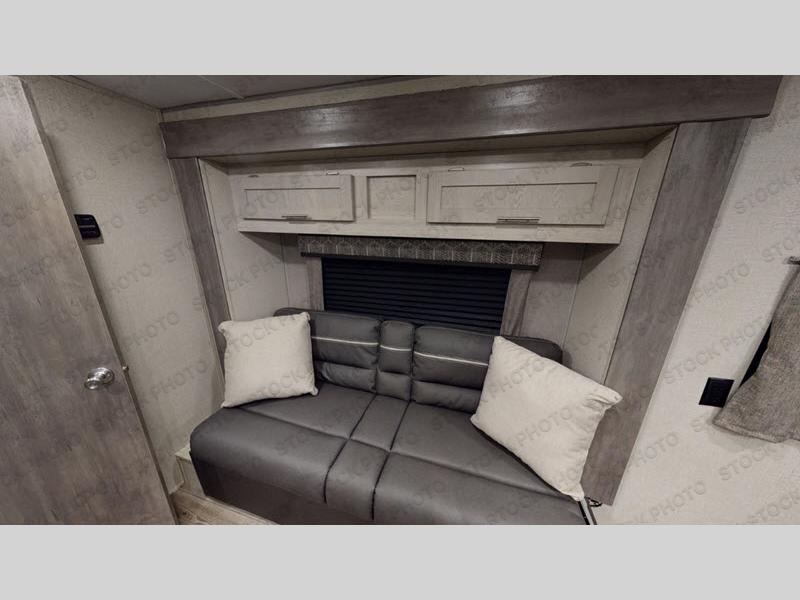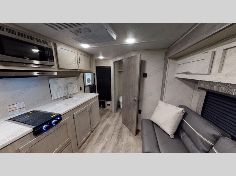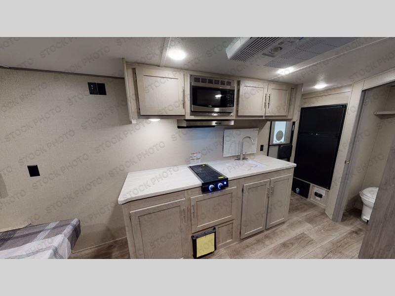 When you're ready to escape the hustle and bustle of the city life, head to the woods in this cozy travel trailer for two. The sofa slide out with a table will provide a place to relax, eat, and even sleep an overnight guest. Preparing at-home meals each day will be a breeze with a two burner cooktop and a microwave oven, plus there is ample counter space for your work in the kitchen. The spacious full bath on board means you won't have to use the camp's facilities, and the front queen bed will make this model feel just like home. After dinner is cleaned up, head outdoors to relax under the 15' electric awning with multicolored LED lights and a remote. Camping has never been easier!