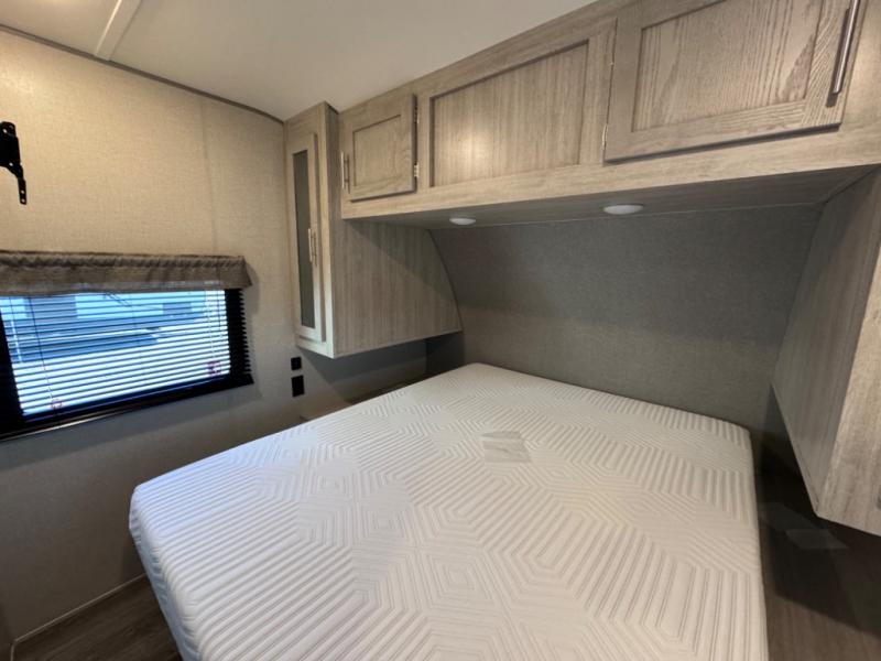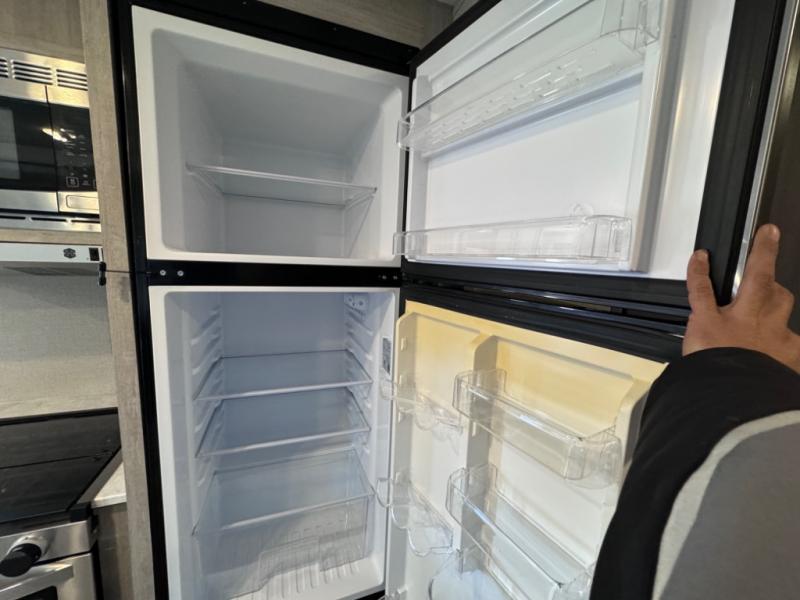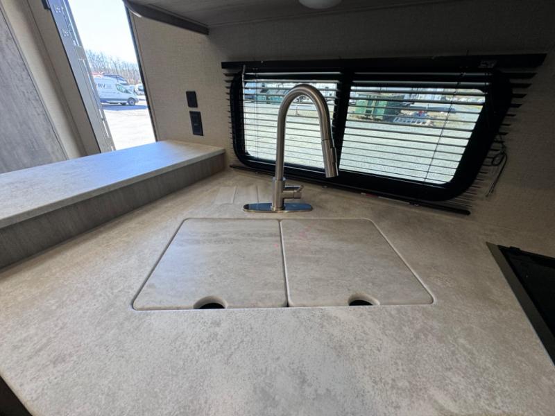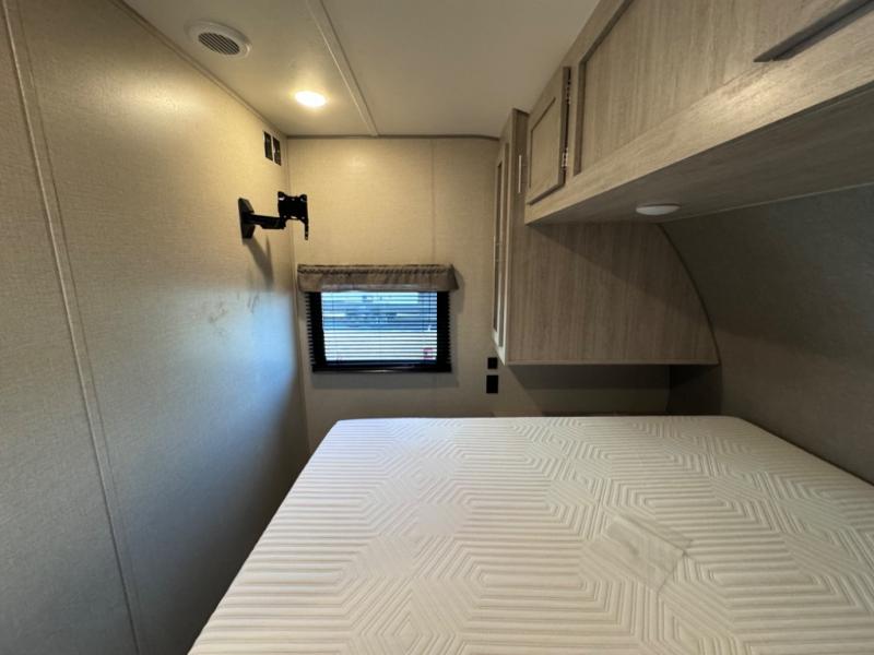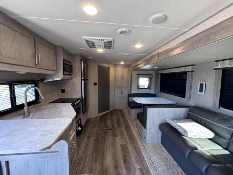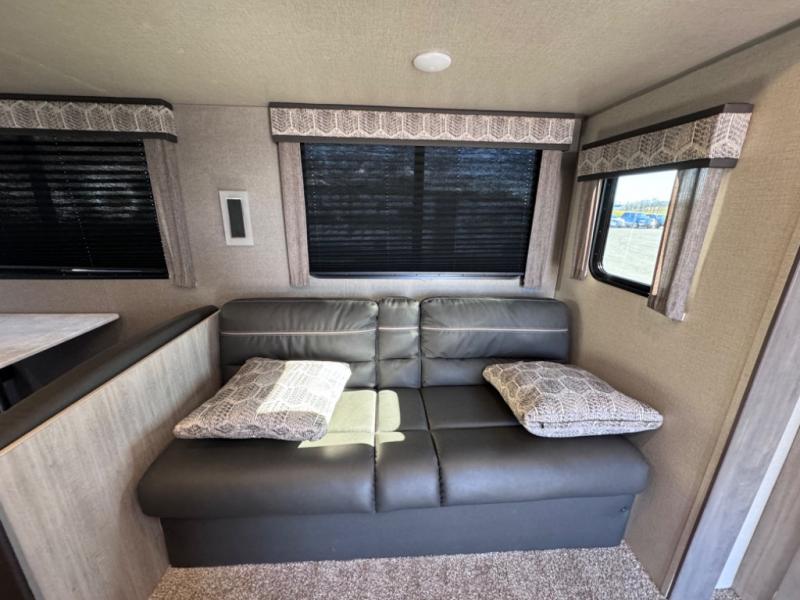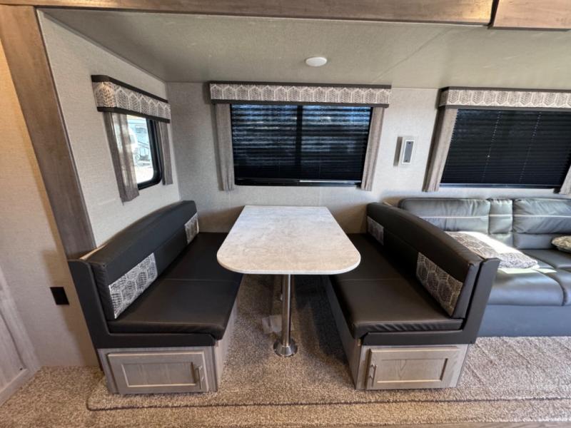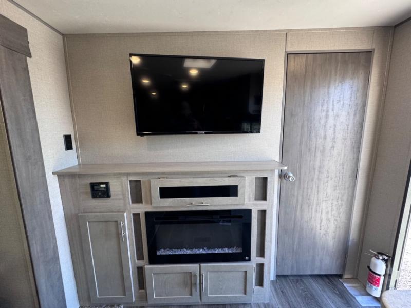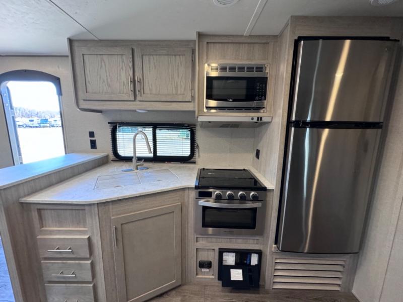 This half-ton friendly trailer is easy to pull and park, and is spacious thanks to the large slide out in the main living and kitchen area! You can dine at the booth dinette or choose the free standing dinette option, and the sofa offers drink holders for when you are relaxing and watching the entertainment center with optional fireplace below. The rear corner offers a full bathroom, and a large wardrobe/pantry for the storage you need. The galley kitchen offers full amenities plus a breakfast bar with optional stools. And the 15' awning provides protection from the elements plus has the choice of multiple LED colors with the use of the remote.