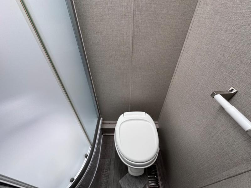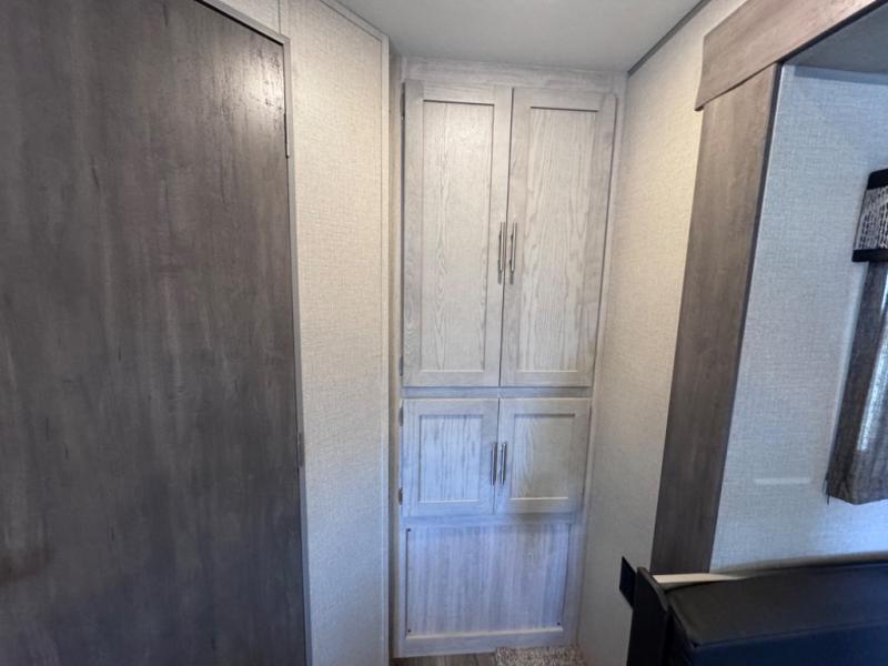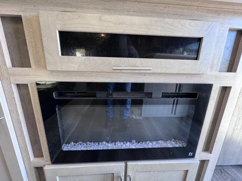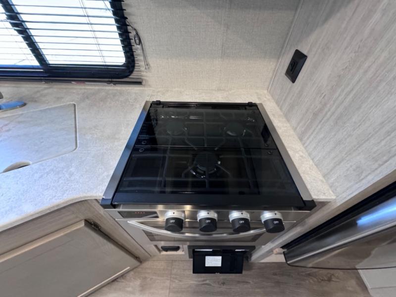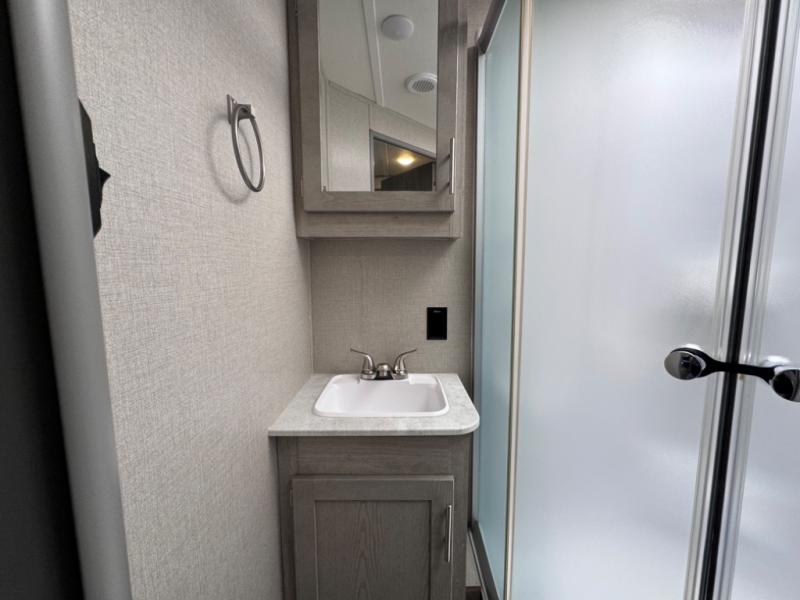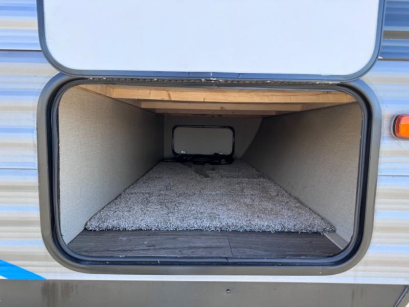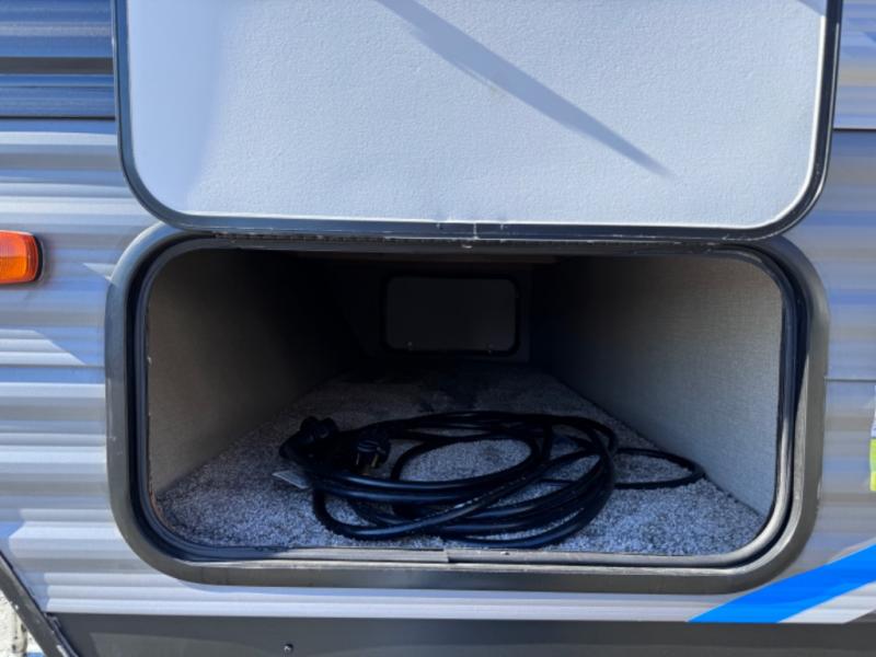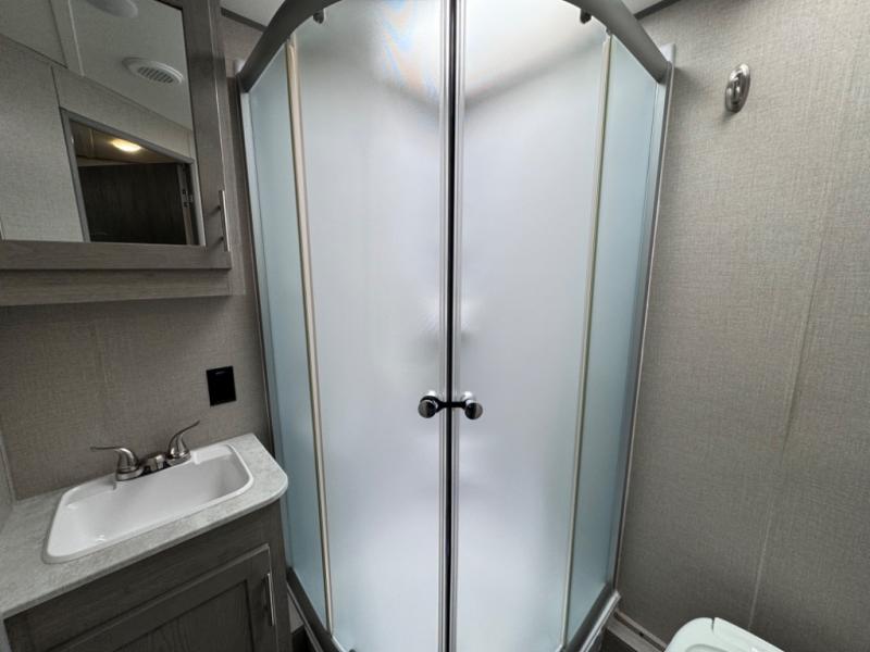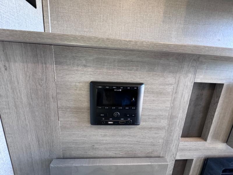 This half-ton friendly trailer is easy to pull and park, and is spacious thanks to the large slide out in the main living and kitchen area! You can dine at the booth dinette or choose the free standing dinette option, and the sofa offers drink holders for when you are relaxing and watching the entertainment center with optional fireplace below. The rear corner offers a full bathroom, and a large wardrobe/pantry for the storage you need. The galley kitchen offers full amenities plus a breakfast bar with optional stools. And the 15' awning provides protection from the elements plus has the choice of multiple LED colors with the use of the remote.
