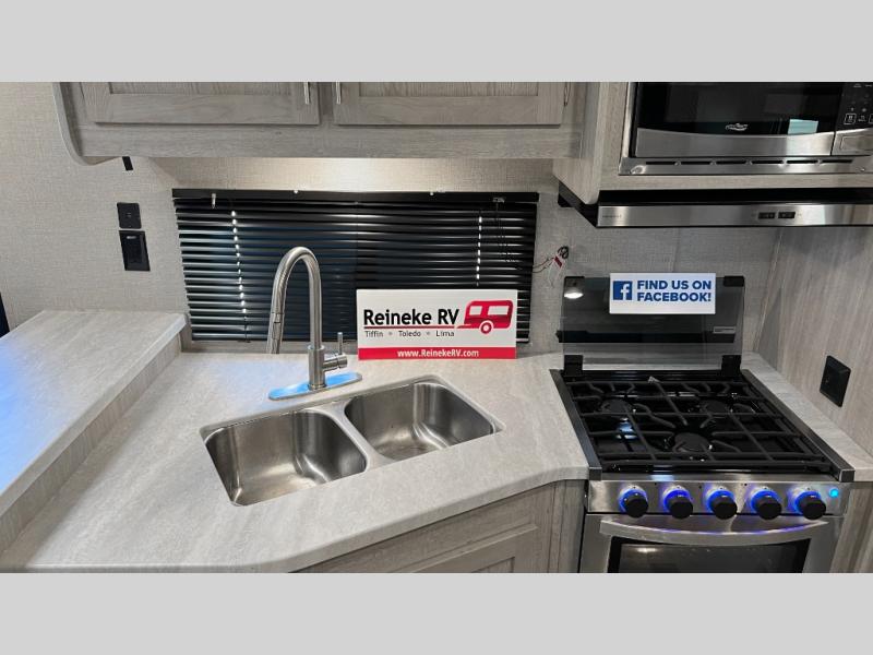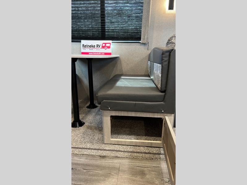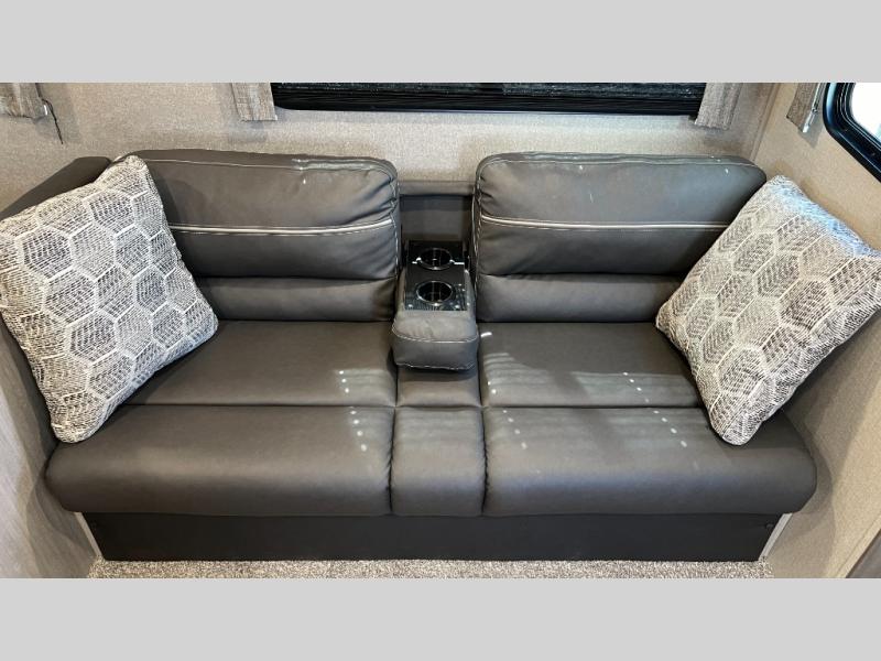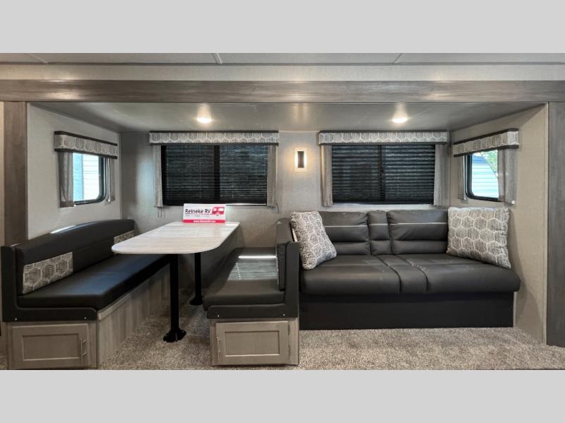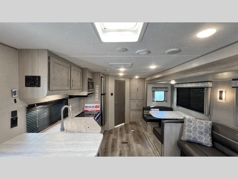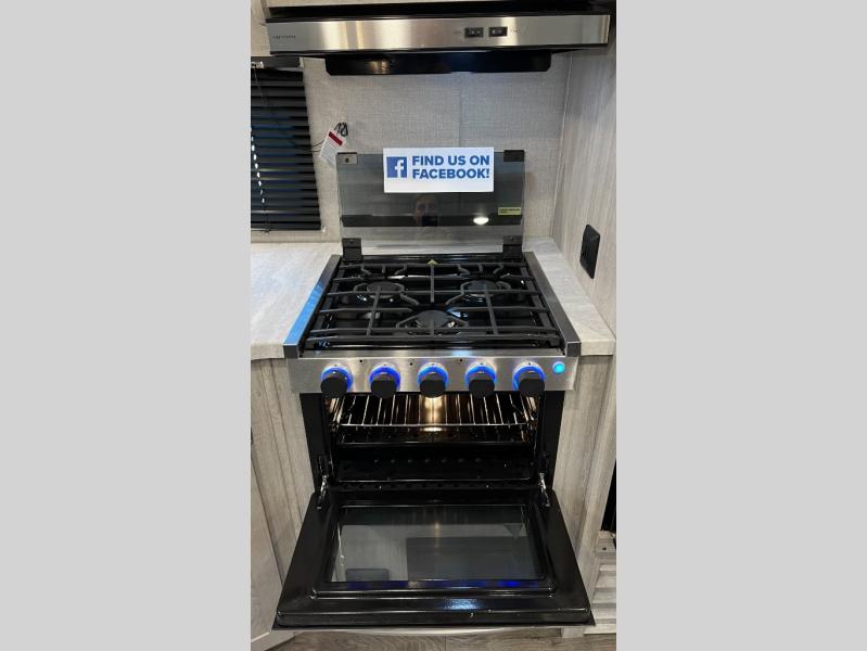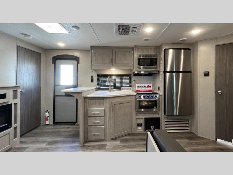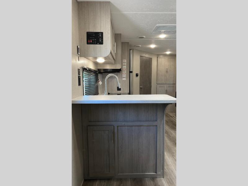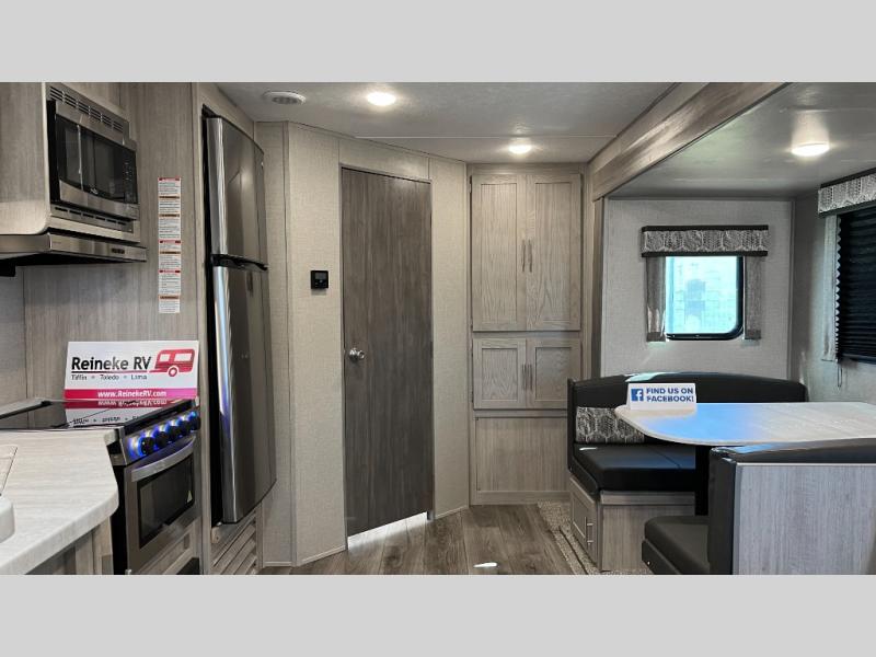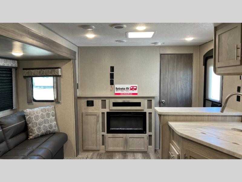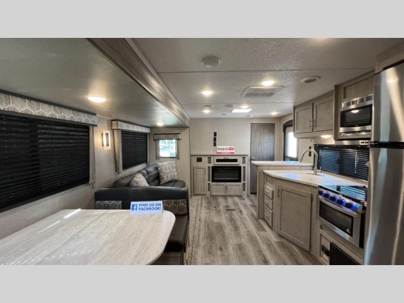 This half-ton friendly trailer is easy to pull and park, and is spacious thanks to the large slide out in the main living and kitchen area! You can dine at the booth dinette and the sofa offers drink holders for when you are relaxing and watching the entertainment center with fireplace below. The rear corner offers a full bathroom, and a large wardrobe/pantry for the storage you need. The galley kitchen offers full amenities plus a breakfast bar. And the 15' awning provides protection from the elements plus has the choice of multiple LED colors with the use of the remote.
