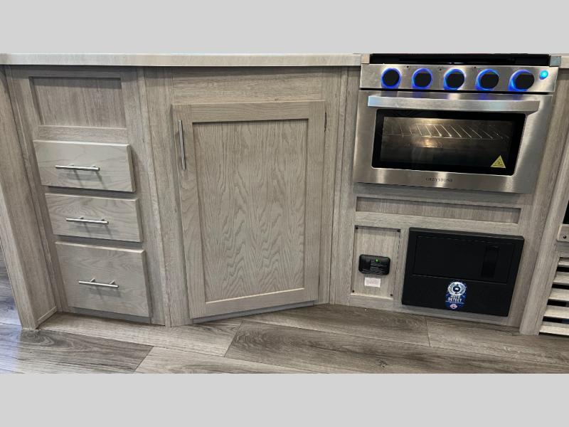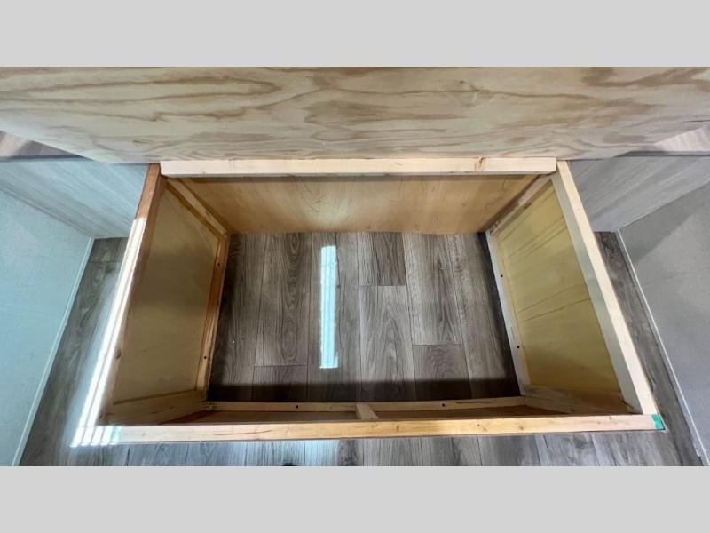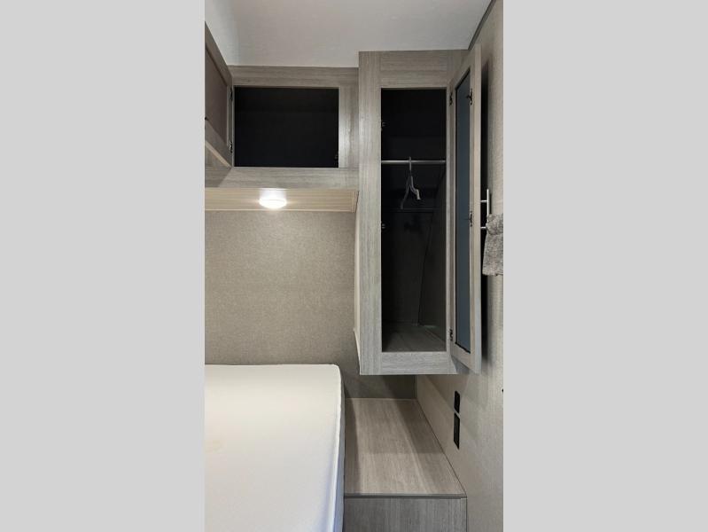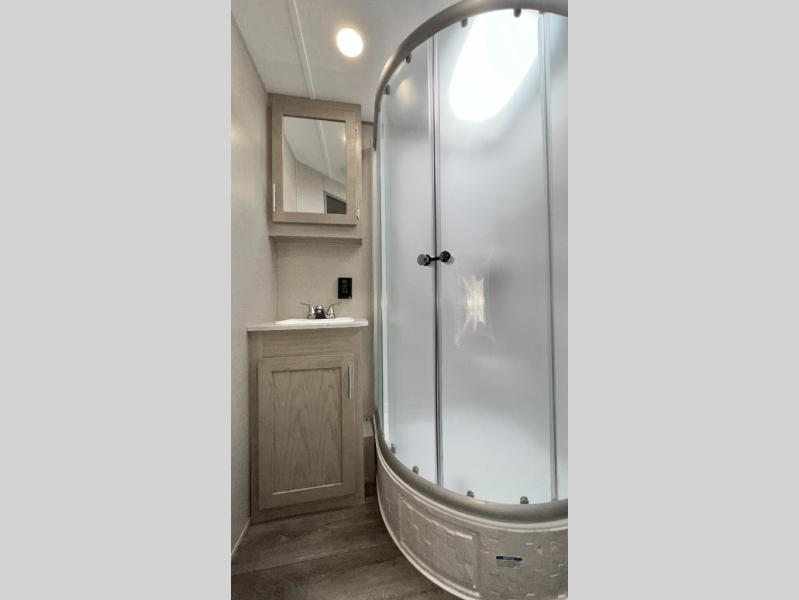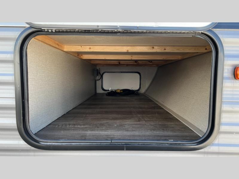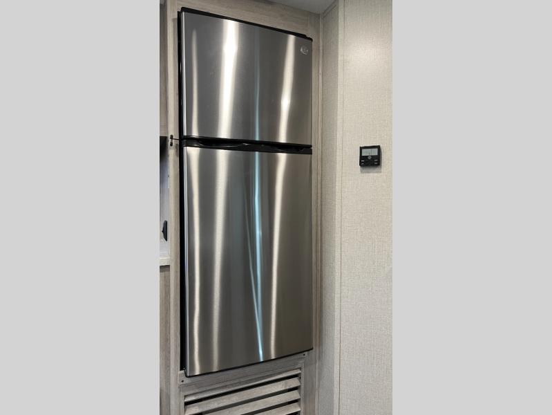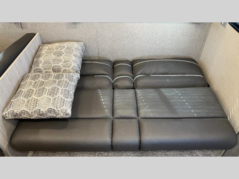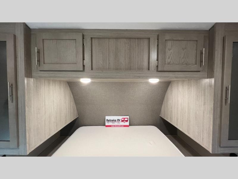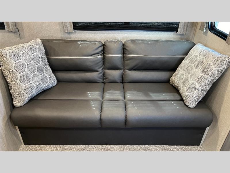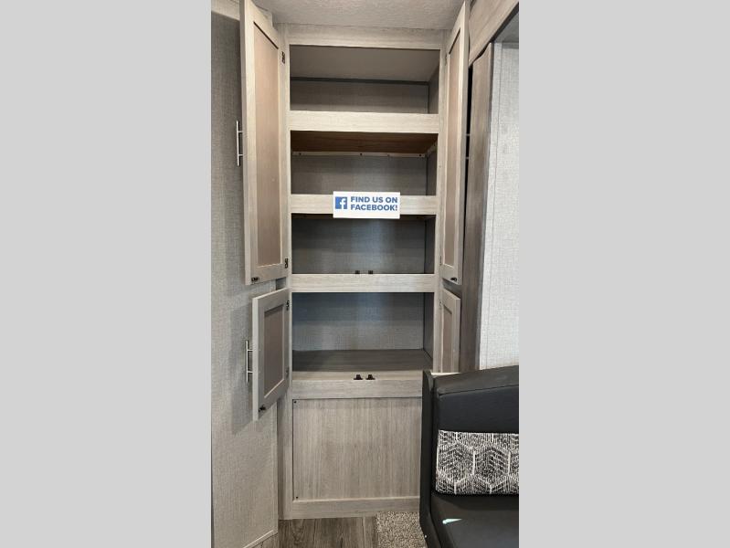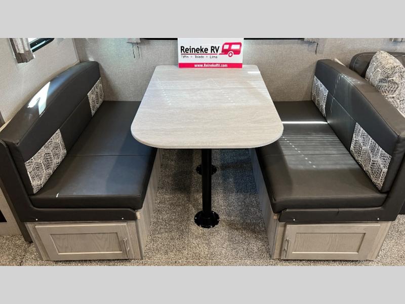 This half-ton friendly trailer is easy to pull and park, and is spacious thanks to the large slide out in the main living and kitchen area! You can dine at the booth dinette and the sofa offers drink holders for when you are relaxing and watching the entertainment center with fireplace below. The rear corner offers a full bathroom, and a large wardrobe/pantry for the storage you need. The galley kitchen offers full amenities plus a breakfast bar. And the 15' awning provides protection from the elements plus has the choice of multiple LED colors with the use of the remote.