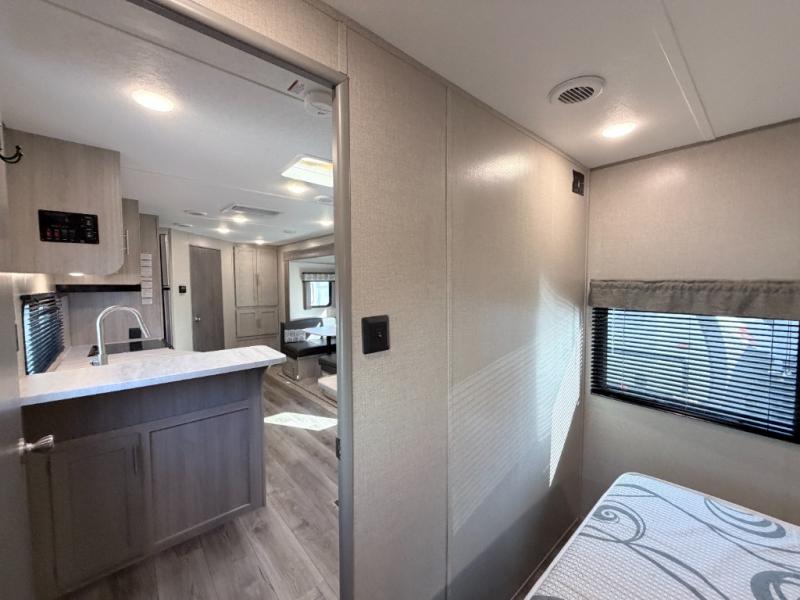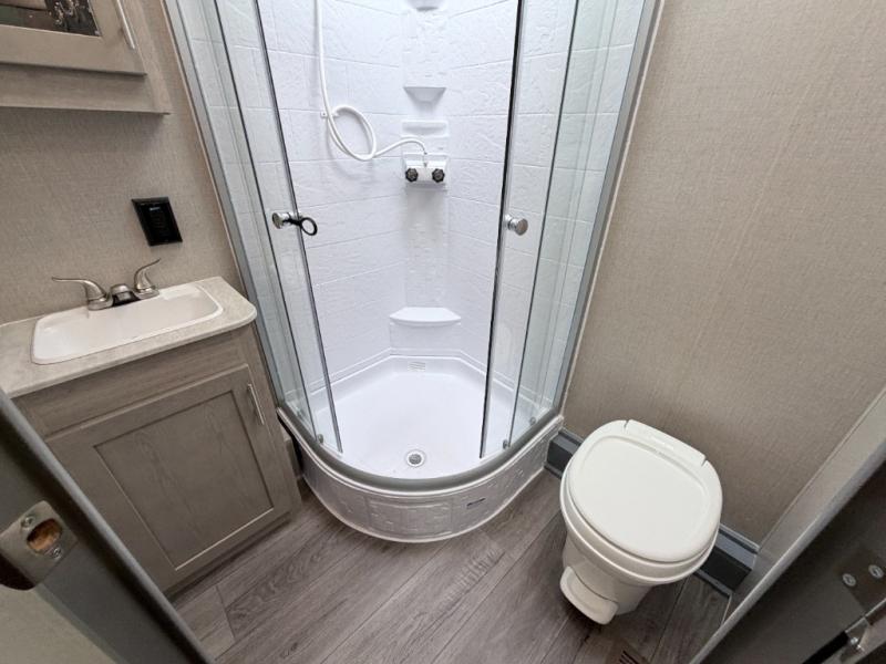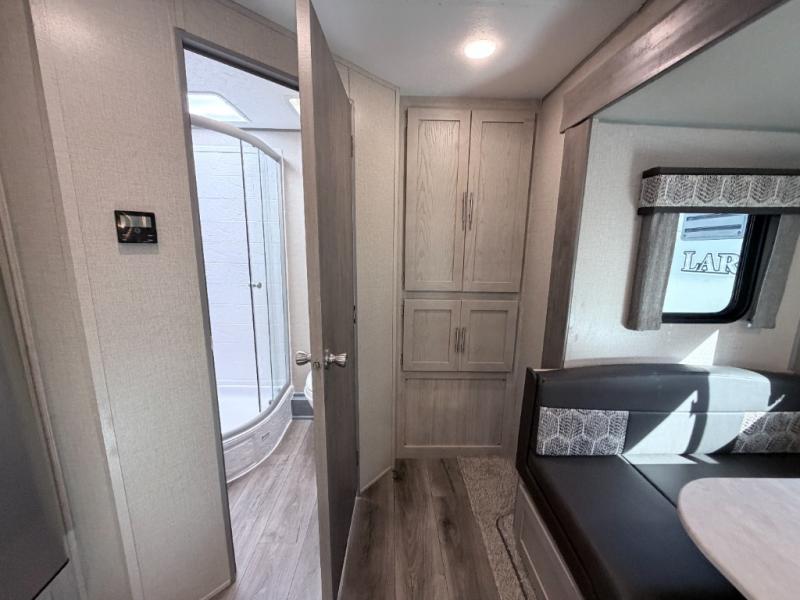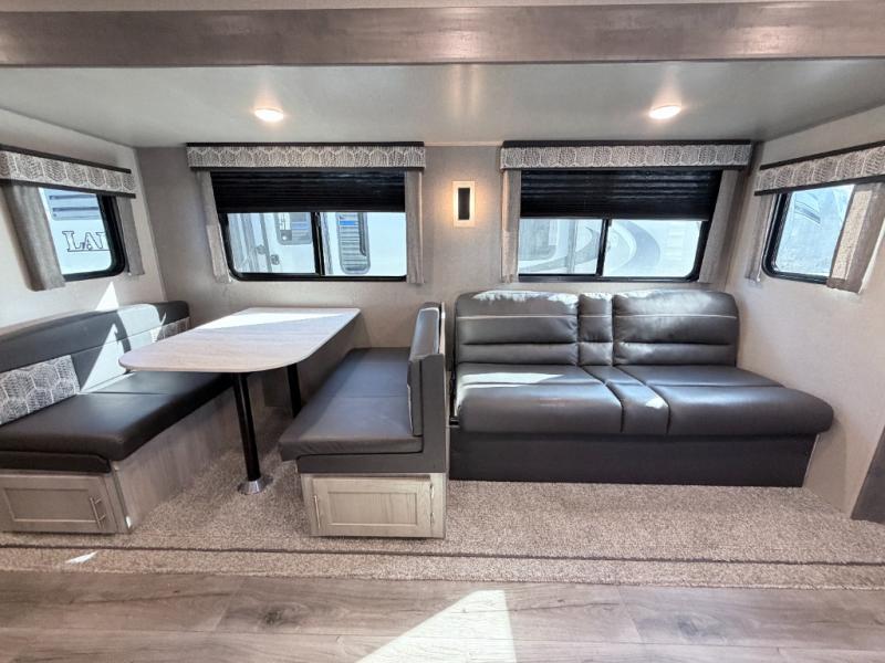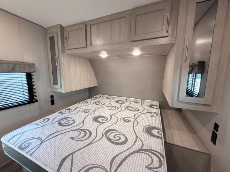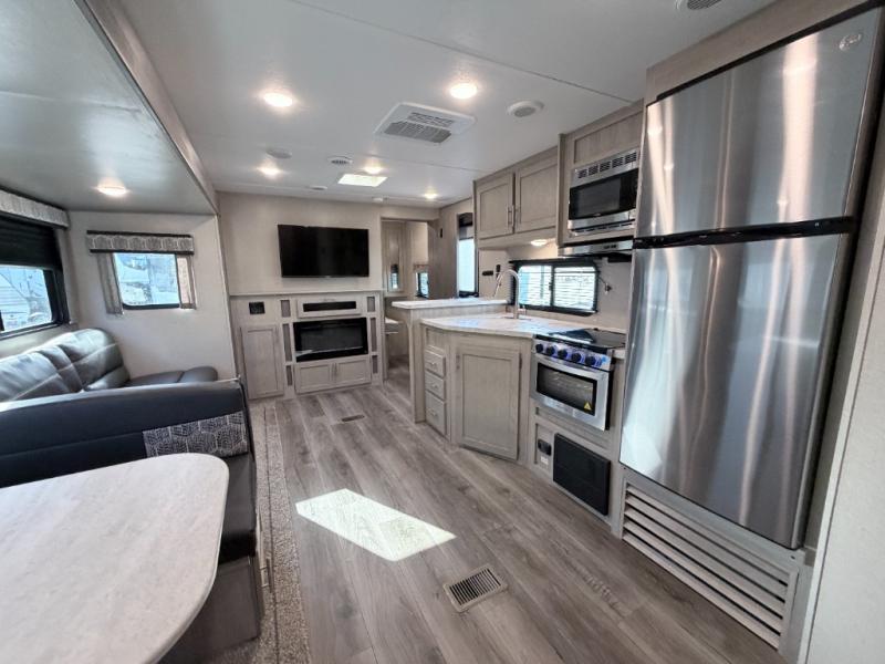 This half-ton friendly trailer is easy to pull, easy to park, and impressively spacious thanks to the large slide-out in the main living and kitchen area! Dine at the booth dinette—or opt for the free-standing dinette—and relax on the sofa with built-in drink holders while watching the entertainment center with an optional fireplace below. A full rear corner bathroom provides convenience, while the large wardrobe/pantry gives you all the storage space you need.