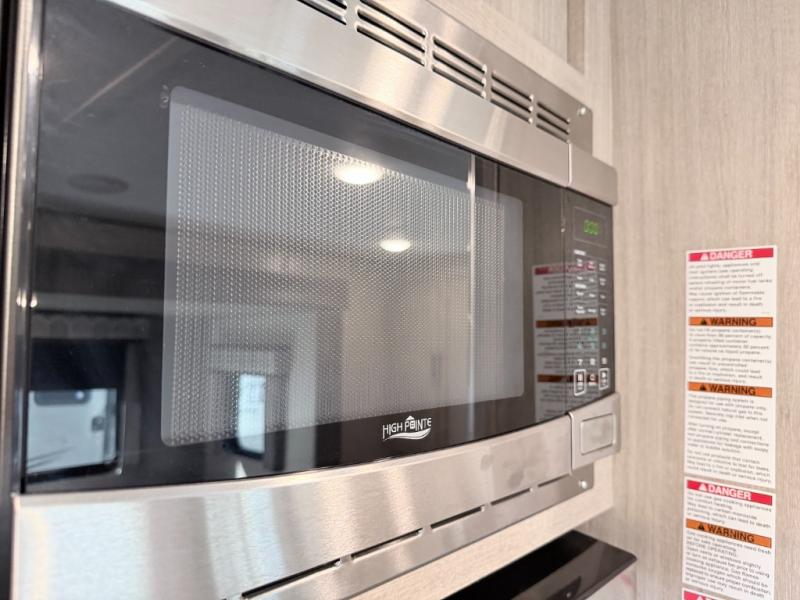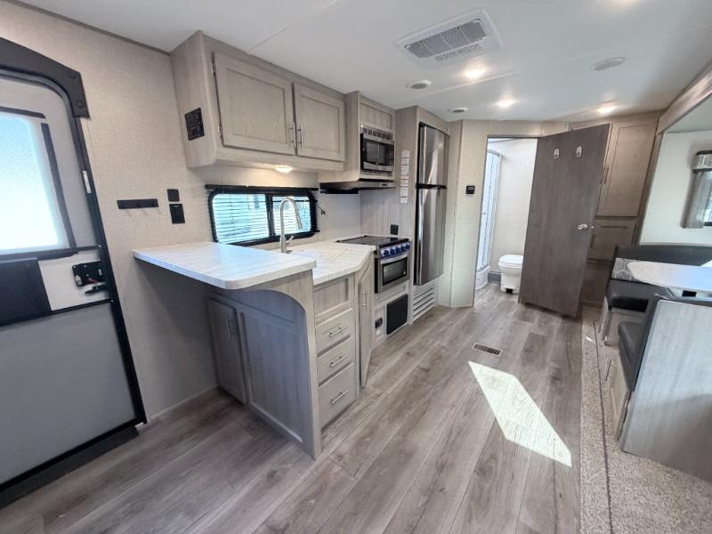 The galley kitchen includes full amenities, plus a breakfast bar with optional stools for added seating. Step outside and enjoy shade and atmosphere under the 15' power awning, complete with remote-controlled LED lighting in multiple color options for the perfect campsite vibe.