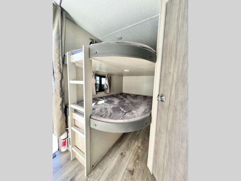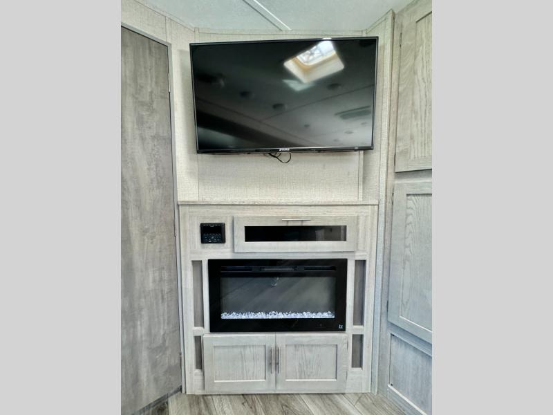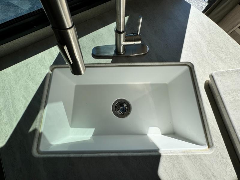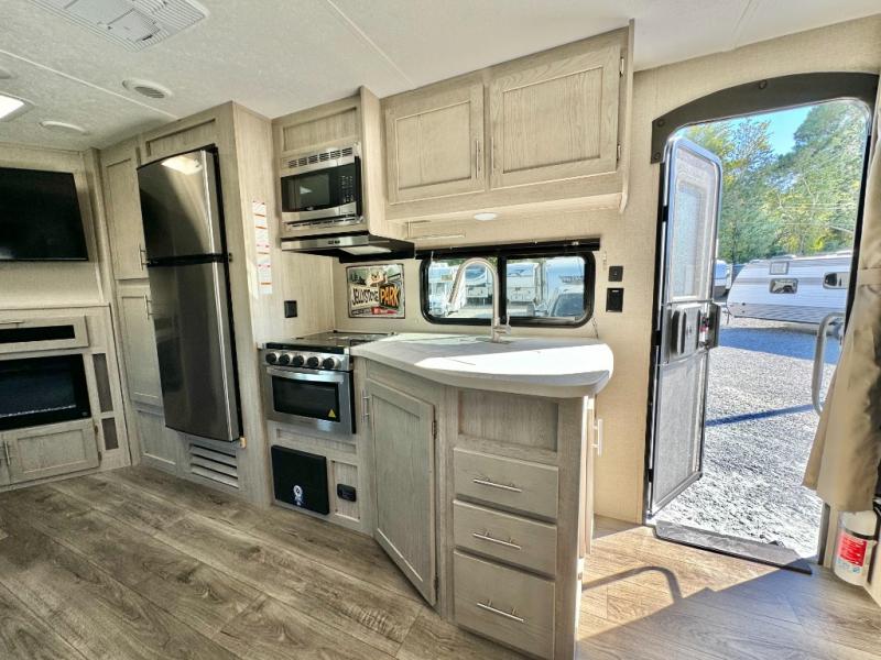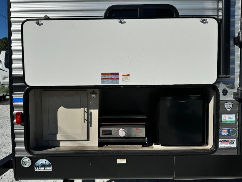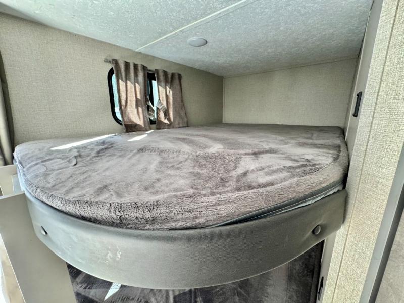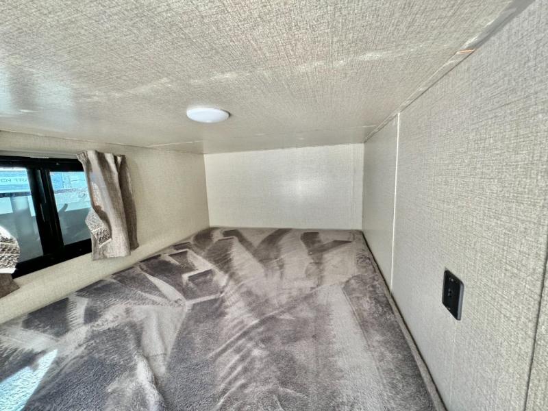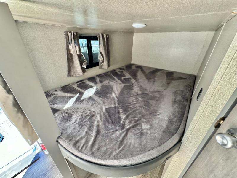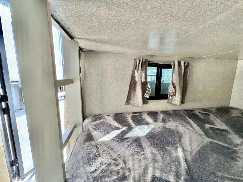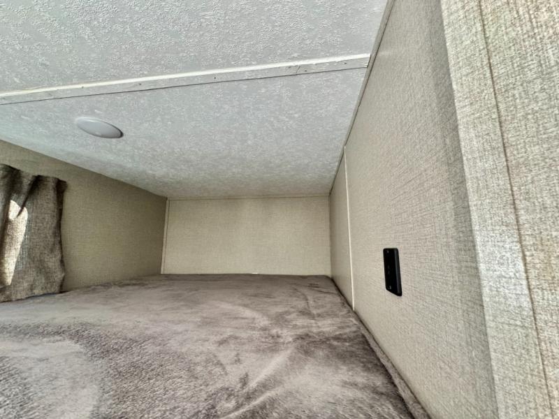 When you enjoy camping with your own accommodations and space for the whole crew, hitch this trailer up and head to the campgrounds! After loading everything easily thanks to the dual entry doors and all the interior and exterior storage, you will have no worries that you left anything behind. The electric awning is easy to setup like the large slide out, and the awning offers multicolor LED lights to choose from by using the remote. When you are outside the cook might like to make a meal using the outside camper kitchen. The interior kitchen offers full amenities including a pantry, and everyone can watch the 39" TV on the angled entertainment center. There are double-size bunks with a ladder for the kids and a walk-around queen for the owner to sleep on, as well as the furniture doubles as extra sleeping space.