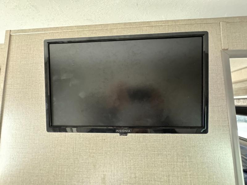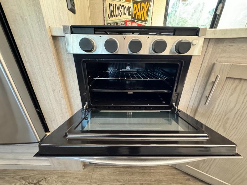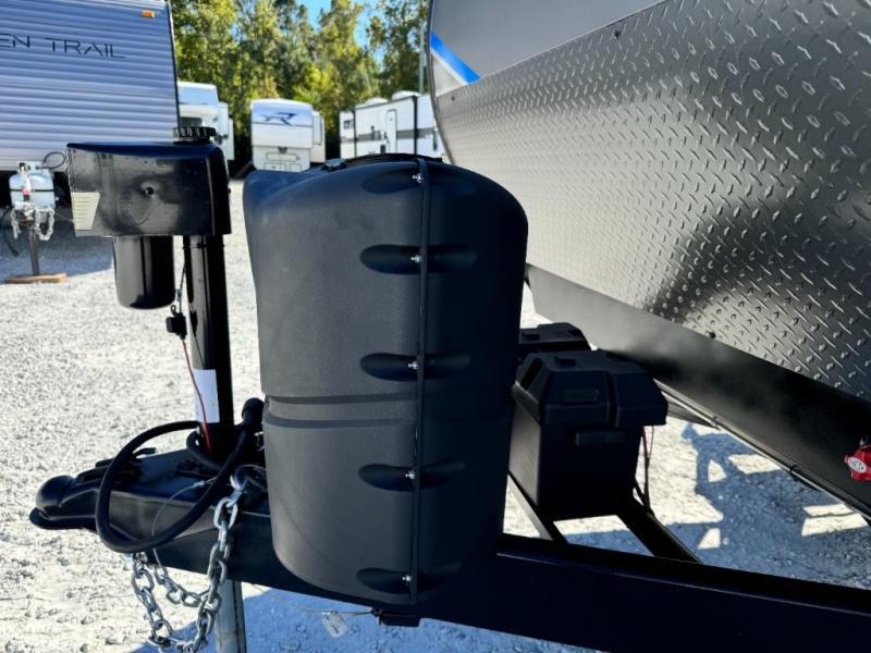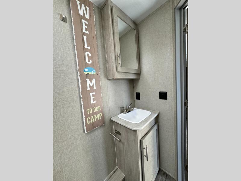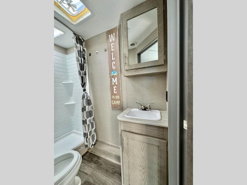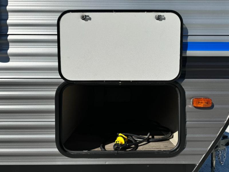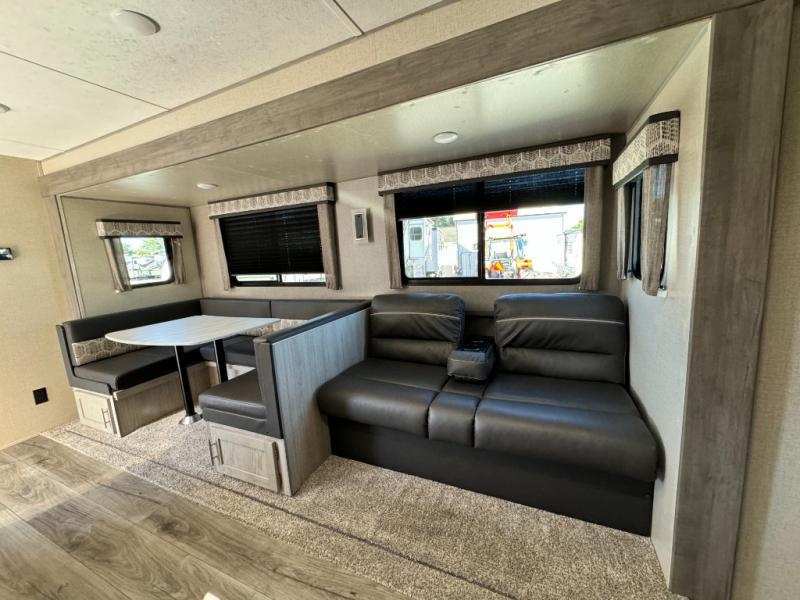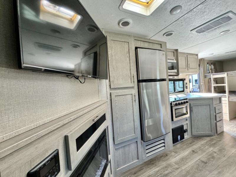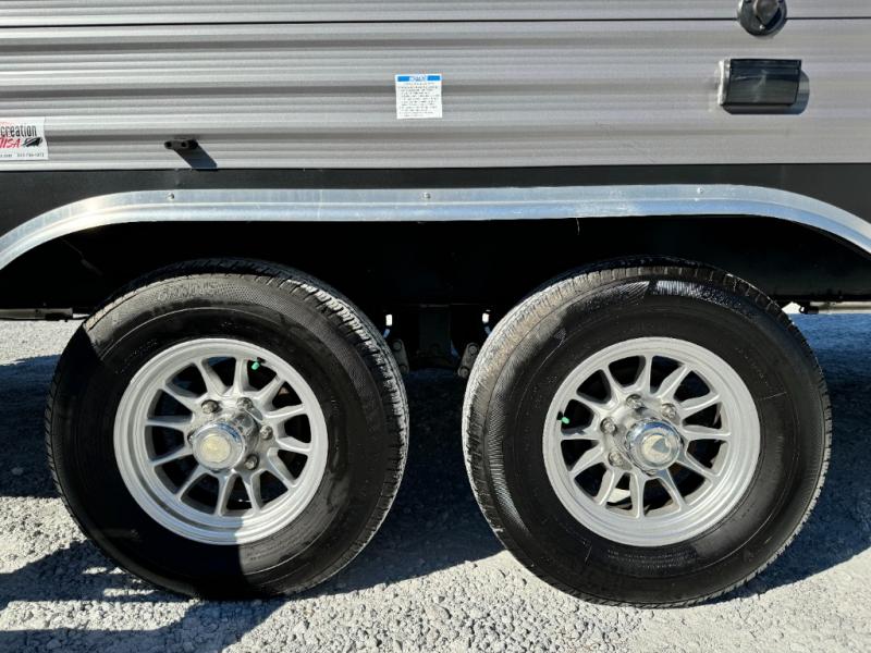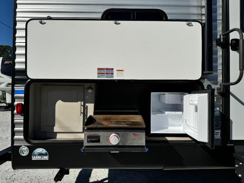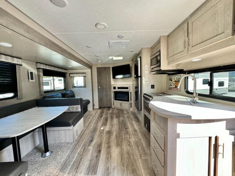 When you enjoy camping with your own accommodations and space for the whole crew, hitch this trailer up and head to the campgrounds! After loading everything easily thanks to the dual entry doors and all the interior and exterior storage, you will have no worries that you left anything behind. The electric awning is easy to setup like the large slide out, and the awning offers multicolor LED lights to choose from by using the remote. When you are outside the cook might like to make a meal using the outside camper kitchen. The interior kitchen offers full amenities including a pantry, and everyone can watch the 39" TV on the angled entertainment center. There are double-size bunks with a ladder for the kids and a walk-around queen for the owner to sleep on, as well as the furniture doubles as extra sleeping space.