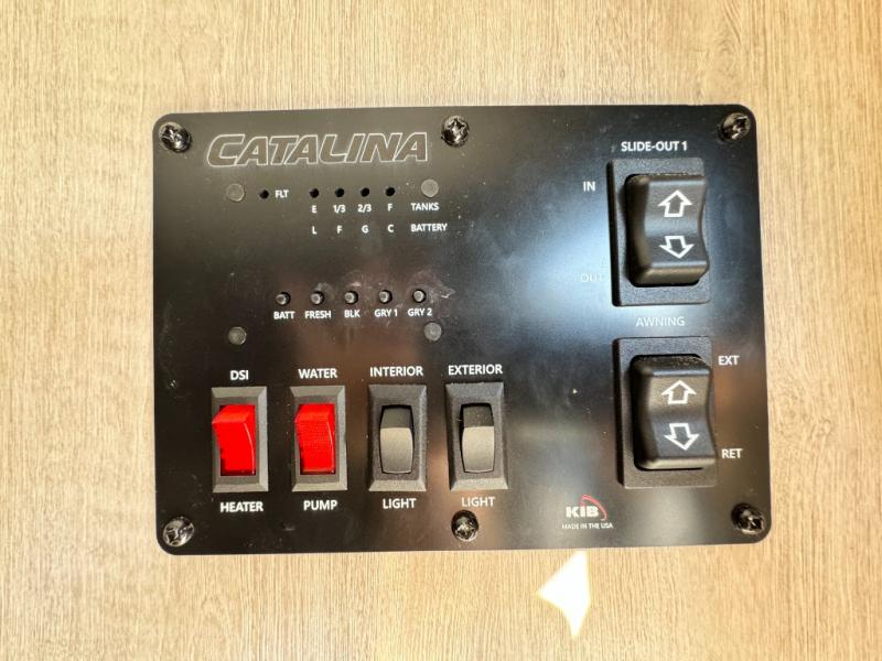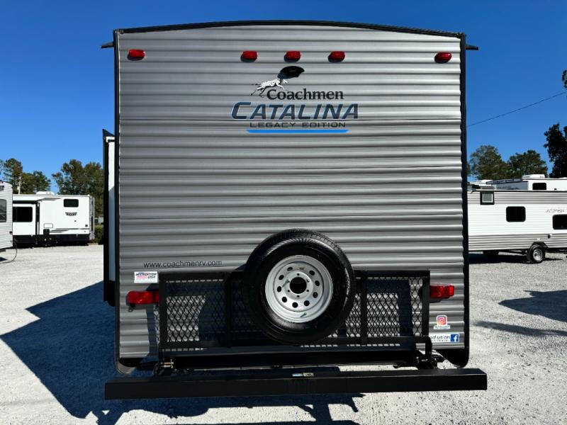 With any Catalina Legacy Edition travel trailer by Coachmen, there is an enclosed, fully sealed underbelly to protect against road debris and help control the interior climate, a seamless Alpha roof membrane, a platinum aluminum exterior, a smooth HD aluminum radius front, and polished HD aluminum fender skirts, plus upgraded aluminum wheels. The interior includes seamless Thermofoil countertops throughout, an under-mount farm style sink with residential kitchen faucet with pull down sprayer to easily clean the fruits and veggies as well as the dishes, full length kitchen drawer guides, and an All-In-One monitor panel system.