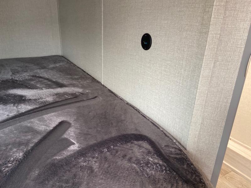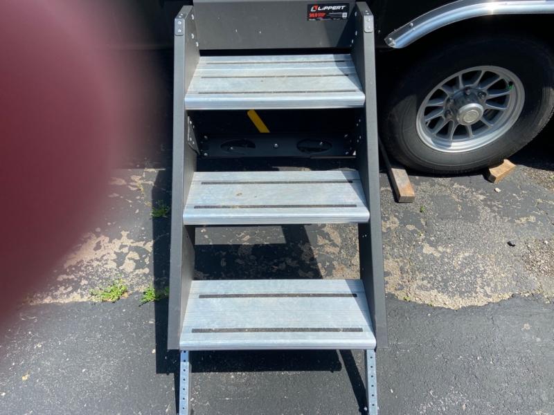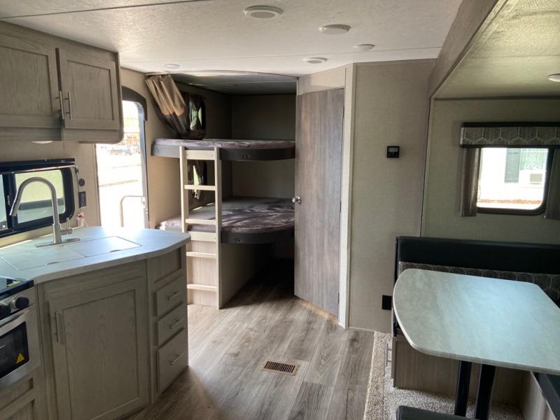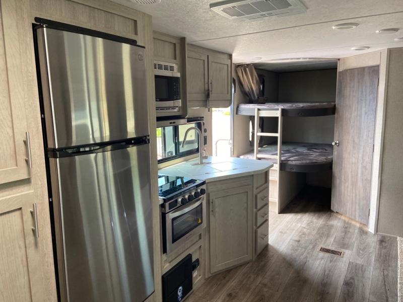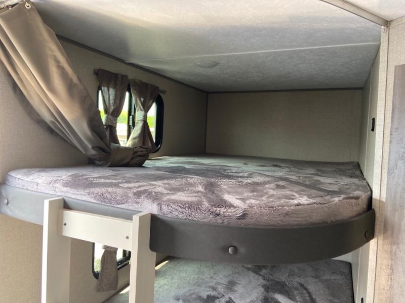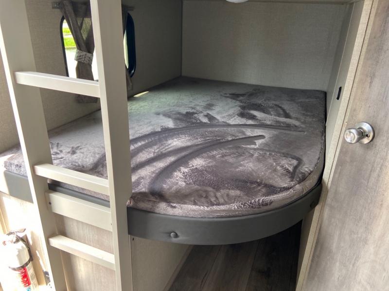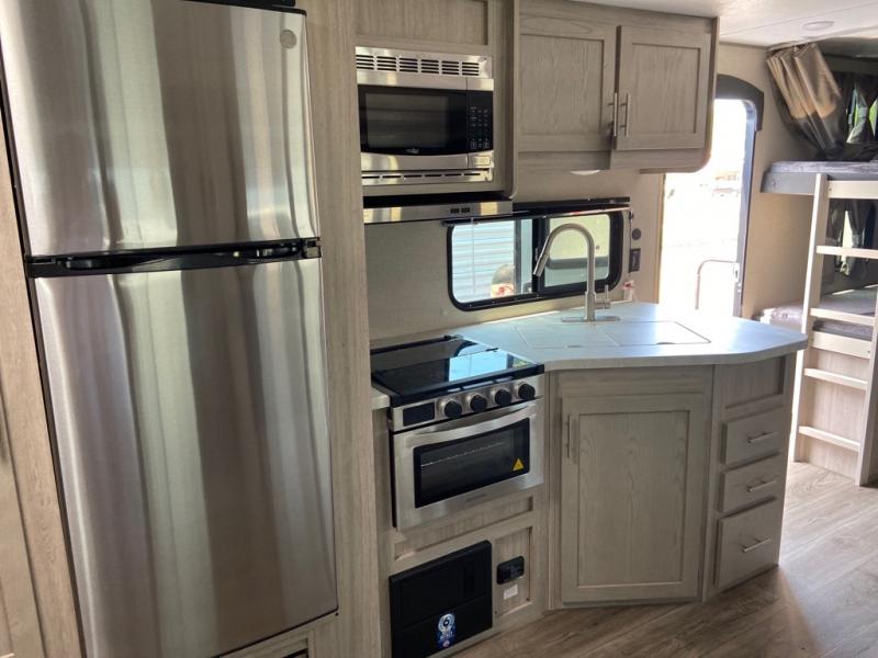 When you enjoy camping with your own accommodations and space for the whole crew, hitch this trailer up and head to the campgrounds! After loading everything easily thanks to the dual entry doors and all the interior and exterior storage, you will have no worries that you left anything behind. The electric awning is easy to setup like the large slide out, and the awning offers multicolor LED lights to choose from by using the remote. When you are outside the cook might like to make a meal using the outside camper kitchen. The interior kitchen offers full amenities including a pantry, and everyone can watch the 39" TV on the angled entertainment center. There are double-size bunks with a ladder for the kids and a walk-around queen for the owner to sleep on, as well as the furniture doubles as extra sleeping space.