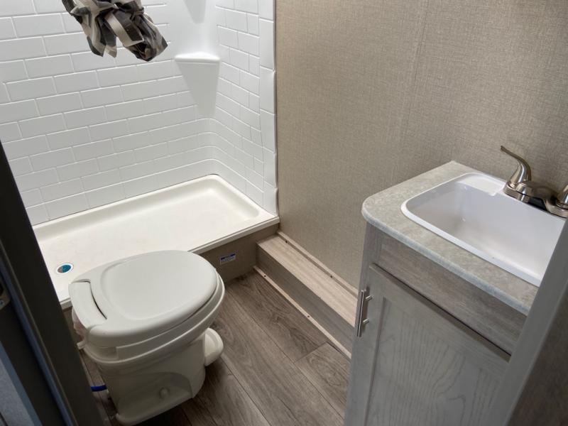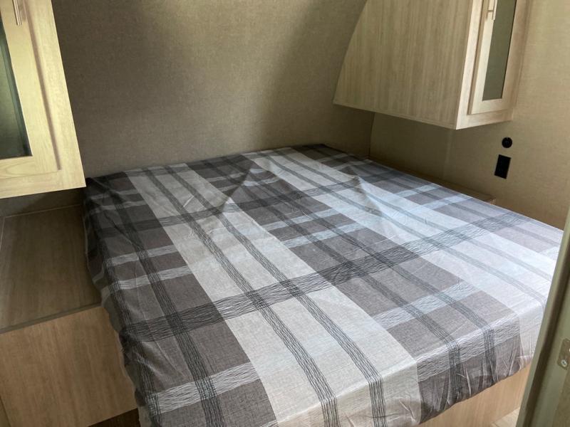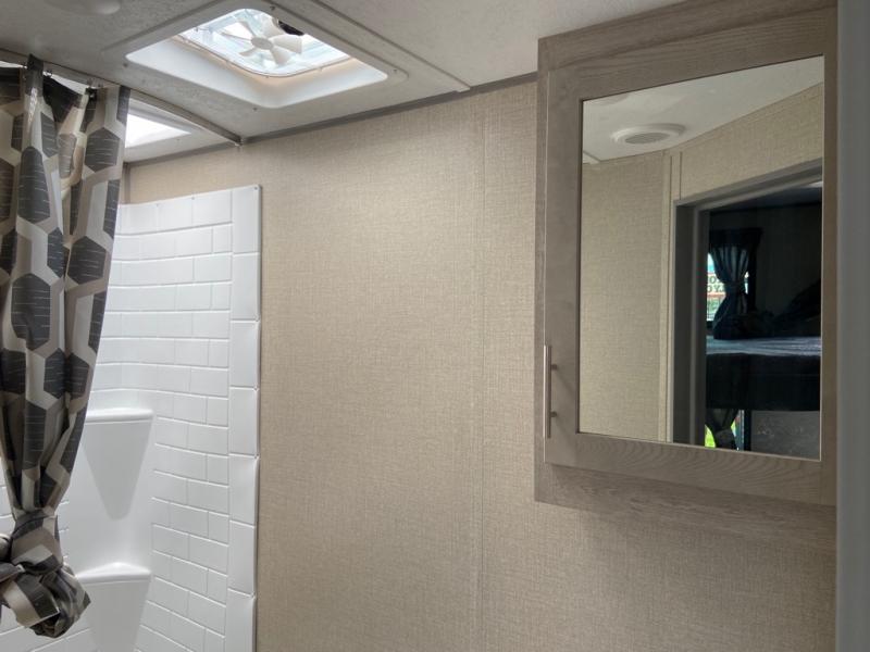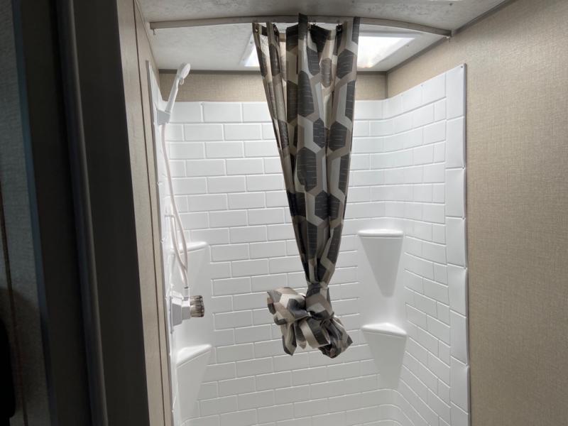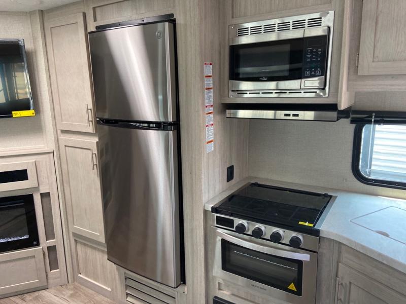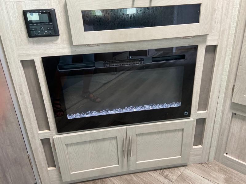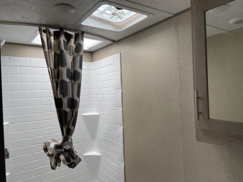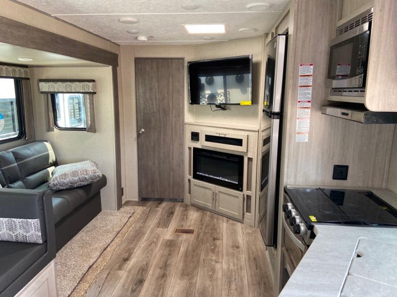 When you enjoy camping with your own accommodations and space for the whole crew, hitch this trailer up and head to the campgrounds! After loading everything easily thanks to the dual entry doors and all the interior and exterior storage, you will have no worries that you left anything behind. The electric awning is easy to setup like the large slide out, and the awning offers multicolor LED lights to choose from by using the remote. When you are outside the cook might like to make a meal using the outside camper kitchen. The interior kitchen offers full amenities including a pantry, and everyone can watch the 39" TV on the angled entertainment center. There are double-size bunks with a ladder for the kids and a walk-around queen for the owner to sleep on, as well as the furniture doubles as extra sleeping space.