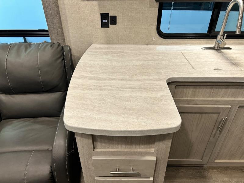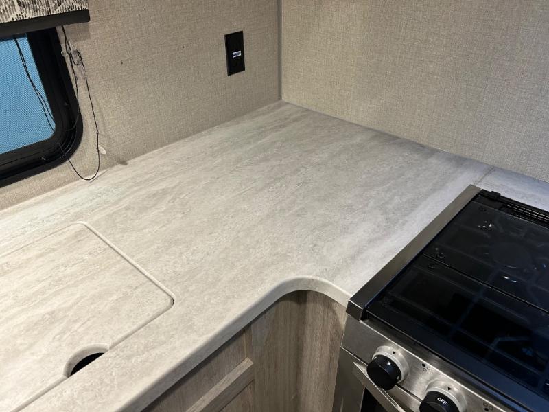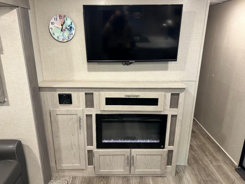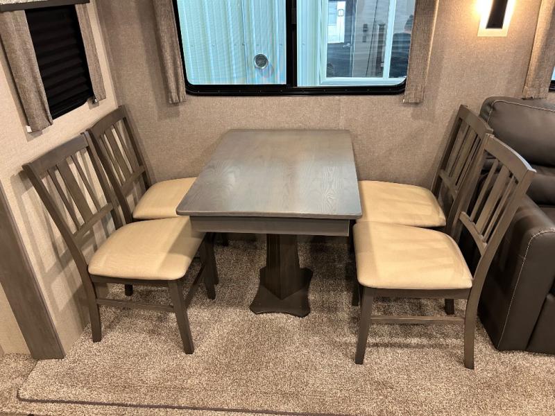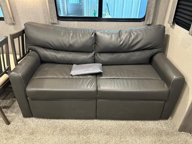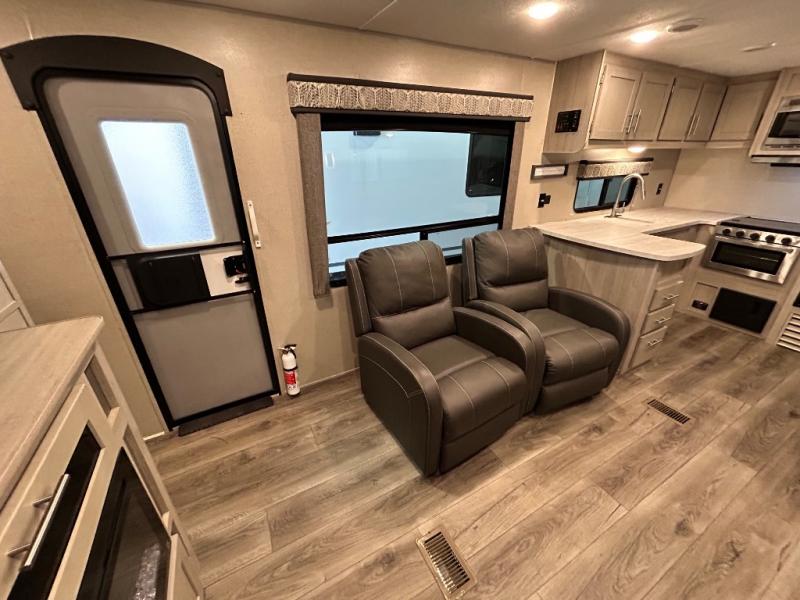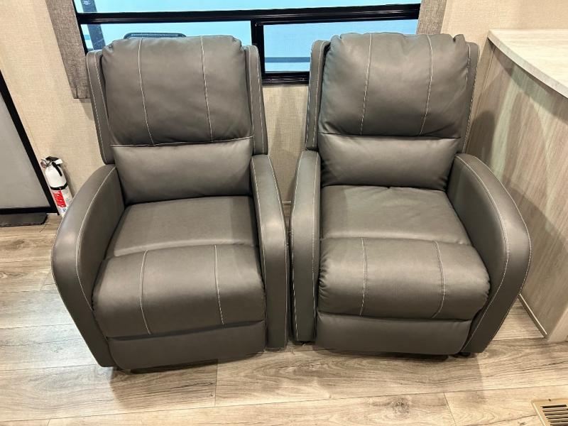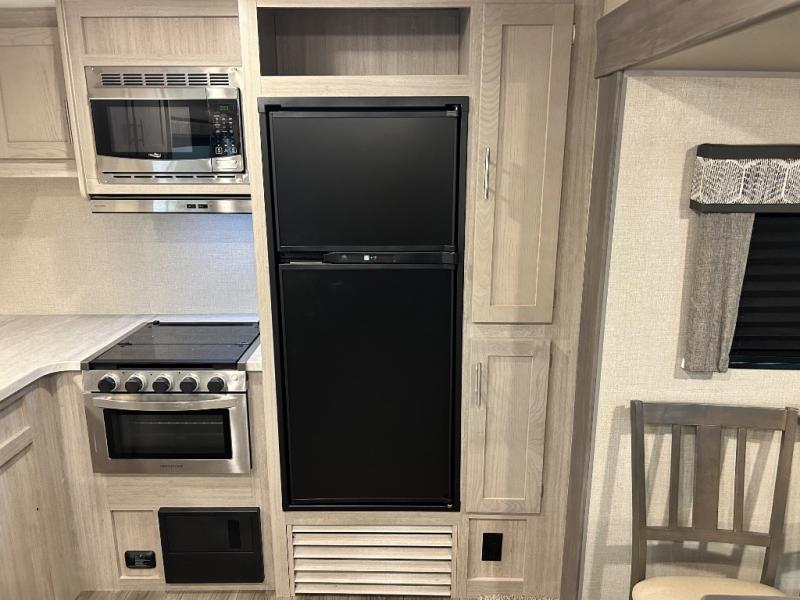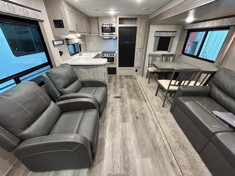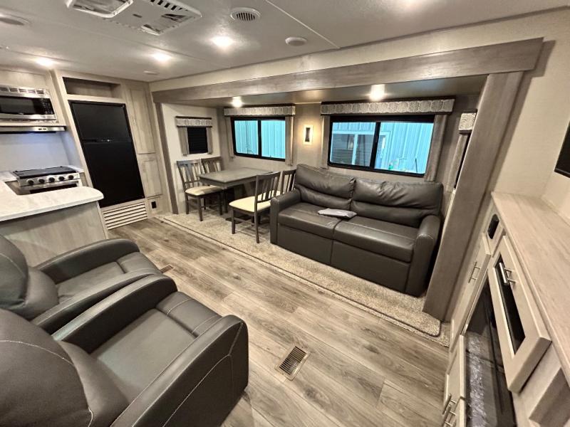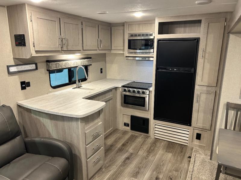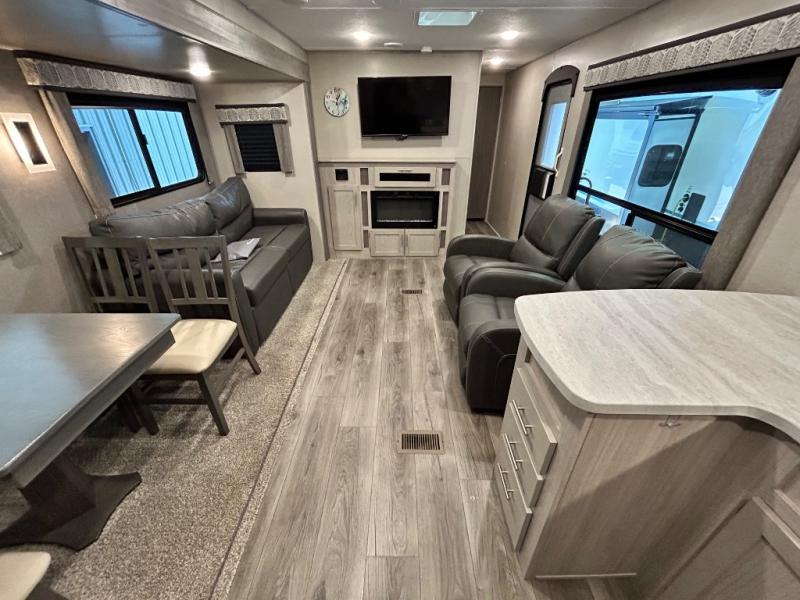 Whether you camp to relax indoors or play outdoors, this trailer offers interior comforts for a couple or a family of four! From the spacious rear kitchen thanks to the large slide out that includes a booth dinette and sofa. Yet you might like to choose the free standing dinette option in place of the booth dinette. The U-shaped counter offers plenty of space to dry dishes and prep meals. There is a 10 cu. ft. refrigerator and pantry for food storage, and everyone can watch the 39" TV with fireplace option below while cooking, cleaning, dining and relaxing. And the recliner lounges will probably be popular seats. At night head to the front bedroom to sleep on the walk-around king bed after stopping off at the full bathroom to get cleaned up.