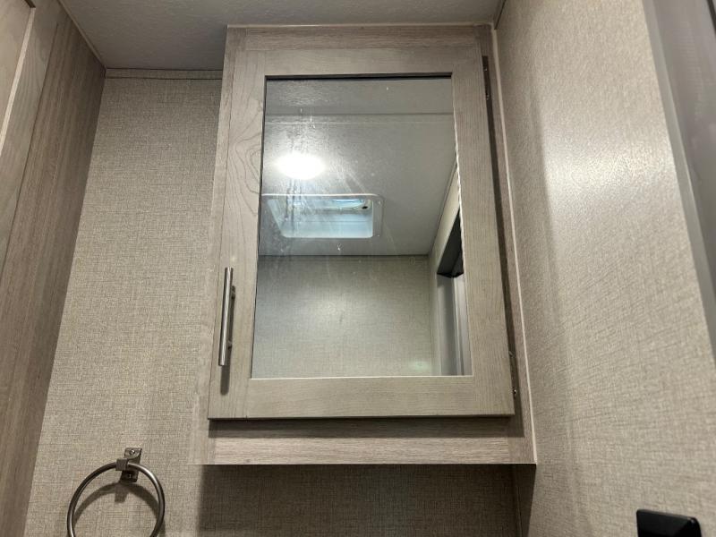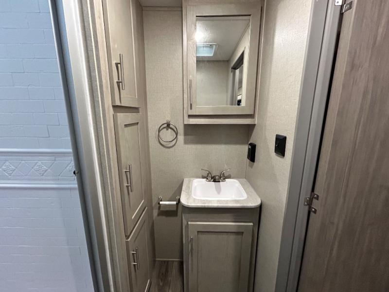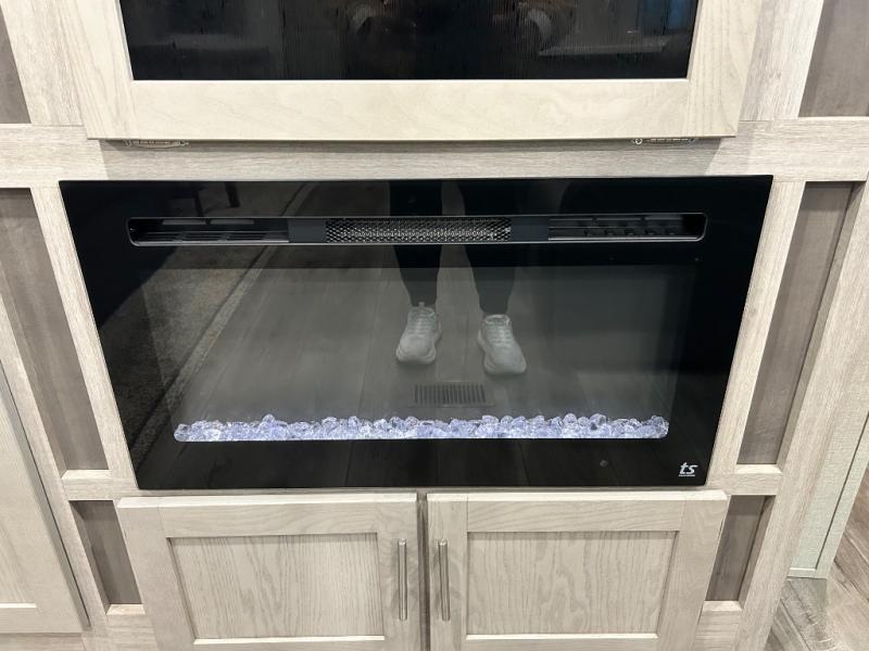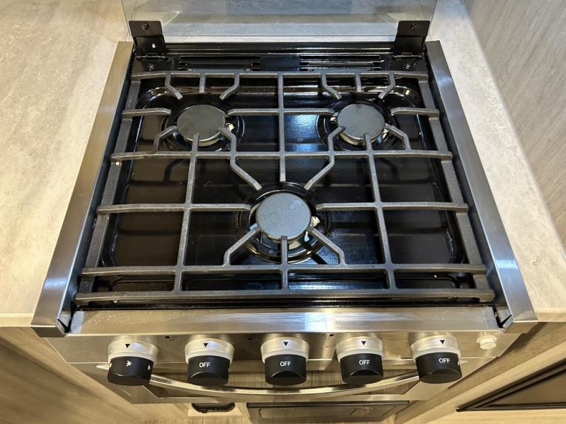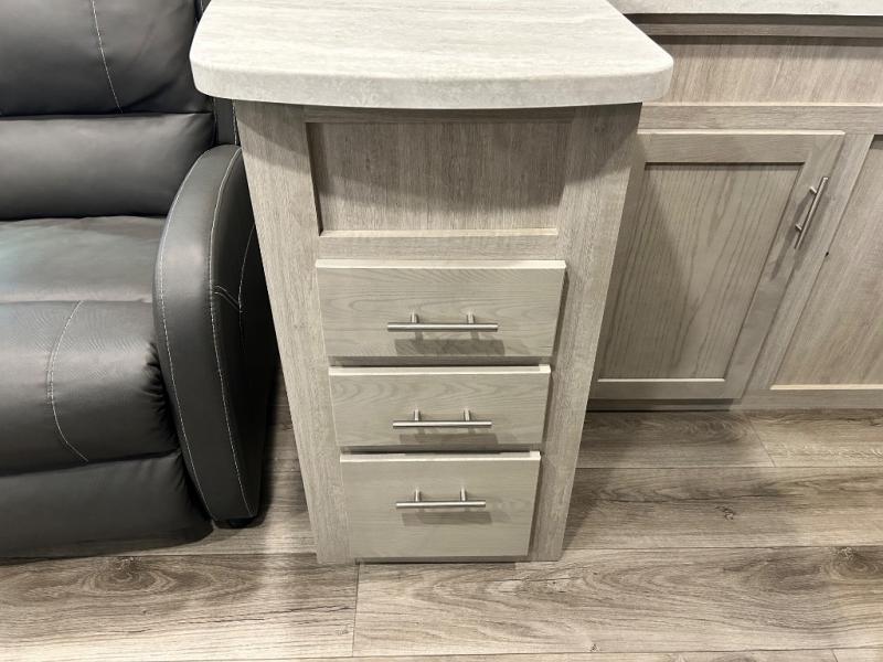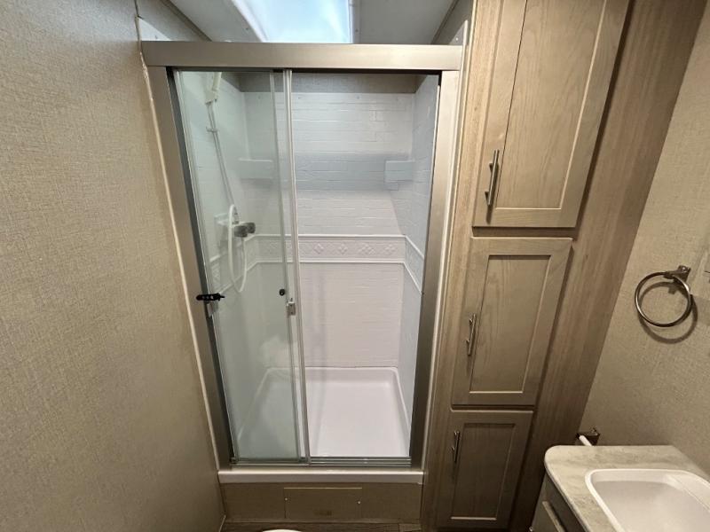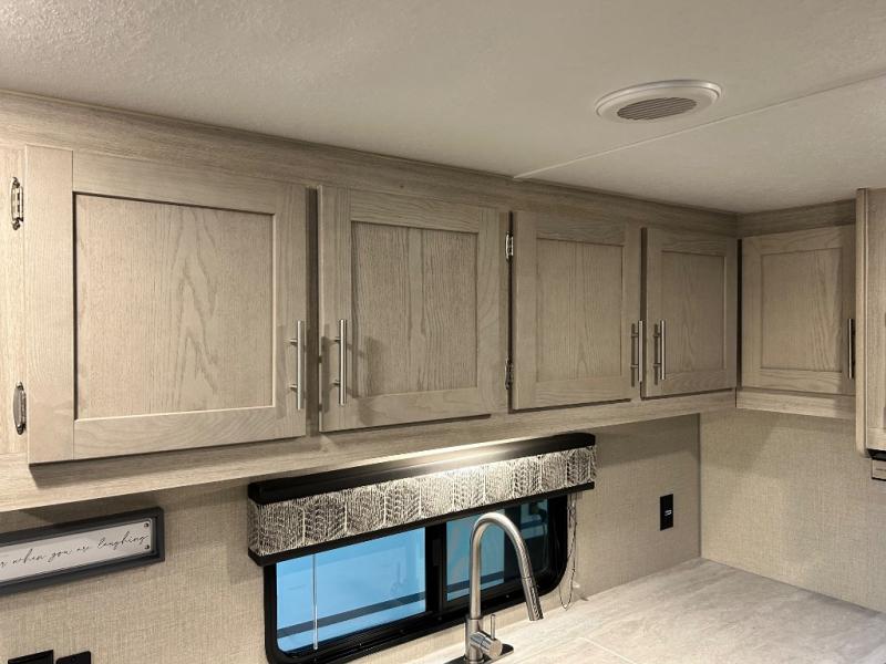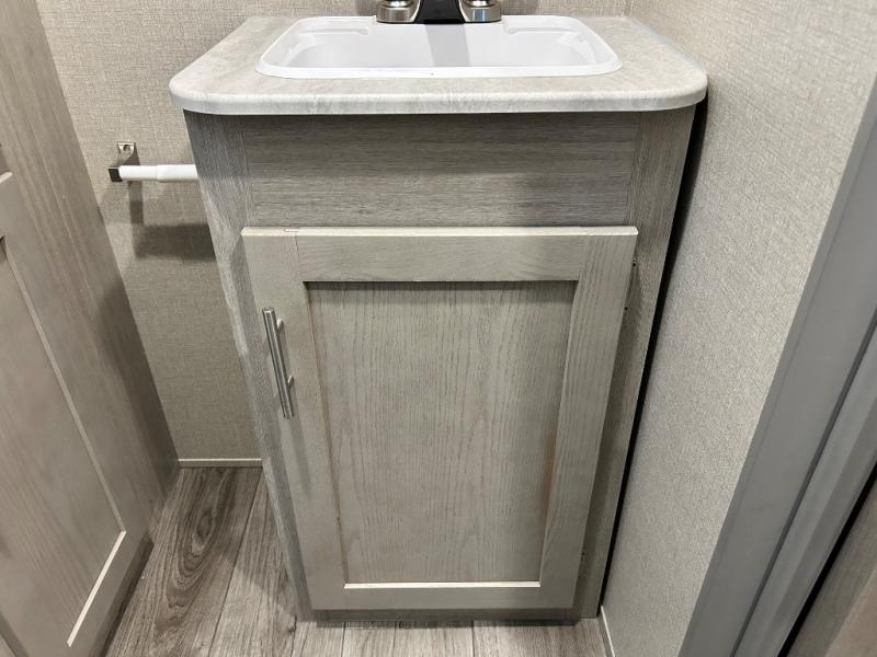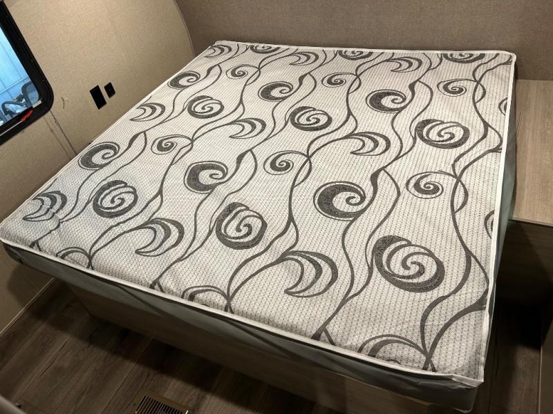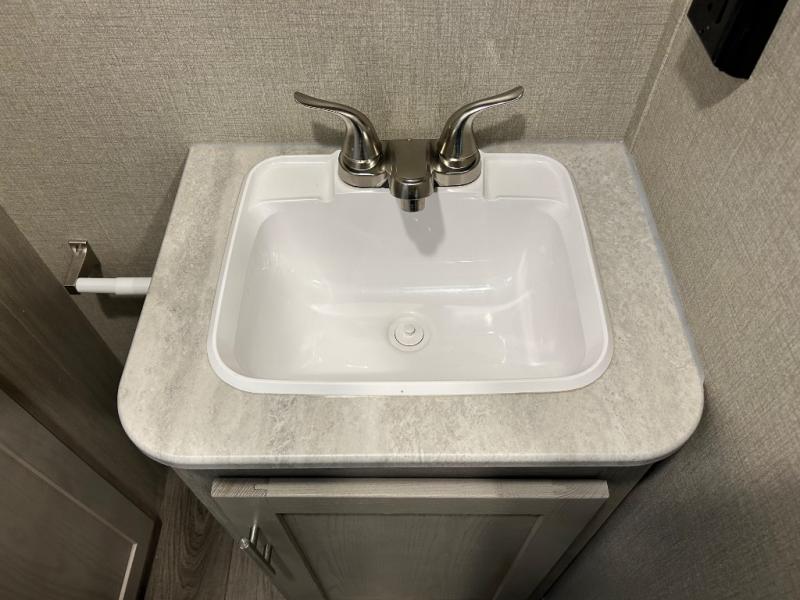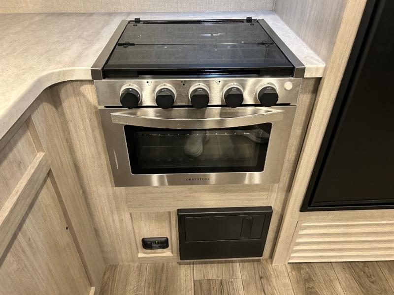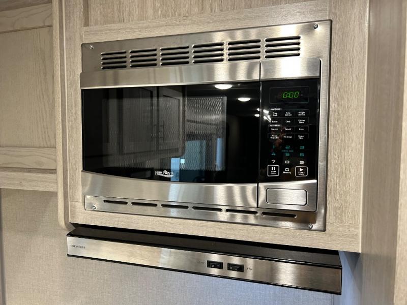 Whether you camp to relax indoors or play outdoors, this trailer offers interior comforts for a couple or a family of four! From the spacious rear kitchen thanks to the large slide out that includes a booth dinette and sofa. Yet you might like to choose the free standing dinette option in place of the booth dinette. The U-shaped counter offers plenty of space to dry dishes and prep meals. There is a 10 cu. ft. refrigerator and pantry for food storage, and everyone can watch the 39" TV with fireplace option below while cooking, cleaning, dining and relaxing. And the recliner lounges will probably be popular seats. At night head to the front bedroom to sleep on the walk-around king bed after stopping off at the full bathroom to get cleaned up.