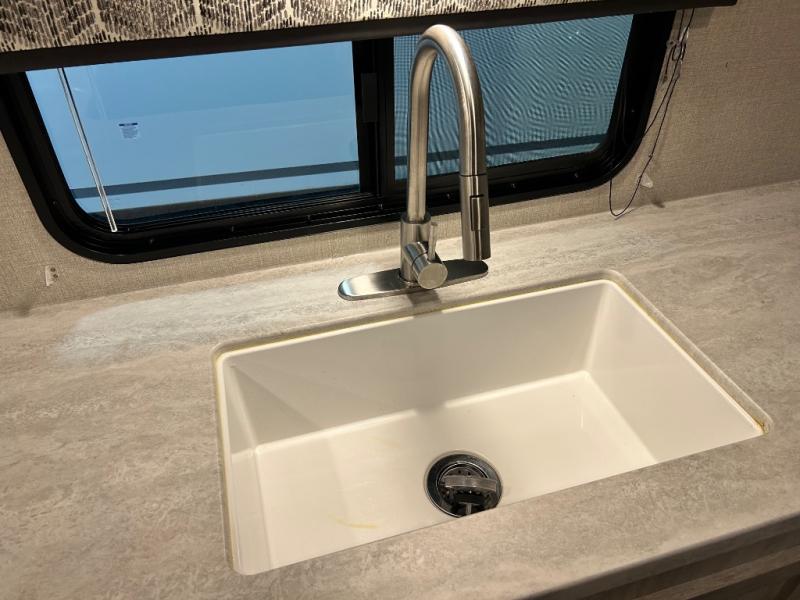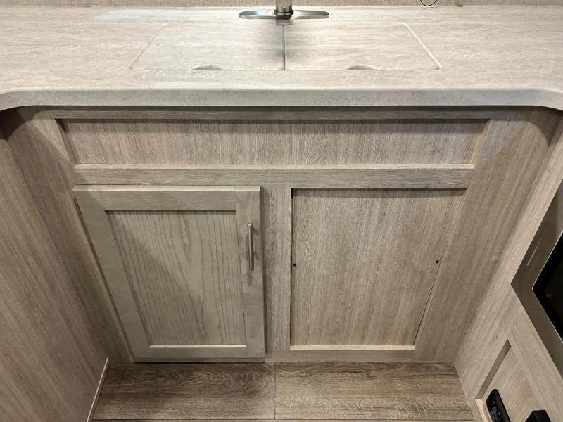 With any Catalina Legacy Edition travel trailer by Coachmen, there is an enclosed, fully sealed underbelly to protect against road debris and help control the interior climate, a seamless Alpha roof membrane, a platinum aluminum exterior, a smooth HD aluminum radius front, and polished HD aluminum fender skirts, plus upgraded aluminum wheels. The interior includes seamless Thermofoil countertops throughout, an under-mount farm style sink with residential kitchen faucet with pull down sprayer to easily clean the fruits and veggies as well as the dishes, full length kitchen drawer guides, and an All-In-One monitor panel system.