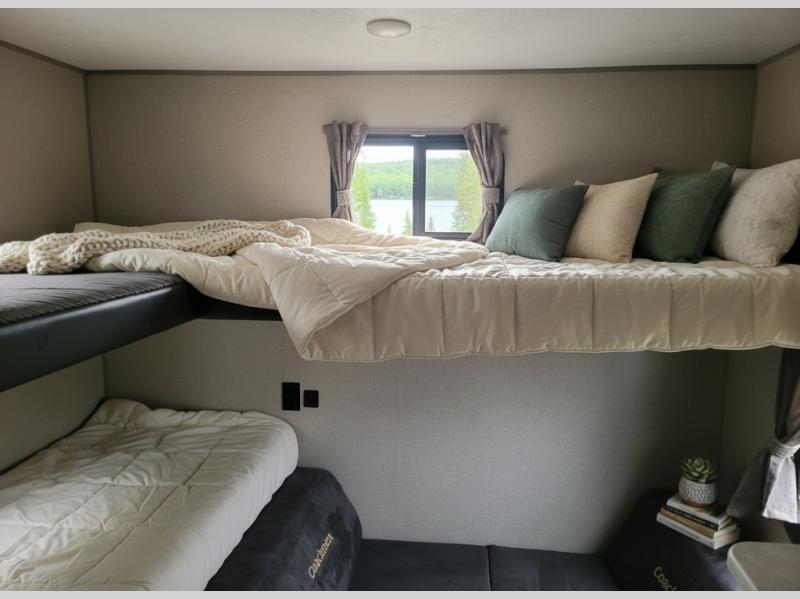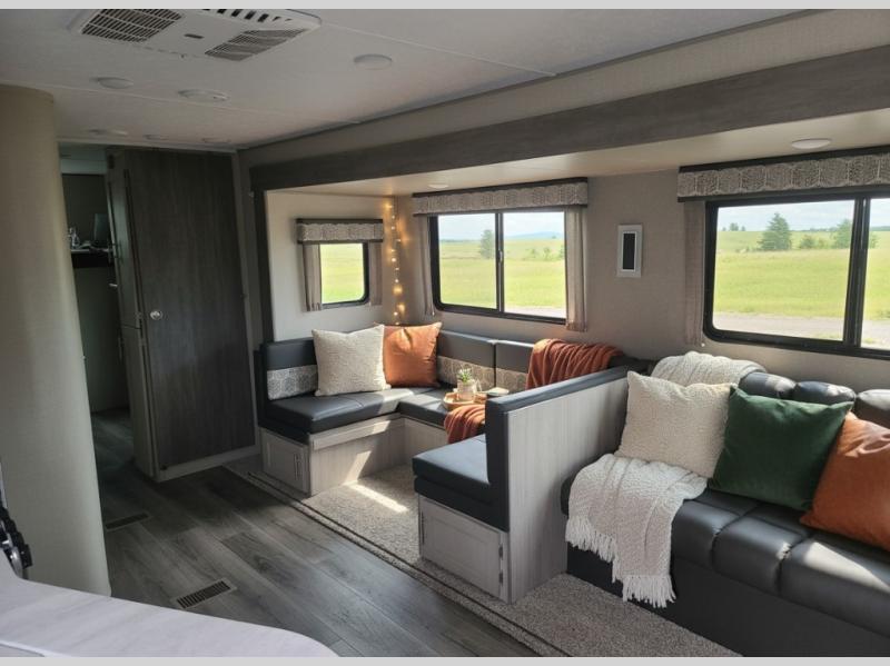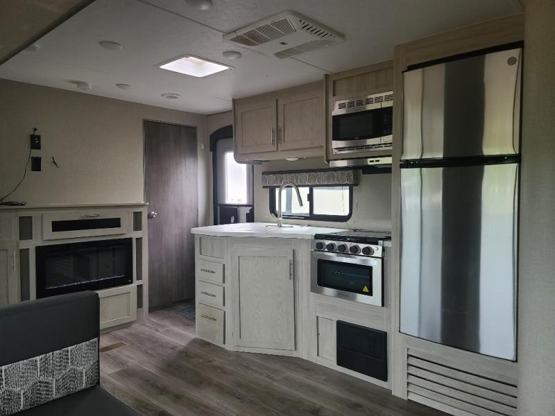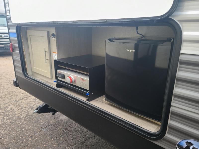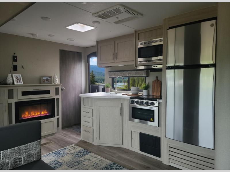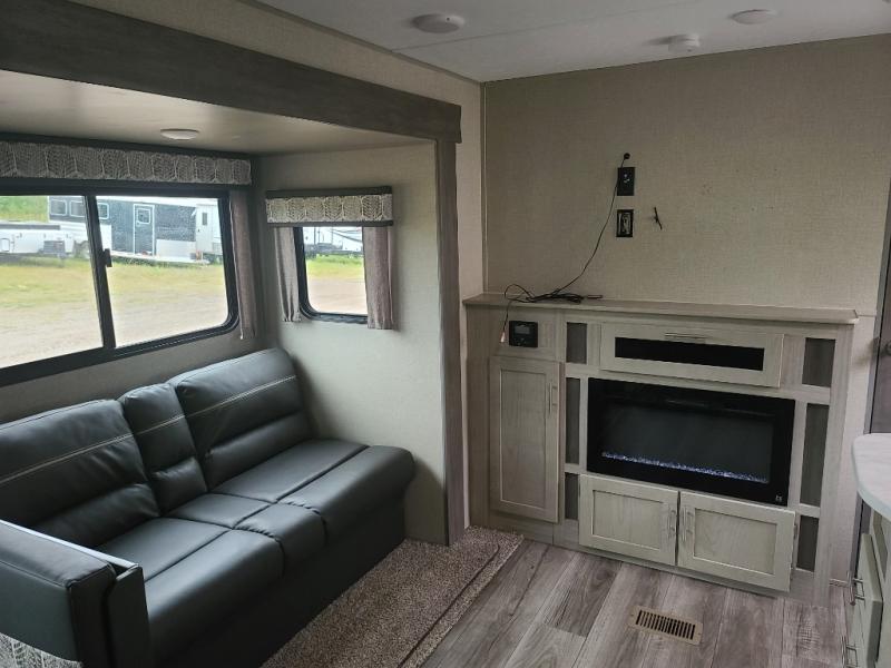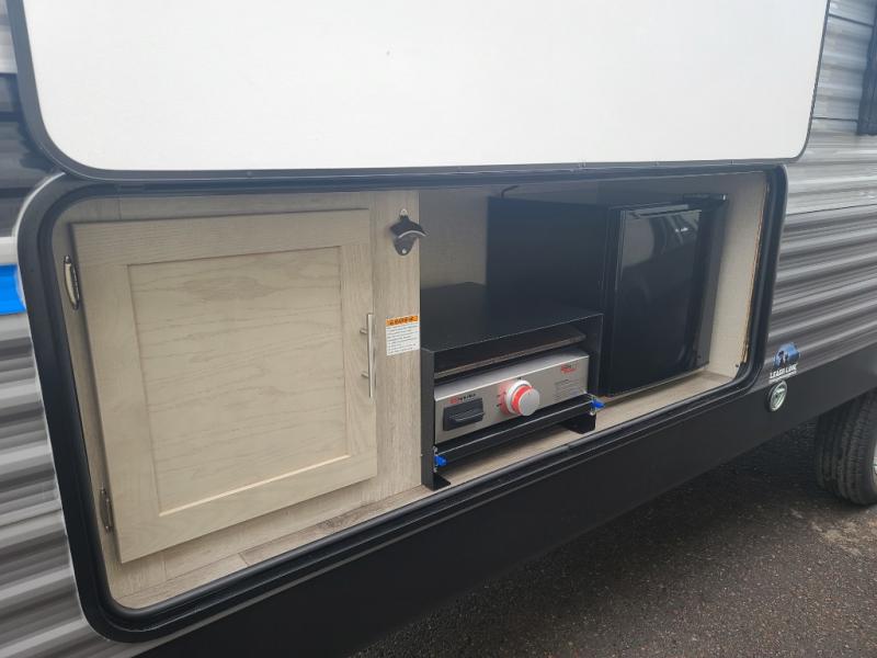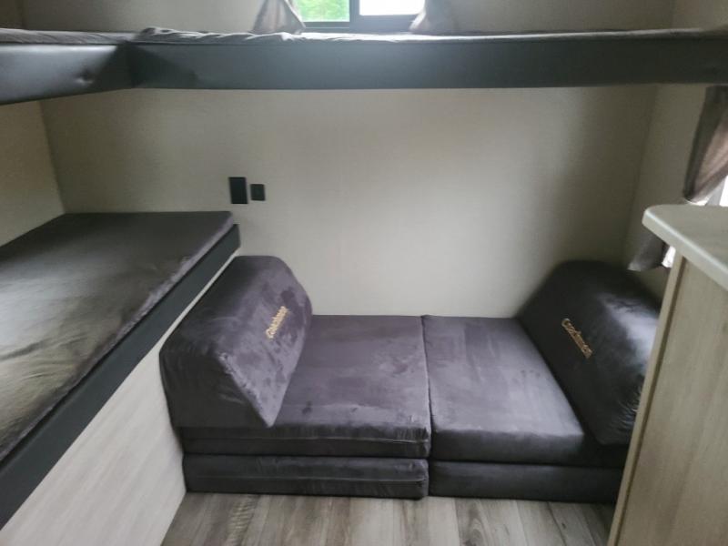 Not only will you be comfortable in this trailer, your friends will have comfort and privacy thanks to having their own bunkhouse on the opposite side of the trailer has the front bedroom where you can sleep like a queen! There are three bunk beds and two COA cube seats plus a location for a TV, a wardrobe, and windows for natural lighting. The combined living and kitchen is spacious thanks to the slide out U-shaped dinette and sofa with drink holders. And some might even decide to sleep on the furniture at night so they can watch the 39" TV. You can even add the fireplace option if you want that feature. The cook will have full amenities to whip up meals including overhead cabinets for dishes and snacks. And the exterior camper kitchen allows the cook to visit with everyone outside under the 18' electric awning that includes multicolor LED lights with a remote.