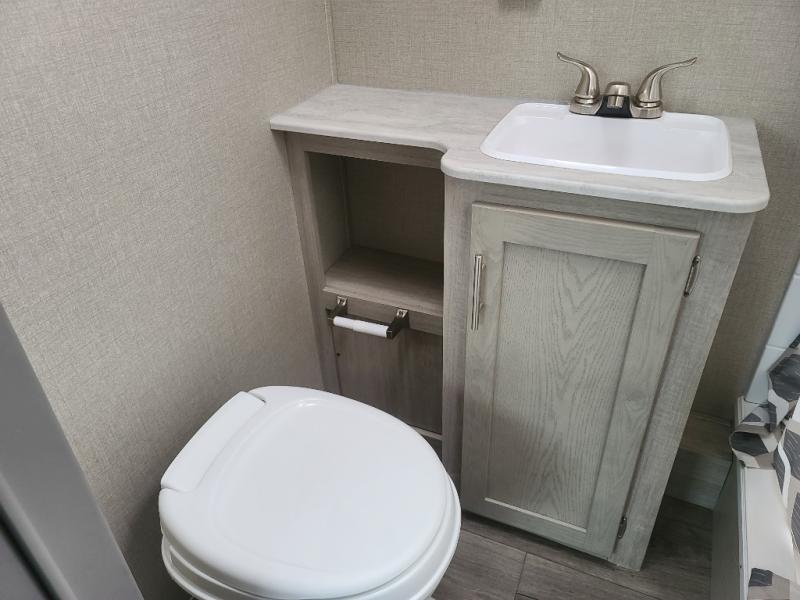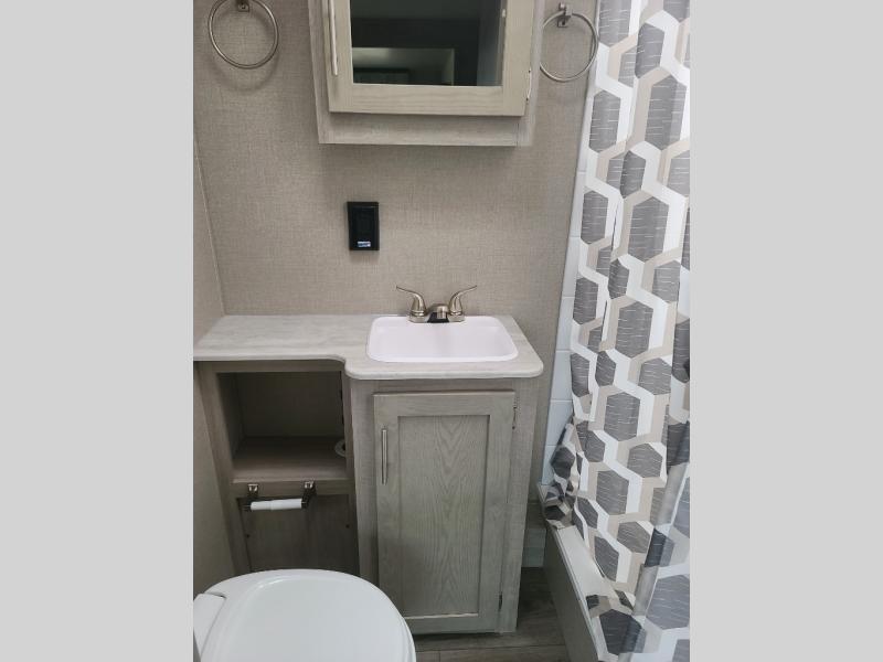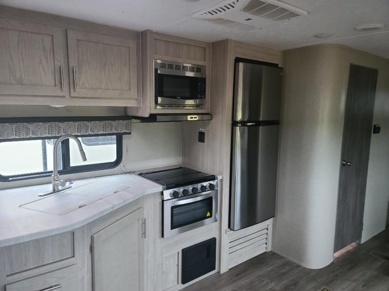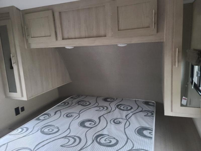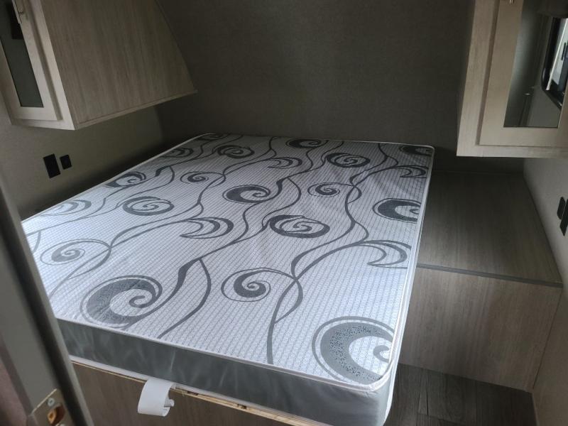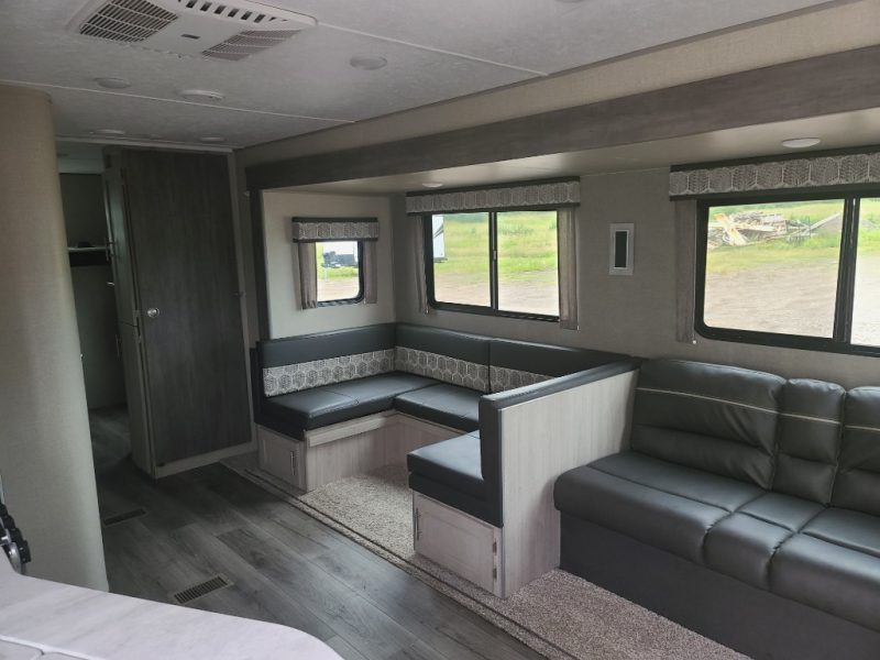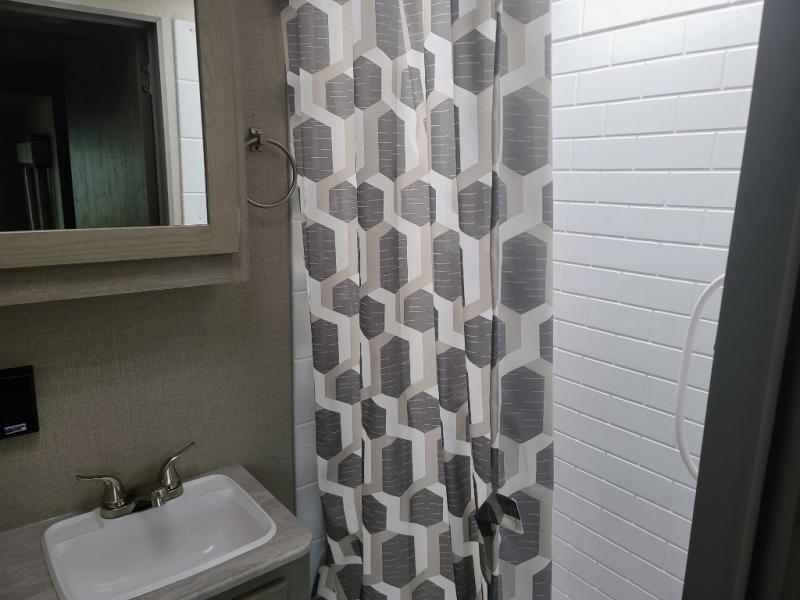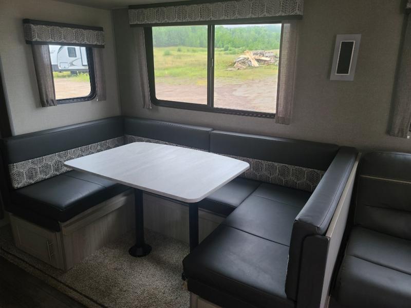 Not only will you be comfortable in this trailer, your friends will have comfort and privacy thanks to having their own bunkhouse on the opposite side of the trailer has the front bedroom where you can sleep like a queen! There are three bunk beds and two COA cube seats plus a location for a TV, a wardrobe, and windows for natural lighting. The combined living and kitchen is spacious thanks to the slide out U-shaped dinette and sofa with drink holders. And some might even decide to sleep on the furniture at night so they can watch the 39" TV. You can even add the fireplace option if you want that feature. The cook will have full amenities to whip up meals including overhead cabinets for dishes and snacks. And the exterior camper kitchen allows the cook to visit with everyone outside under the 18' electric awning that includes multicolor LED lights with a remote.