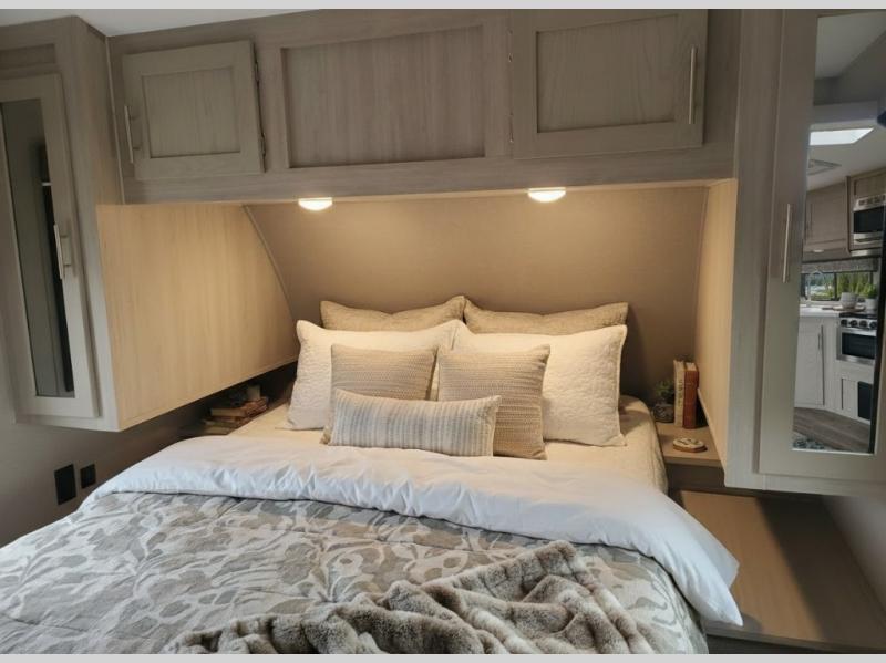 With any Catalina Legacy Edition travel trailer by Coachmen, there is an enclosed, fully sealed underbelly to protect against road debris and help control the interior climate, a seamless Alpha roof membrane, a platinum aluminum exterior, a smooth HD aluminum radius front, and polished HD aluminum fender skirts, plus upgraded aluminum wheels. The interior includes seamless Thermofoil countertops throughout, an under-mount farm style sink with residential kitchen faucet with pull down sprayer to easily clean the fruits and veggies as well as the dishes, full length kitchen drawer guides, and an All-In-One monitor panel system.