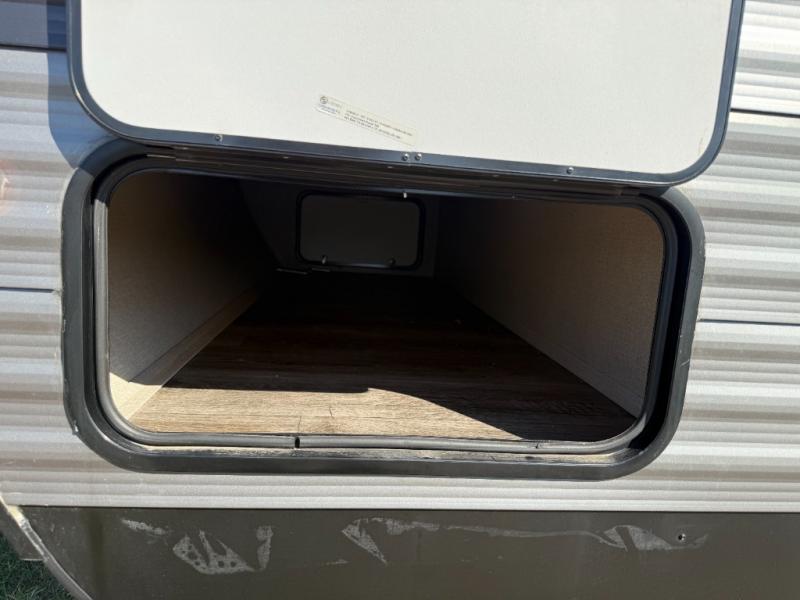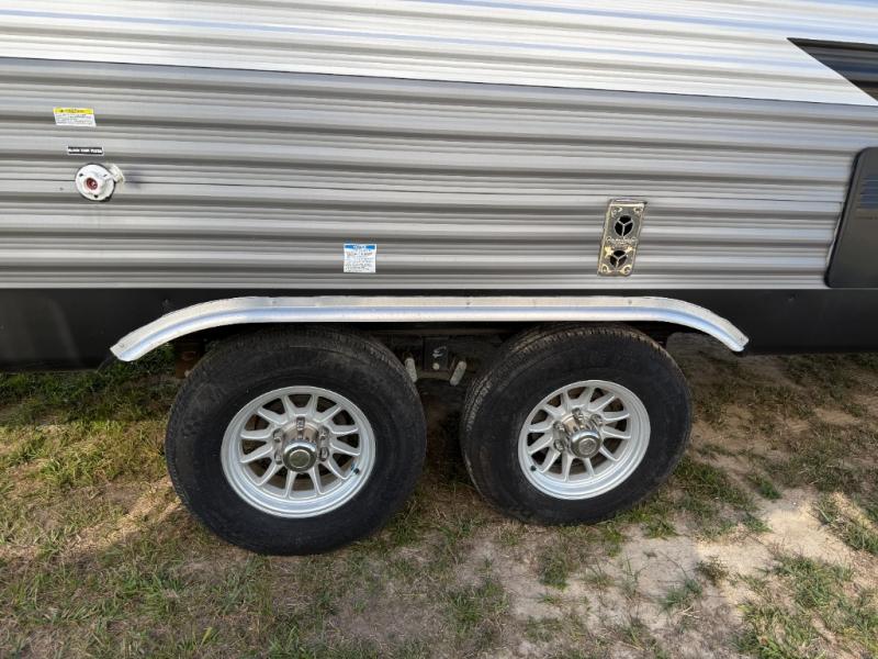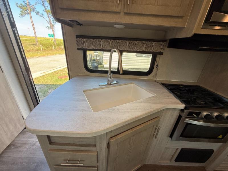 Not only will you be comfortable in this trailer, your friends will have comfort and privacy thanks to having their own bunkhouse on the opposite side of the trailer has the front bedroom where you can sleep like a queen! There are three bunk beds and two COA cube seats plus a location for a TV, a wardrobe, and windows for natural lighting. The combined living and kitchen is spacious thanks to the slide out U-shaped dinette and sofa with drink holders. And some might even decide to sleep on the furniture at night so they can watch the 39" TV. You can even add the fireplace option if you want that feature. The cook will have full amenities to whip up meals including overhead cabinets for dishes and snacks. And the exterior camper kitchen allows the cook to visit with everyone outside under the 18' electric awning that includes multicolor LED lights with a remote.