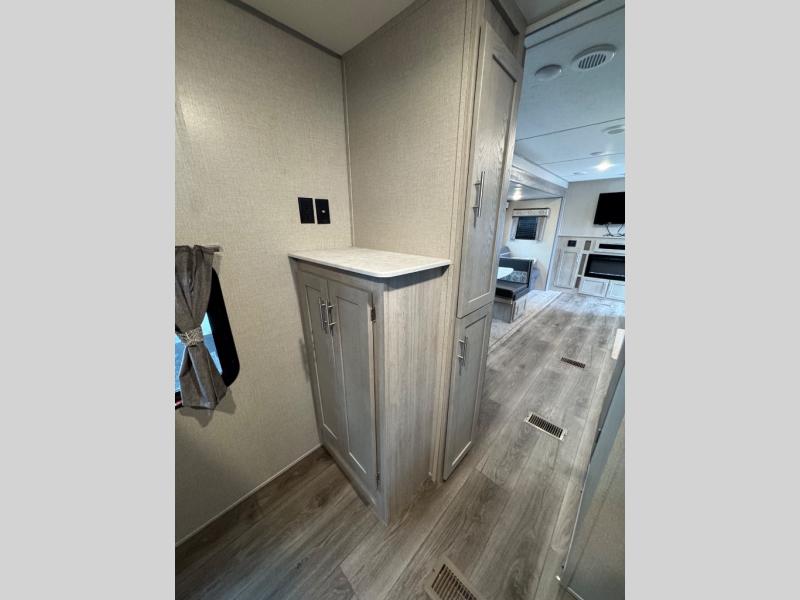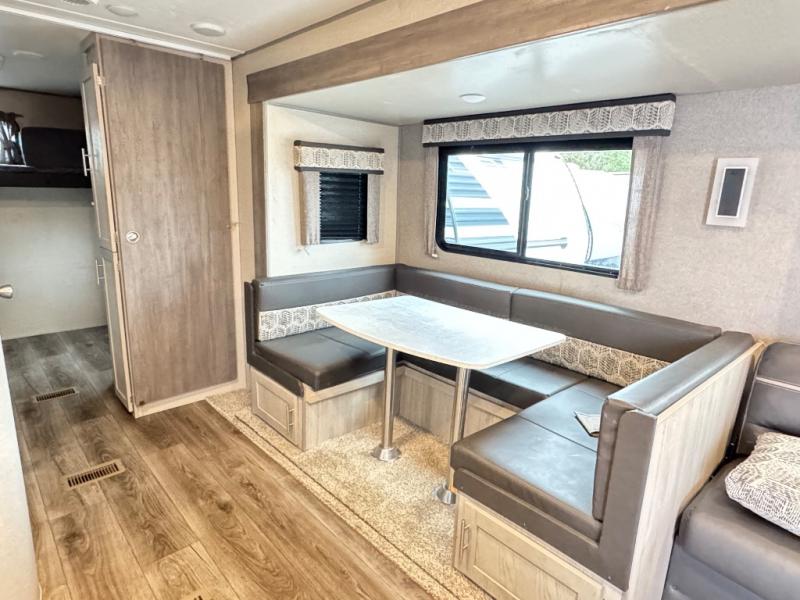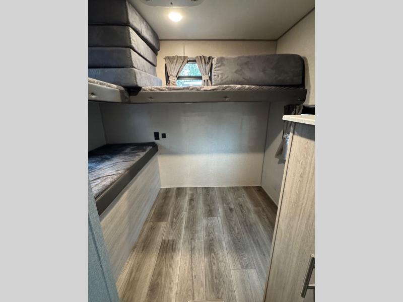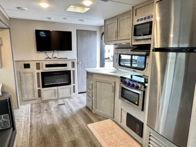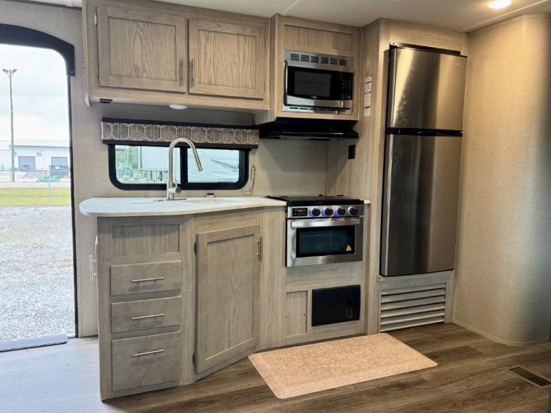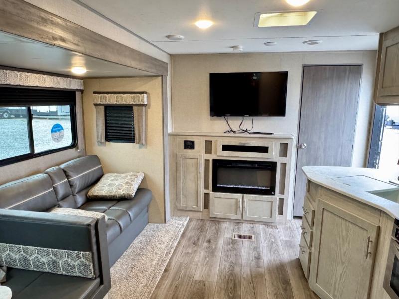 Not only will you be comfortable in this trailer, your friends will have comfort and privacy thanks to having their own bunkhouse on the opposite side of the trailer has the front bedroom where you can sleep like a queen! There are three bunk beds and two COA cube seats plus a location for a TV, a wardrobe, and windows for natural lighting. The combined living and kitchen is spacious thanks to the slide out U-shaped dinette and sofa with drink holders. And some might even decide to sleep on the furniture at night so they can watch the 39" TV. You can even add the fireplace option if you want that feature. The cook will have full amenities to whip up meals including overhead cabinets for dishes and snacks. And the exterior camper kitchen allows the cook to visit with everyone outside under the 18' electric awning that includes multicolor LED lights with a remote.