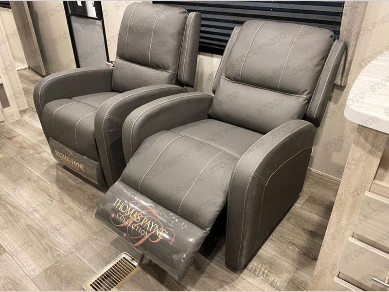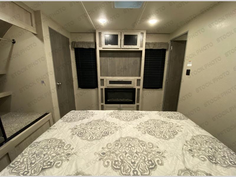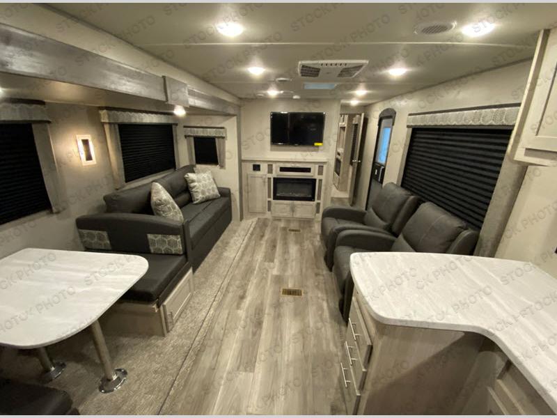 Enjoy relaxing under the 18' electric awning during the daytime for some protection from the sun, and at night with multicolor LED lights to set the mood for the evening. You can store beverages in the exterior mini fridge for convenience, and there is exterior storage for outdoor games and such. The interior is spacious with a large slide out booth dinette and sofa with drink holders, yet you might like to choose the free standing dinette option in place of the booth dinette. There is also a fireplace option under the 39" TV. The two recliner lounges are sure to be a favorite spot, and the cook will love the rear kitchen including the U-shaped counter when preparing meals and drying the dishes. Now the front bedroom is unique with a fireplace, entertainment center, slide out queen bed with nightstands and a large front closet plus a closet prepped for a washer/dryer option.