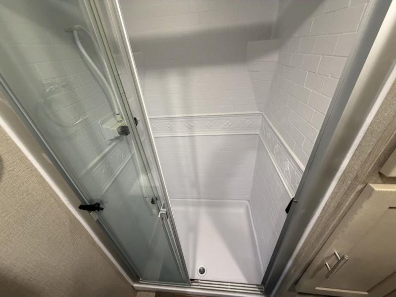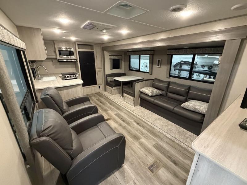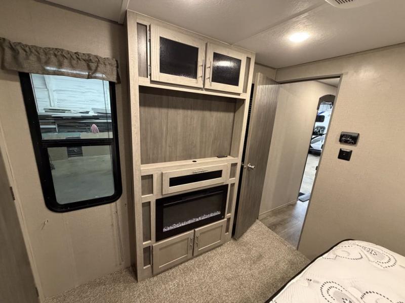 Enjoy relaxing under the 18' electric awning during the daytime for some protection from the sun, and at night with multicolor LED lights to set the mood for the evening. You can store beverages in the exterior mini fridge for convenience, and there is exterior storage for outdoor games and such. The interior is spacious with a large slide out booth dinette and sofa with drink holders, yet you might like to choose the free standing dinette option in place of the booth dinette. There is also a fireplace option under the 39" TV. The two recliner lounges are sure to be a favorite spot, and the cook will love the rear kitchen including the U-shaped counter when preparing meals and drying the dishes. Now the front bedroom is unique with a fireplace, entertainment center, slide out queen bed with nightstands and a large front closet plus a closet prepped for a washer/dryer option.