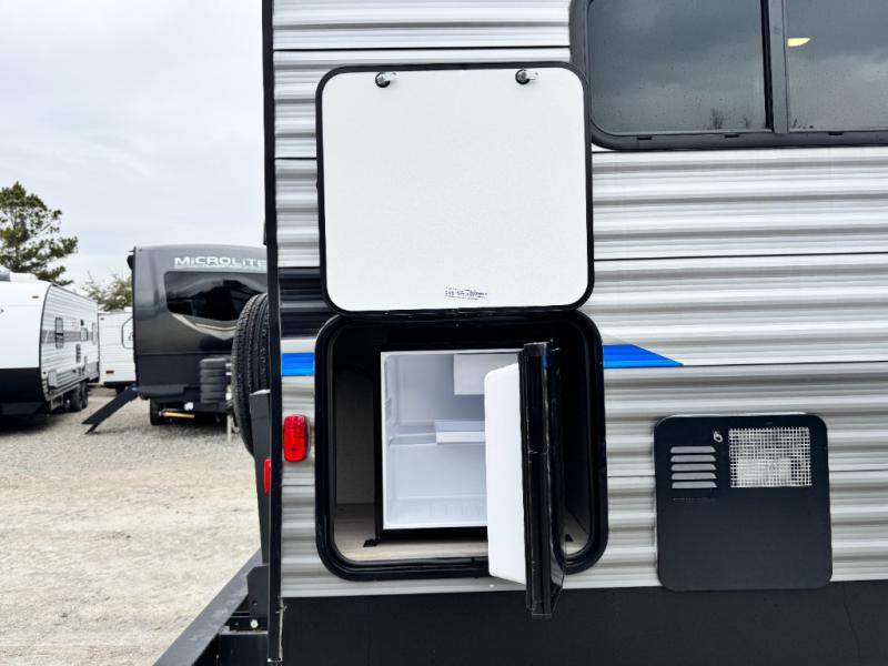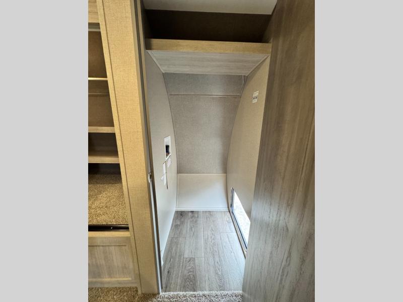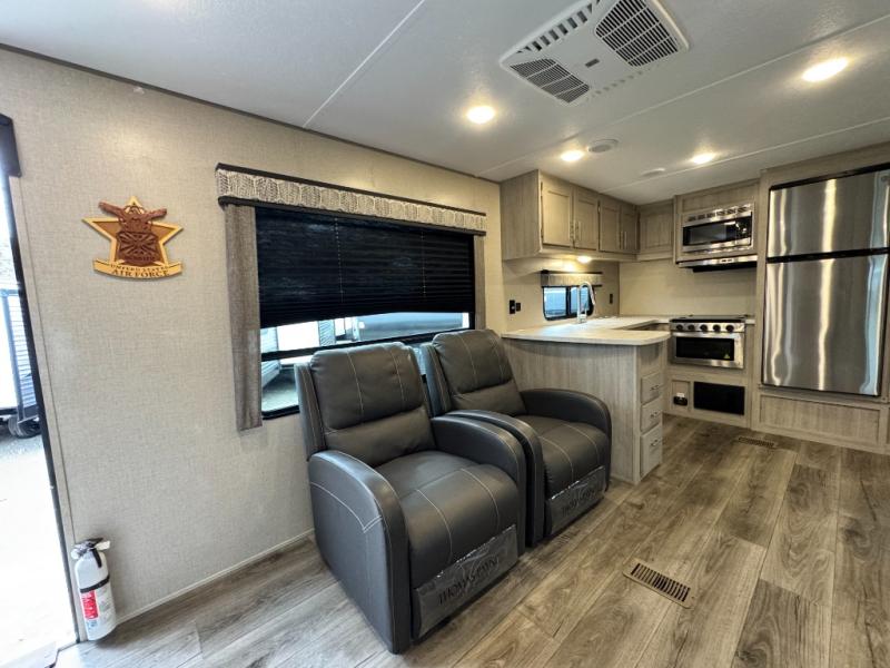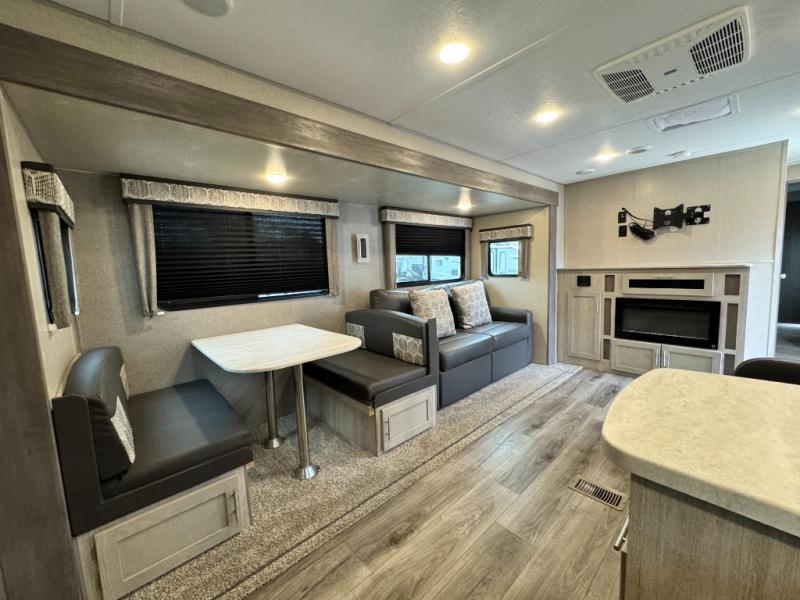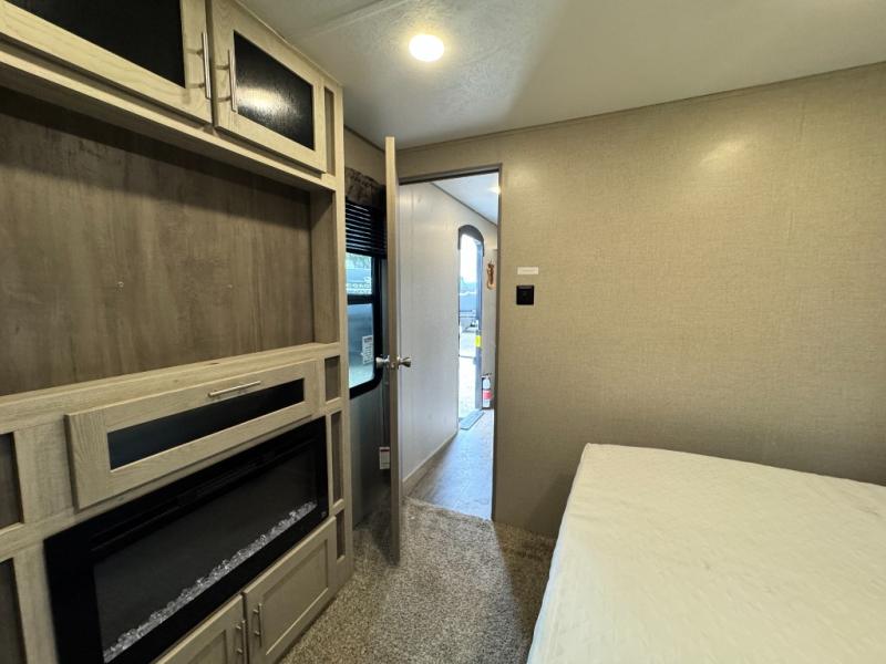 Enjoy relaxing under the 18' electric awning during the daytime for some protection from the sun, and at night with multicolor LED lights to set the mood for the evening. You can store beverages in the exterior mini fridge for convenience, and there is exterior storage for outdoor games and such. The interior is spacious with a large slide out booth dinette and sofa with drink holders, yet you might like to choose the free standing dinette option in place of the booth dinette. There is also a fireplace option under the 39" TV. The two recliner lounges are sure to be a favorite spot, and the cook will love the rear kitchen including the U-shaped counter when preparing meals and drying the dishes. Now the front bedroom is unique with a fireplace, entertainment center, slide out queen bed with nightstands and a large front closet plus a closet prepped for a washer/dryer option.