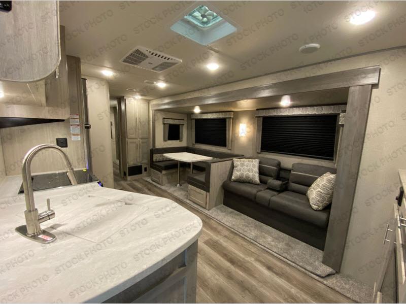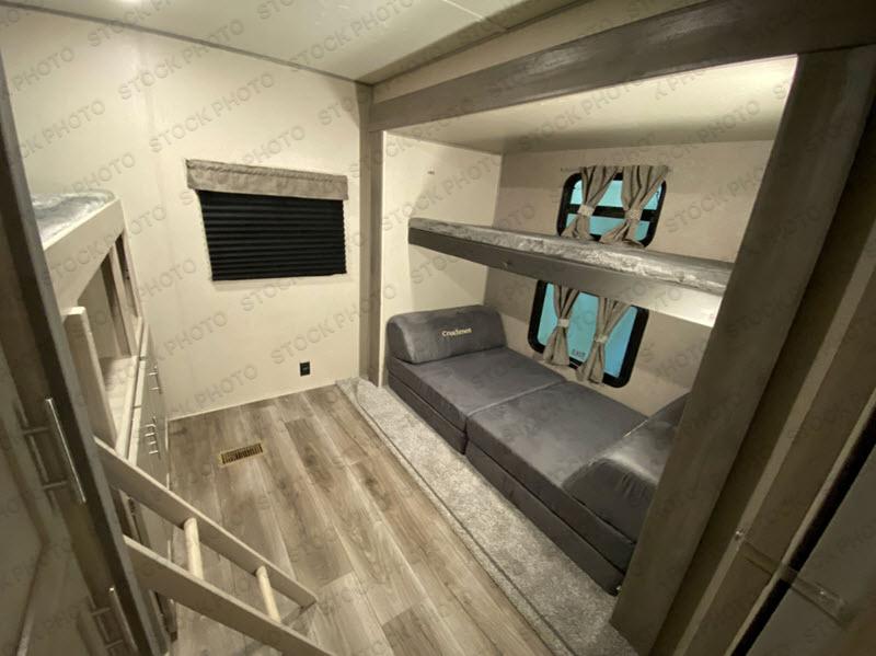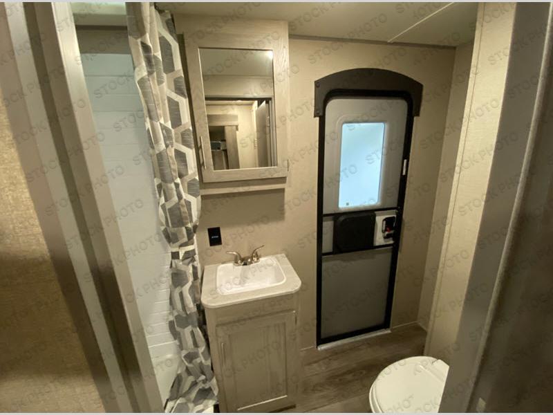 When you enjoy hiking, biking, fishing and/or any type of outdoor activities, and waking up to beautiful scenery from your own comforts, then start camping with this trailer at the campsite! You will be able to sleep like a queen on the walk-around bed with dual wardrobes and overhead storage for more items in the front private bedroom while your family or friends have their own privacy in the bunkhouse complete with two bunks, two COA cube futons and plenty of storage. The full bathroom includes the second entry/exit door for convenience when outside under the 21' electric awning with multicolor LED lights, or while cooking using the full size camper kitchen along the exterior. There are full kitchen amenities inside including a 10 cu. ft. refrigerator and a pantry. And there is a 39" TV to watch and a place to dine and relax on the U-shaped dinette and sofa slide out.