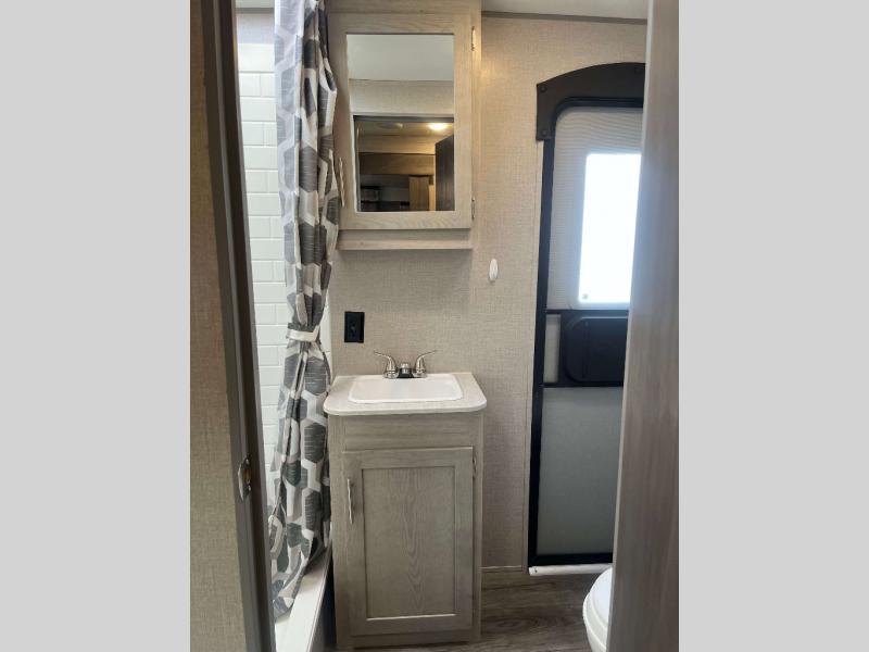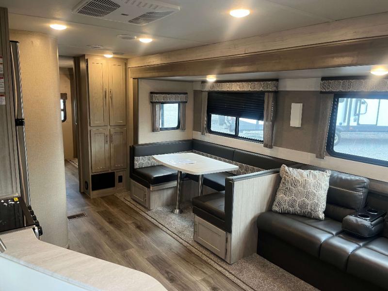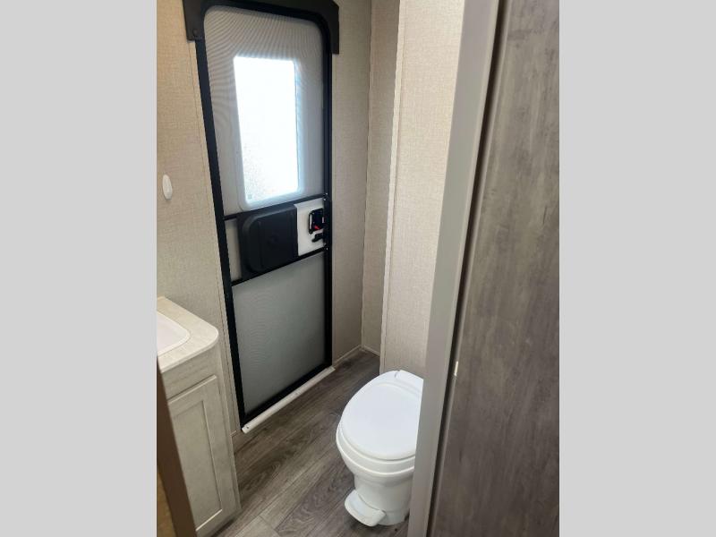BATHROOM, 5/8" TONGUE AND GROOVE PLYWOOD FLOORING, ALL-IN-ONE MONITOR SYSTEM, JIFFY SOFA W/ FLIP DOWN CUPHOLDER - PREMIER MEDIA ACCESS PACKAGE