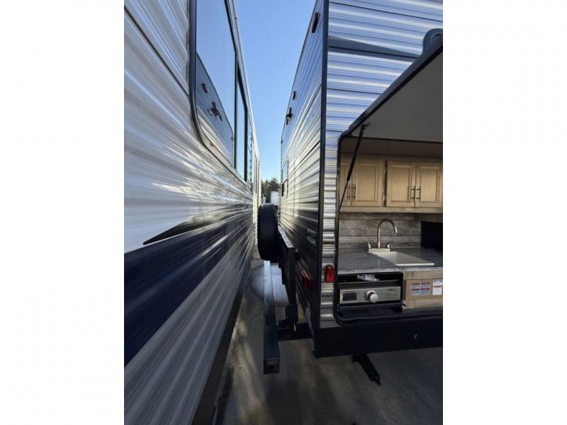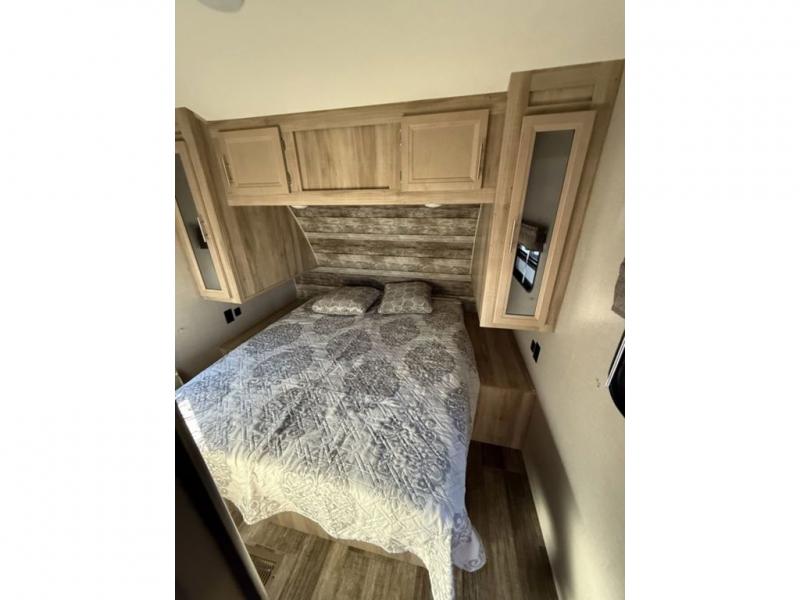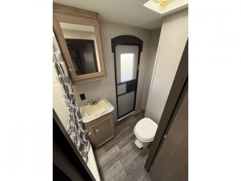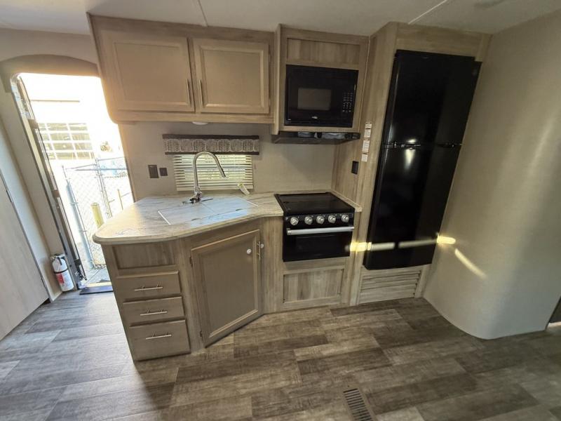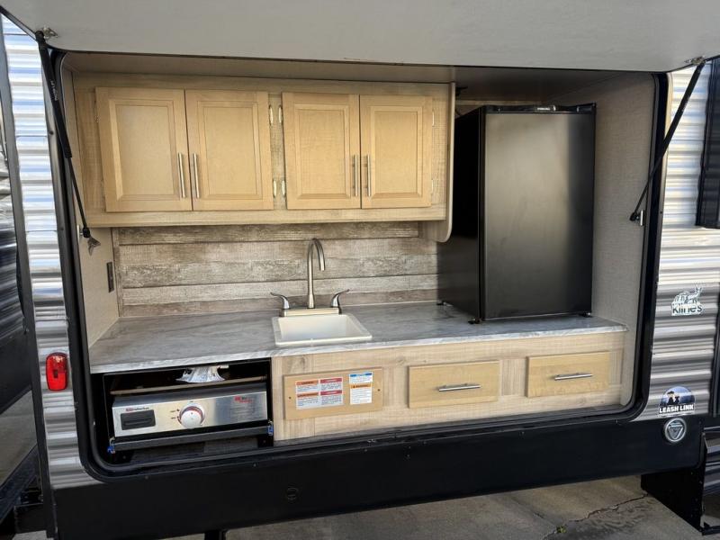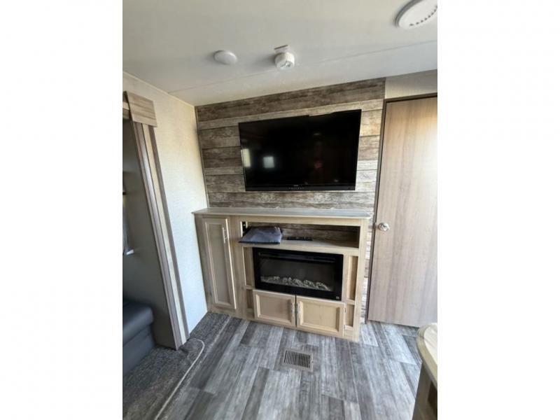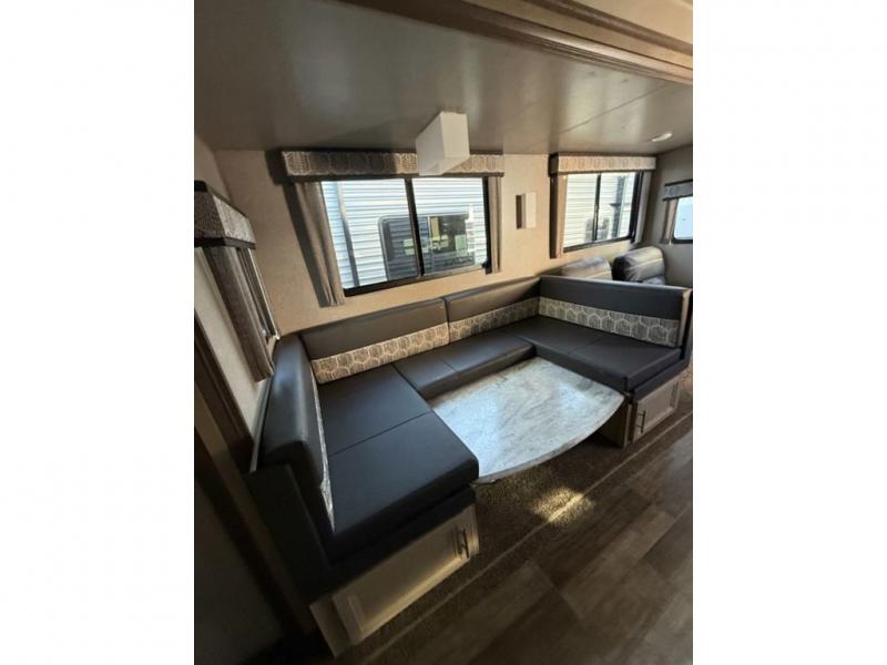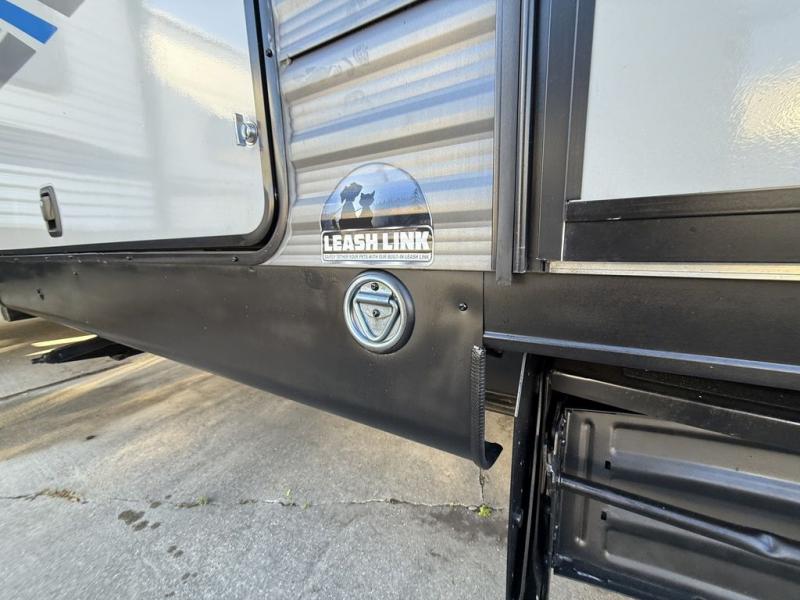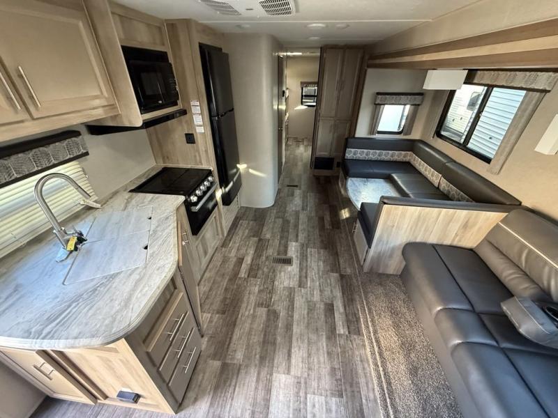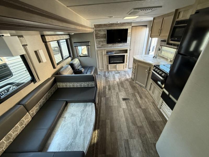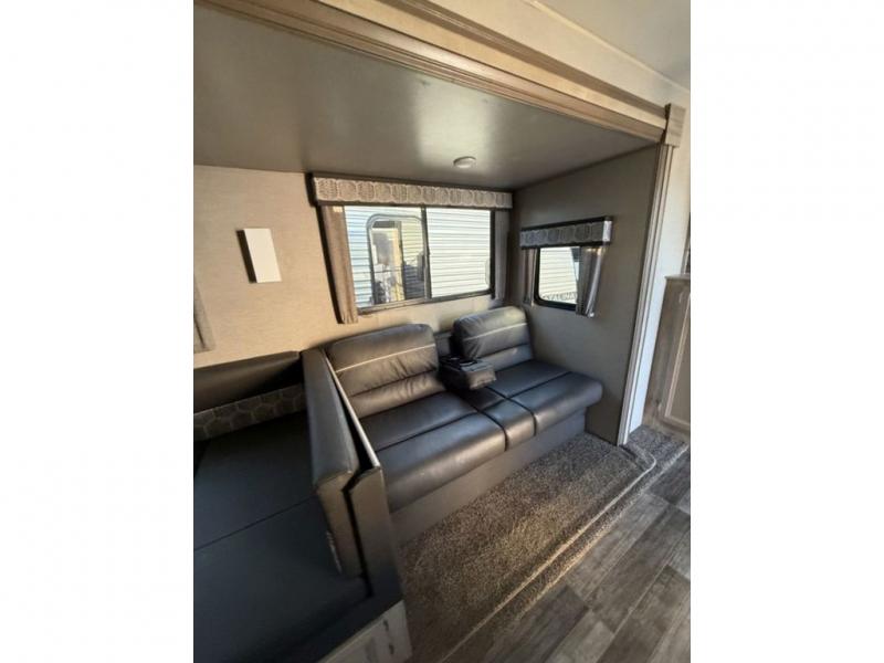 When you enjoy hiking, biking, fishing and/or any type of outdoor activities, and waking up to beautiful scenery from your own comforts, then start camping with this trailer at the campsite! You will be able to sleep like a queen on the walk-around bed with dual wardrobes and overhead storage for more items in the front private bedroom while your family or friends have their own privacy in the bunkhouse complete with two bunks, two COA cube futons and plenty of storage. The full bathroom includes the second entry/exit door for convenience when outside under the 21' electric awning with multicolor LED lights, or while cooking using the full size camper kitchen along the exterior. There are full kitchen amenities inside including a 10 cu. ft. refrigerator and a pantry. And there is a 39" TV to watch and a place to dine and relax on the U-shaped dinette and sofa slide out.