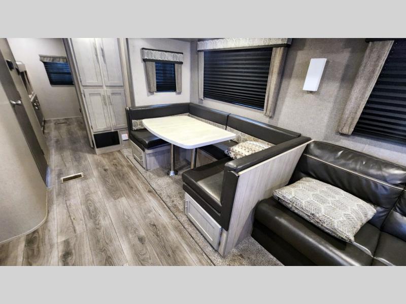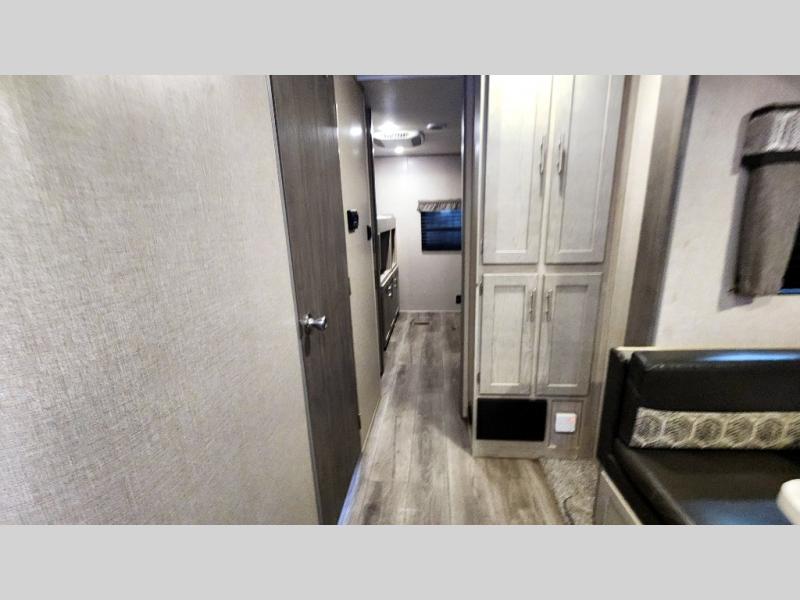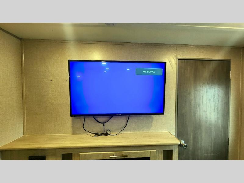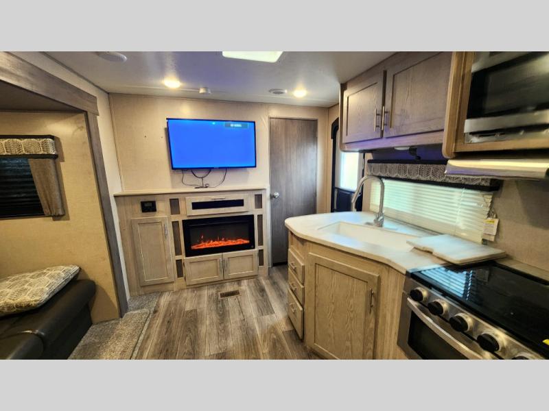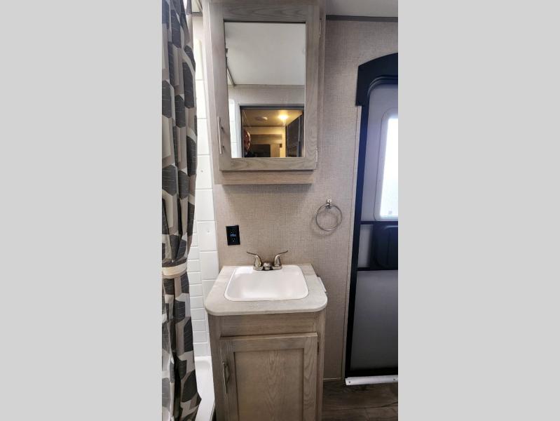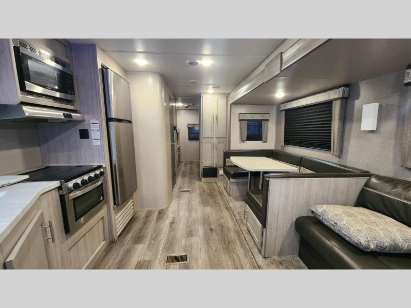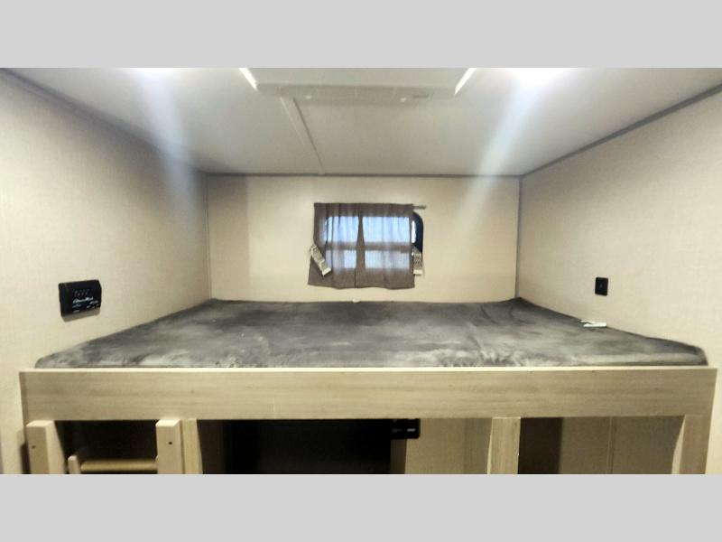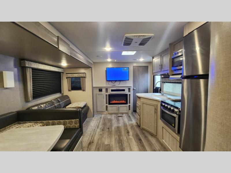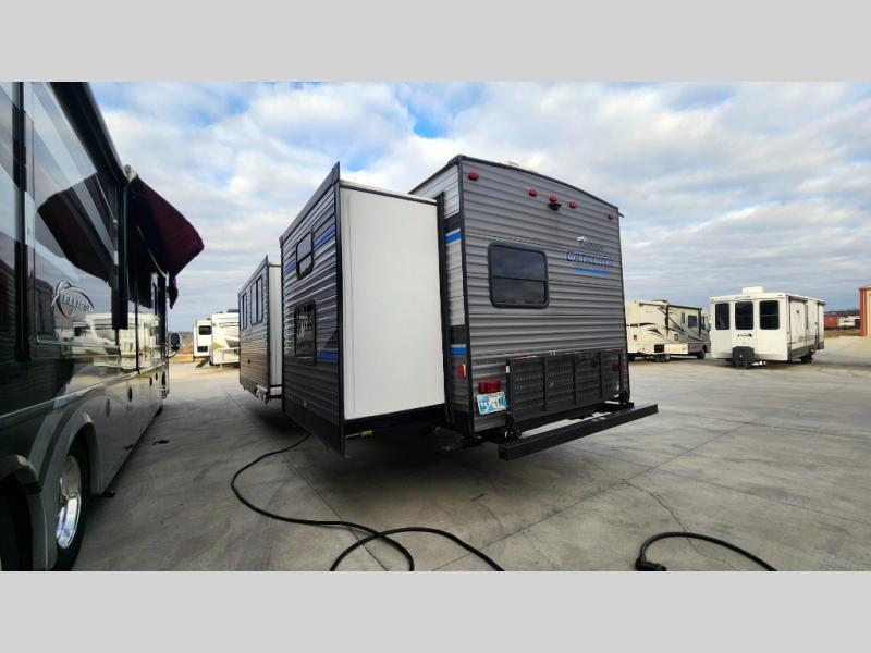 When you enjoy hiking, biking, fishing and/or any type of outdoor activities, and waking up to beautiful scenery from your own comforts, then start camping with this trailer at the campsite! You will be able to sleep like a queen on the walk-around bed with dual wardrobes and overhead storage for more items in the front private bedroom while your family or friends have their own privacy in the bunkhouse complete with two bunks, two COA cube futons and plenty of storage. The full bathroom includes the second entry/exit door for convenience when outside under the 21' electric awning with multicolor LED lights, or while cooking using the full size camper kitchen along the exterior. There are full kitchen amenities inside including a 10 cu. ft. refrigerator and a pantry. And there is a 39" TV to watch and a place to dine and relax on the U-shaped dinette and sofa slide out.