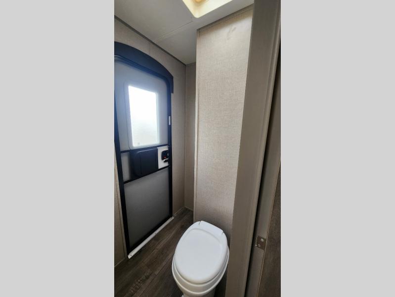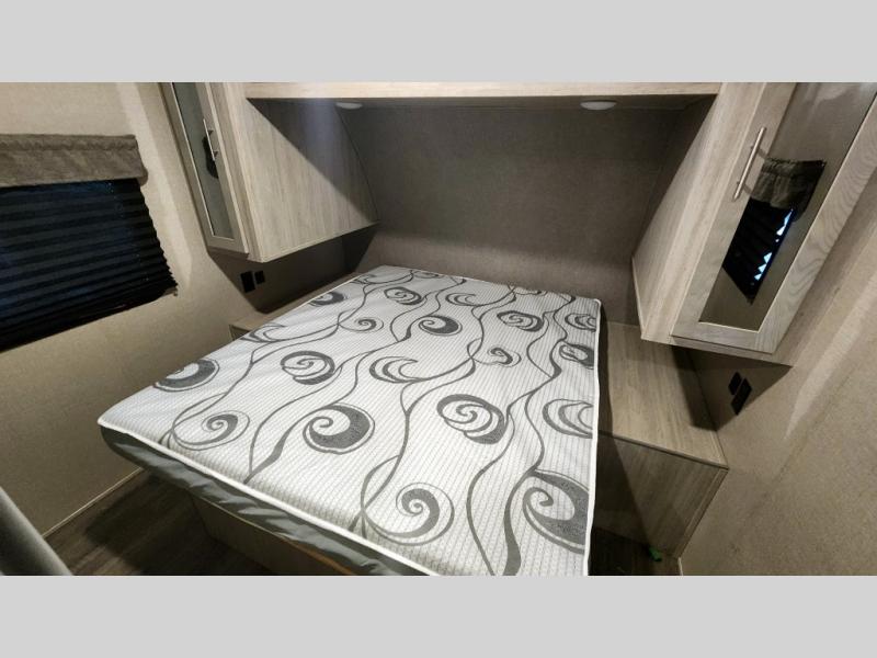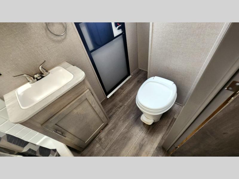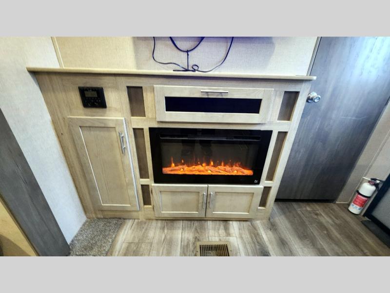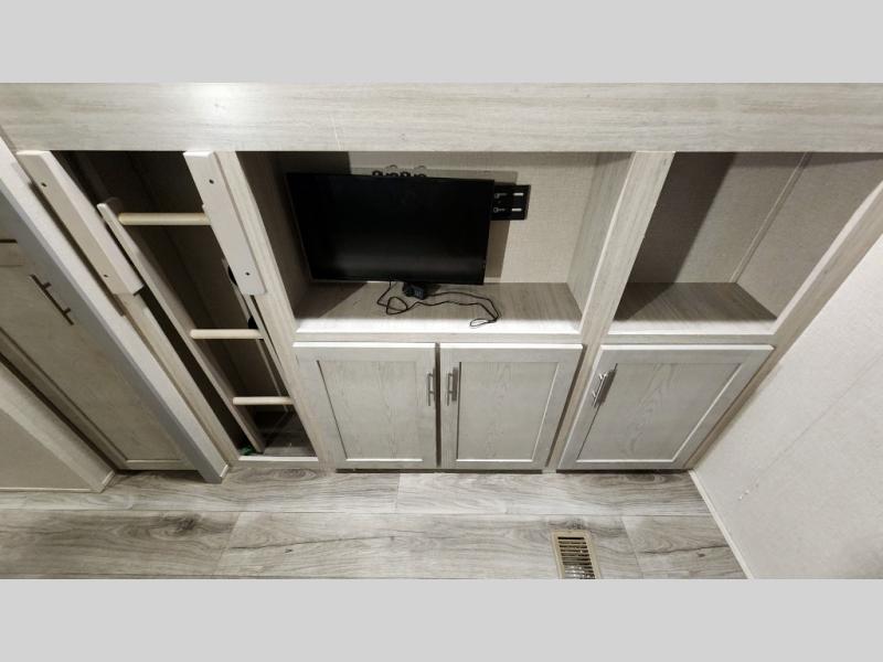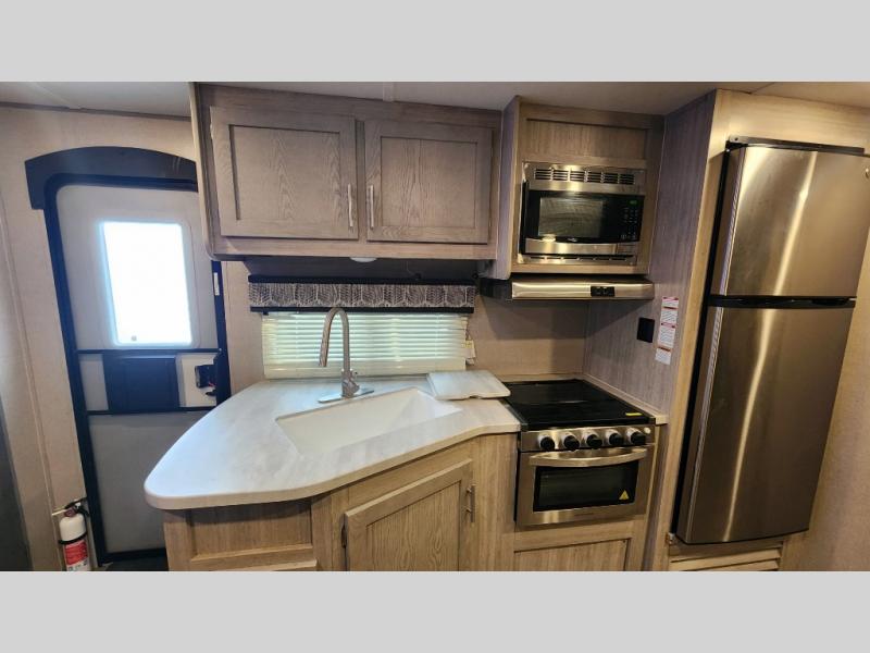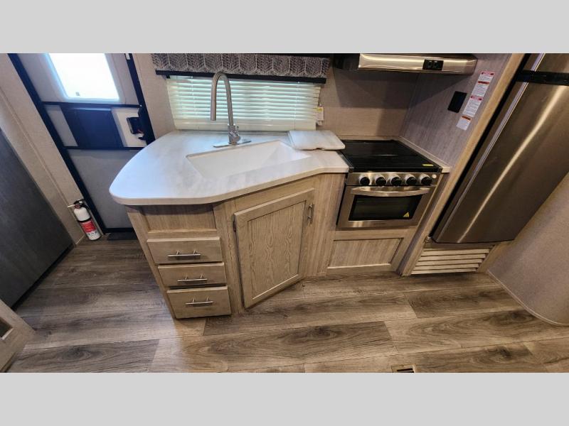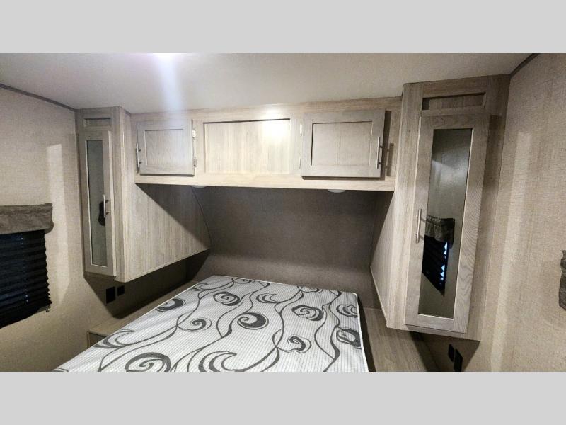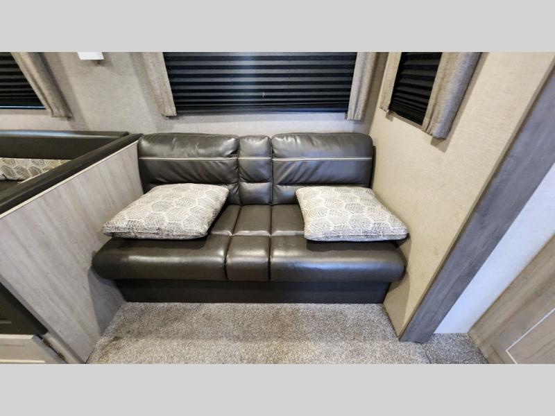 When you enjoy hiking, biking, fishing and/or any type of outdoor activities, and waking up to beautiful scenery from your own comforts, then start camping with this trailer at the campsite! You will be able to sleep like a queen on the walk-around bed with dual wardrobes and overhead storage for more items in the front private bedroom while your family or friends have their own privacy in the bunkhouse complete with two bunks, two COA cube futons and plenty of storage. The full bathroom includes the second entry/exit door for convenience when outside under the 21' electric awning with multicolor LED lights, or while cooking using the full size camper kitchen along the exterior. There are full kitchen amenities inside including a 10 cu. ft. refrigerator and a pantry. And there is a 39" TV to watch and a place to dine and relax on the U-shaped dinette and sofa slide out.