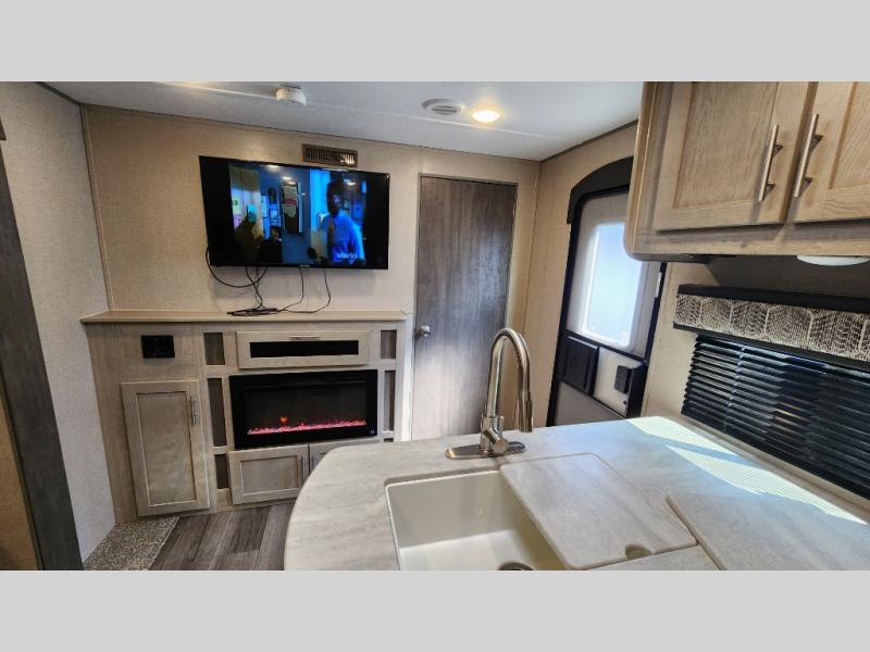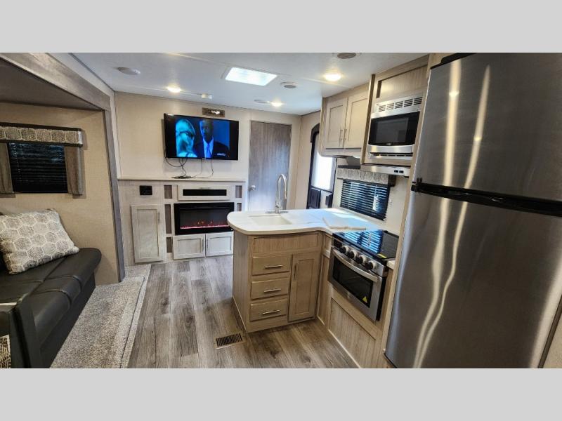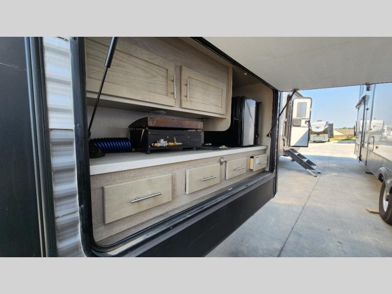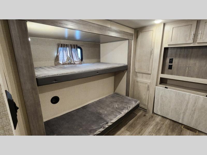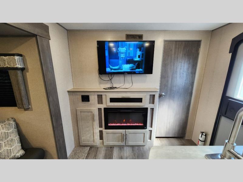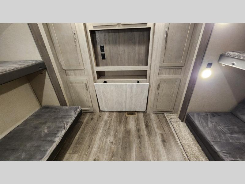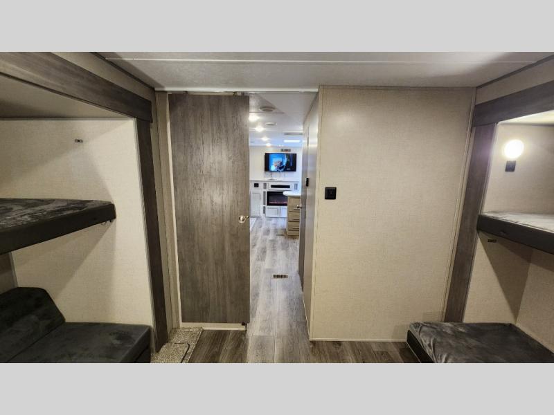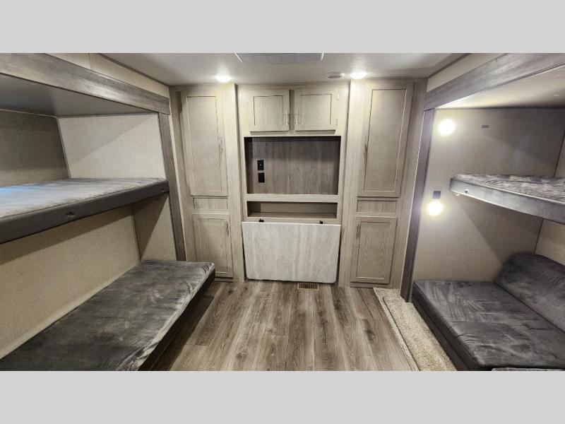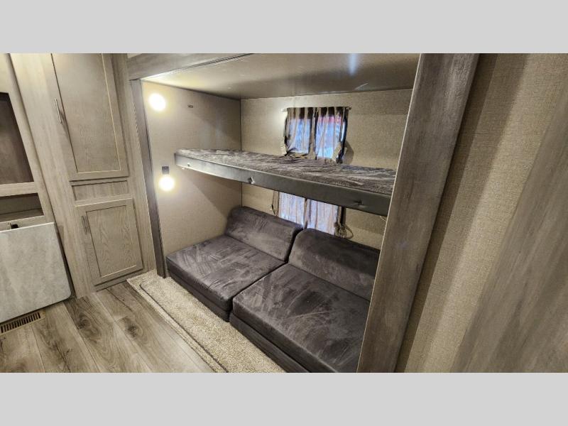 This spacious trailer allows you to unwind and relax indoors after exploring outdoors. Easily setup at the campsite, and enjoy! The rear private bunkhouse offers triple bunks, plus COA cube futon seating, as well as a flip-up table, two closets and an entertainment center. And there are two slides that provide more floor space. Your kids or guests will love having their own room. Your private bedroom is up front on the opposite side, and offers a walk-around queen bed, dual wardrobes and windows for some natural lighting and views. The main living and kitchen area has another slide with a booth dinette and sofa, plus there is an entertainment center with fireplace option. The kitchen amenities include an L-shaped counter, a pantry for dry goods, and everything you need to make warm meals and store leftovers. And there is a full size camper kitchen along the exterior and an electric awning with multicolor LED strip and remote to set the mood for the evening.