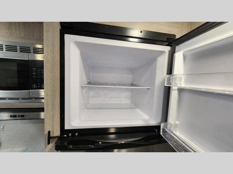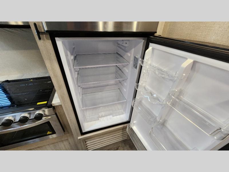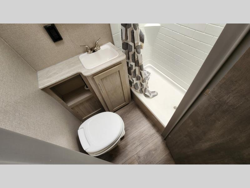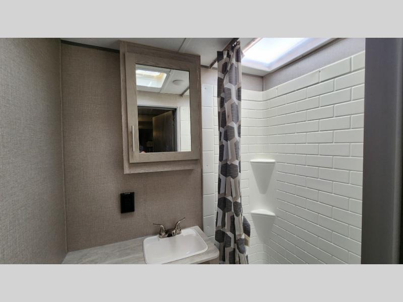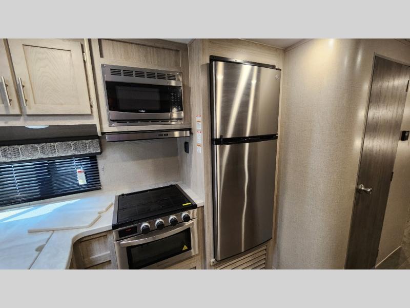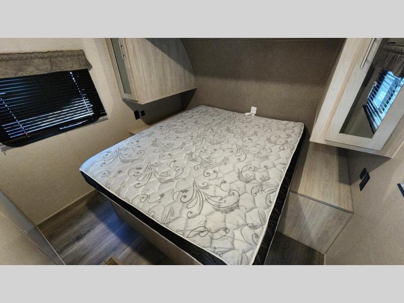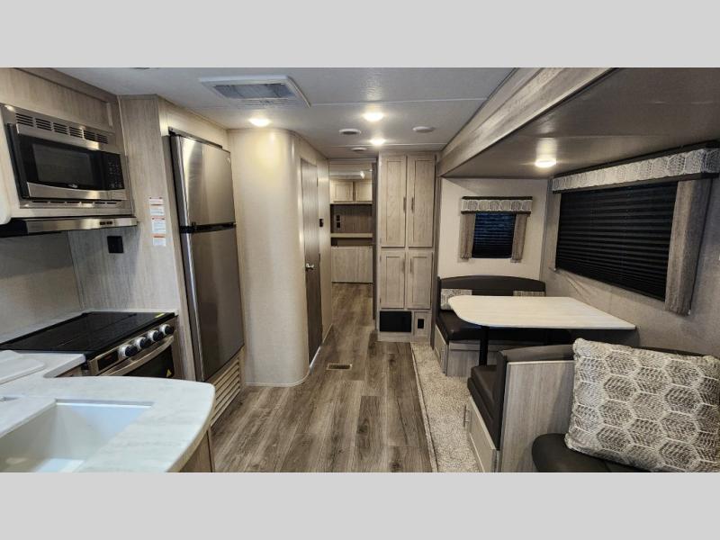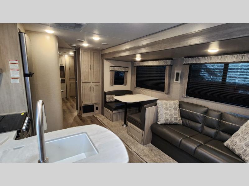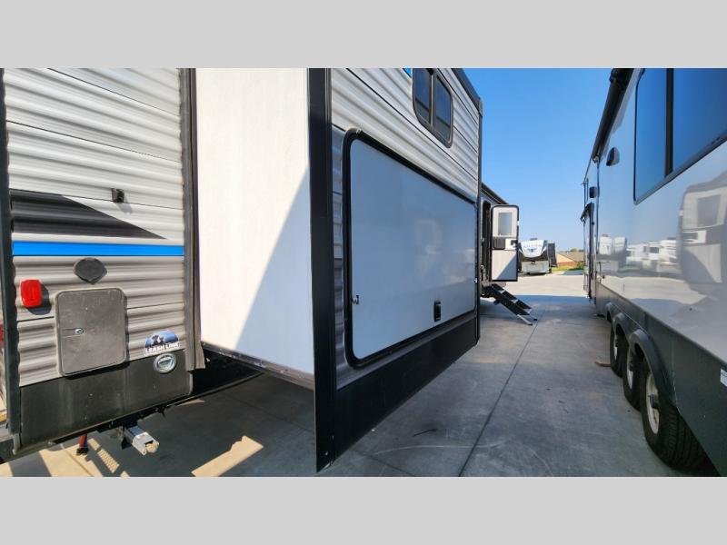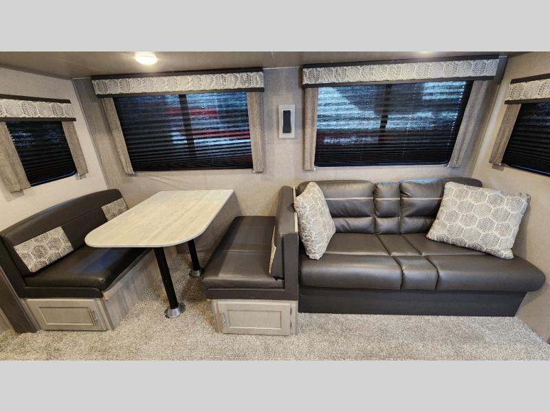 This spacious trailer allows you to unwind and relax indoors after exploring outdoors. Easily setup at the campsite, and enjoy! The rear private bunkhouse offers triple bunks, plus COA cube futon seating, as well as a flip-up table, two closets and an entertainment center. And there are two slides that provide more floor space. Your kids or guests will love having their own room. Your private bedroom is up front on the opposite side, and offers a walk-around queen bed, dual wardrobes and windows for some natural lighting and views. The main living and kitchen area has another slide with a booth dinette and sofa, plus there is an entertainment center with fireplace option. The kitchen amenities include an L-shaped counter, a pantry for dry goods, and everything you need to make warm meals and store leftovers. And there is a full size camper kitchen along the exterior and an electric awning with multicolor LED strip and remote to set the mood for the evening.
