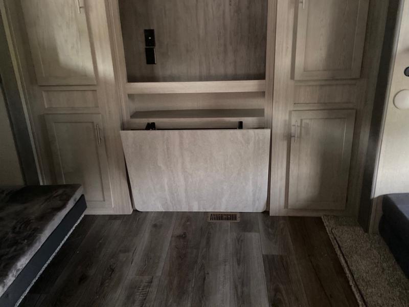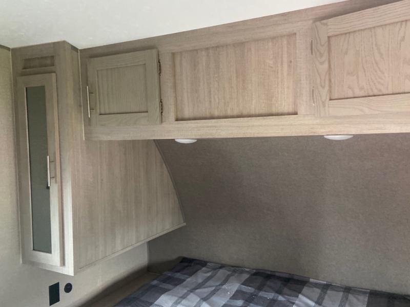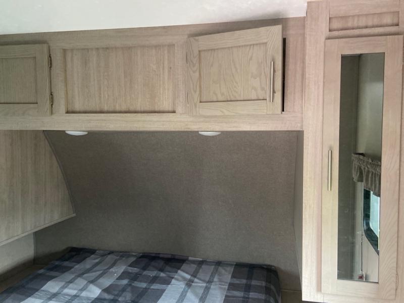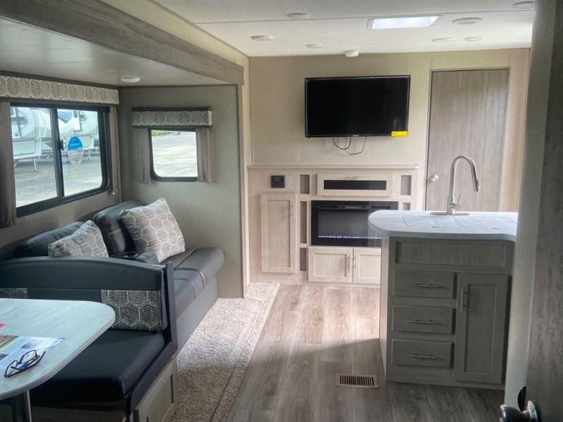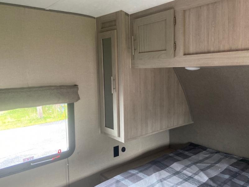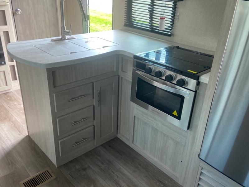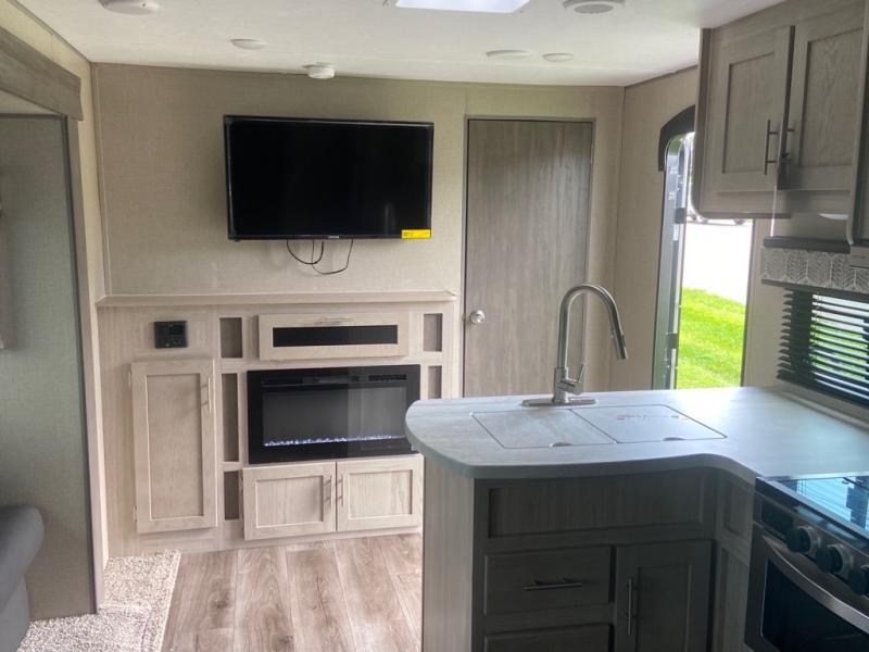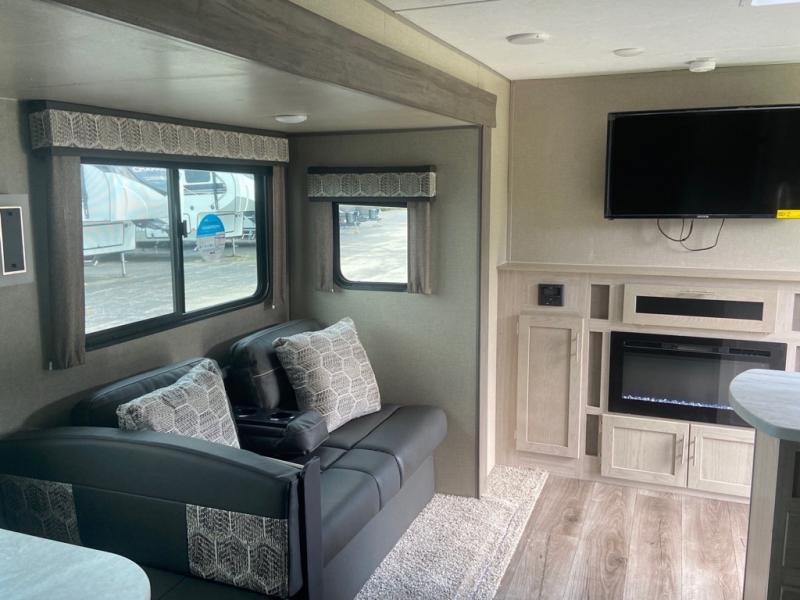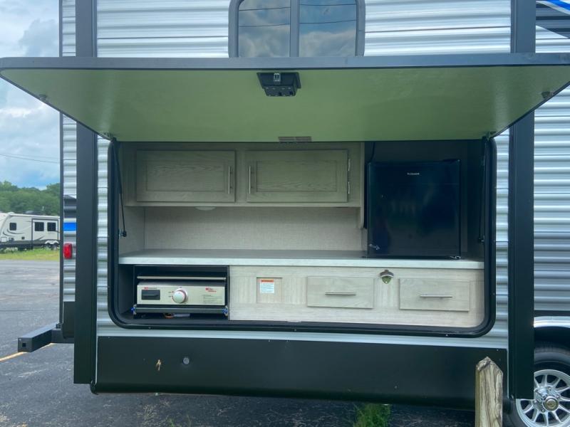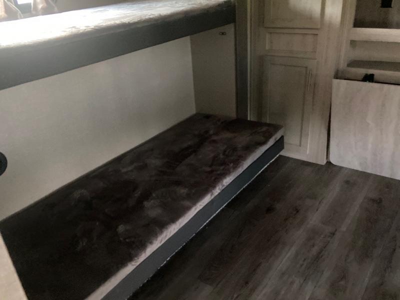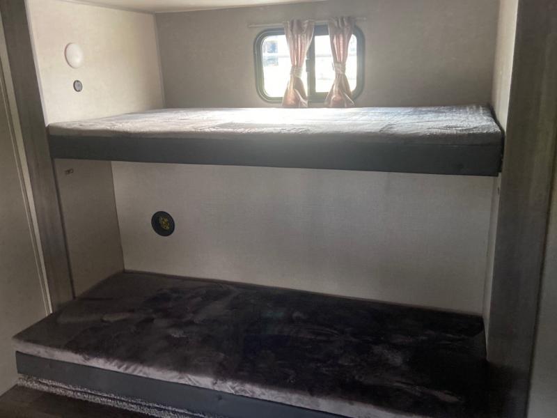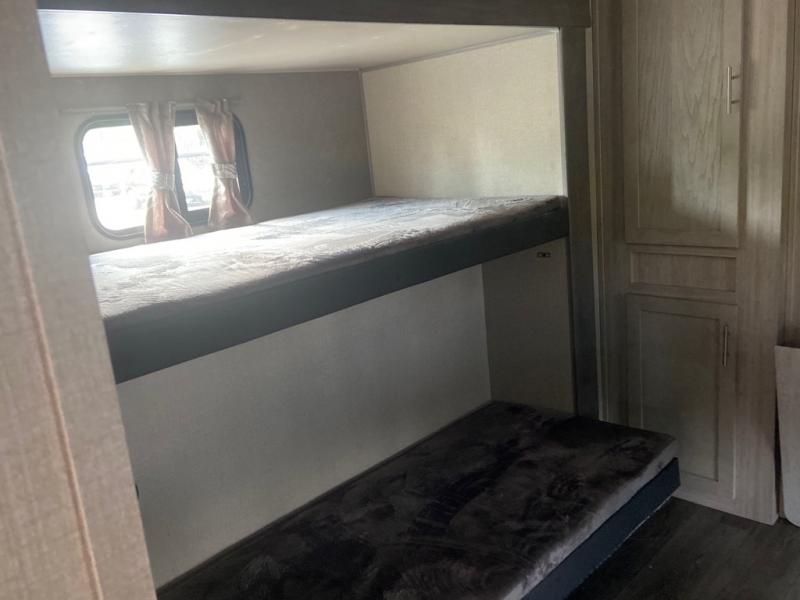 This spacious trailer allows you to unwind and relax indoors after exploring outdoors. Easily setup at the campsite, and enjoy! The rear private bunkhouse offers triple bunks, plus COA cube futon seating, as well as a flip-up table, two closets and an entertainment center. And there are two slides that provide more floor space. Your kids or guests will love having their own room. Your private bedroom is up front on the opposite side, and offers a walk-around queen bed, dual wardrobes and windows for some natural lighting and views. The main living and kitchen area has another slide with a booth dinette and sofa, plus there is an entertainment center with fireplace option. The kitchen amenities include an L-shaped counter, a pantry for dry goods, and everything you need to make warm meals and store leftovers. And there is a full size camper kitchen along the exterior and an electric awning with multicolor LED strip and remote to set the mood for the evening.