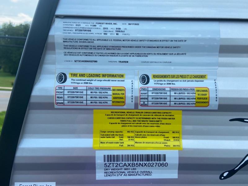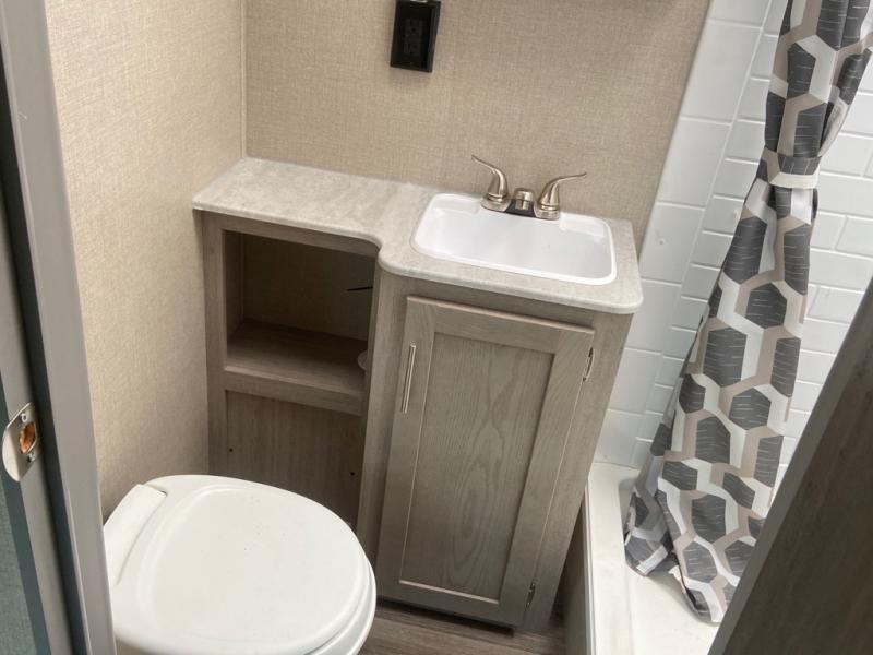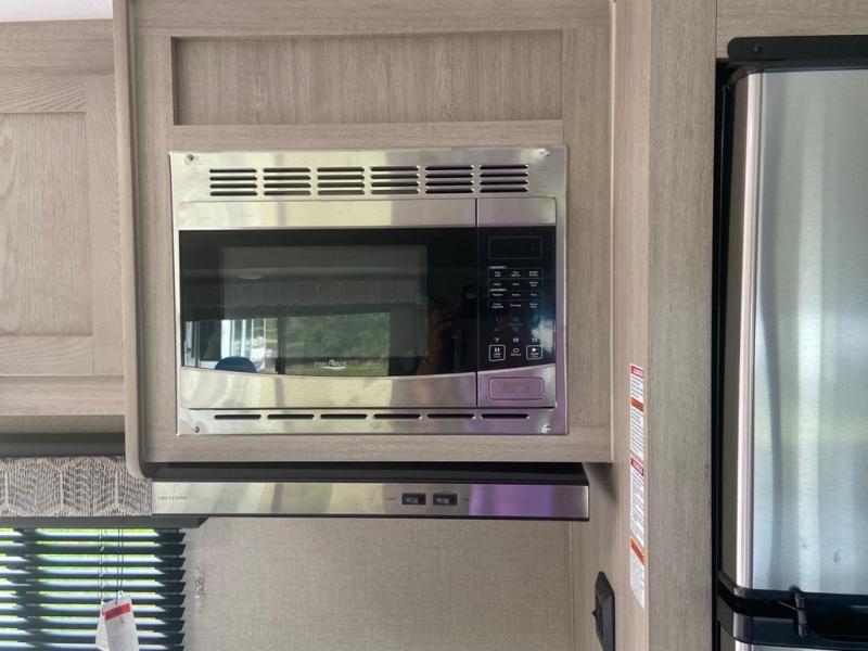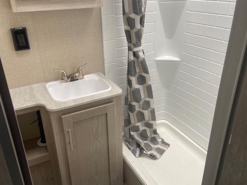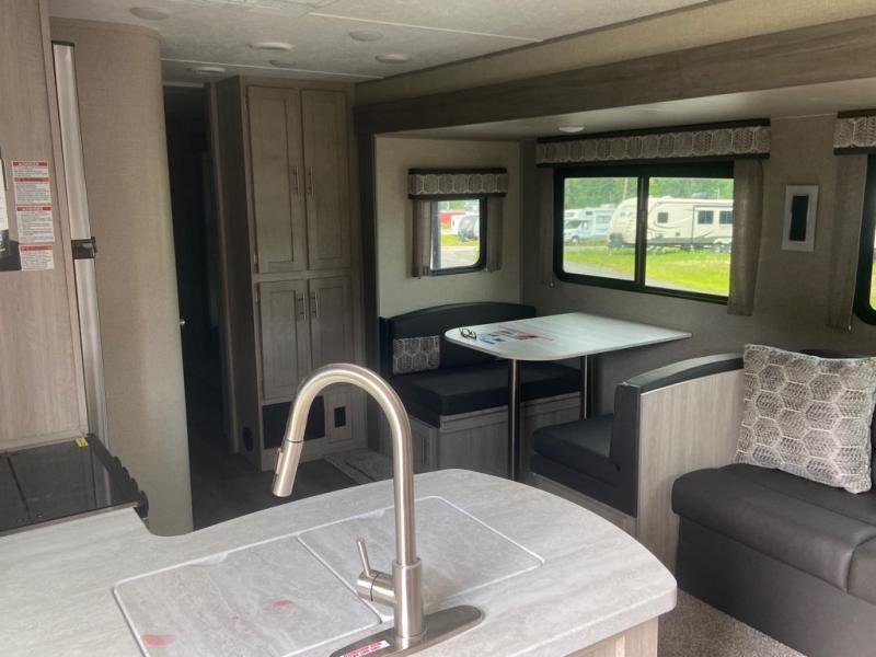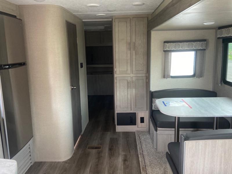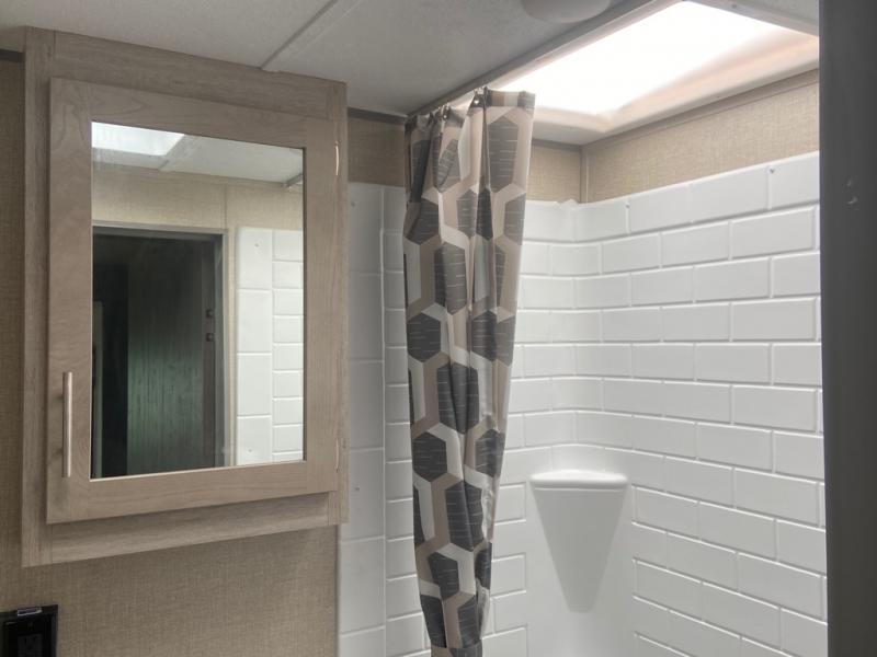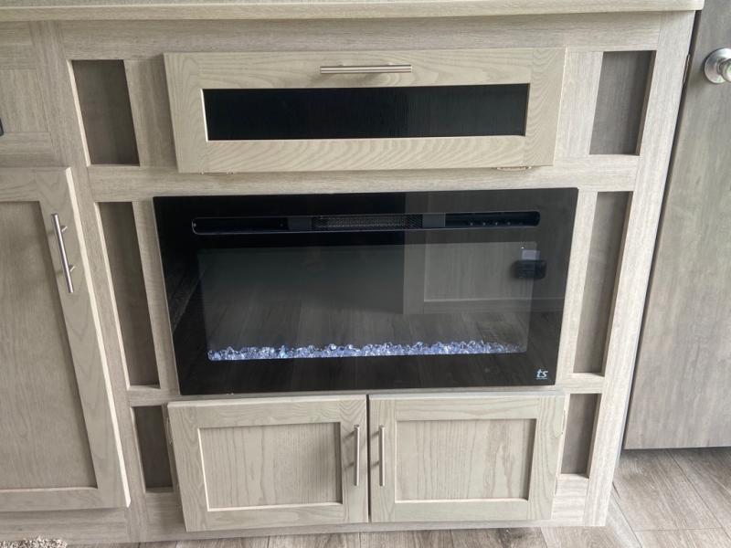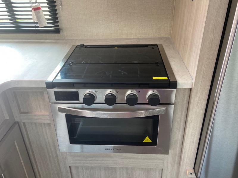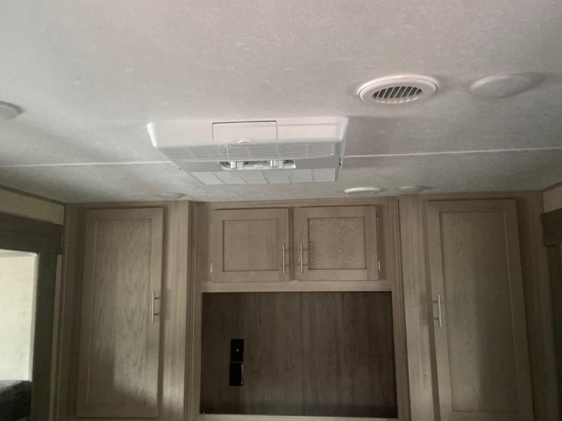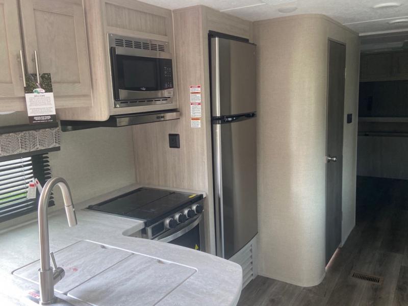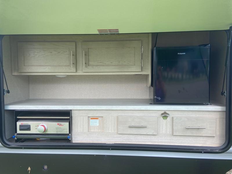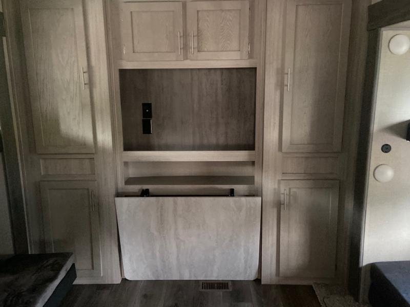 This spacious trailer allows you to unwind and relax indoors after exploring outdoors. Easily setup at the campsite, and enjoy! The rear private bunkhouse offers triple bunks, plus COA cube futon seating, as well as a flip-up table, two closets and an entertainment center. And there are two slides that provide more floor space. Your kids or guests will love having their own room. Your private bedroom is up front on the opposite side, and offers a walk-around queen bed, dual wardrobes and windows for some natural lighting and views. The main living and kitchen area has another slide with a booth dinette and sofa, plus there is an entertainment center with fireplace option. The kitchen amenities include an L-shaped counter, a pantry for dry goods, and everything you need to make warm meals and store leftovers. And there is a full size camper kitchen along the exterior and an electric awning with multicolor LED strip and remote to set the mood for the evening.