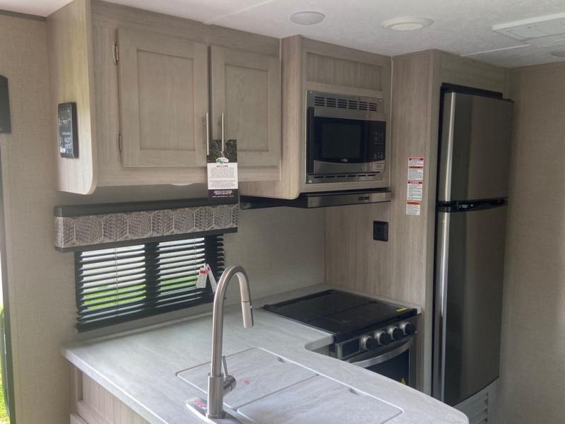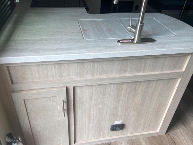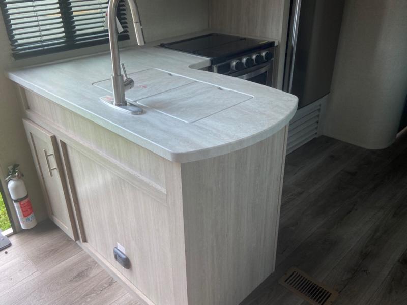 With any Catalina Legacy Edition travel trailer by Coachmen, there is an enclosed, fully sealed underbelly to protect against road debris and help control the interior climate, a seamless Alpha roof membrane, a platinum aluminum exterior, a smooth HD aluminum radius front, and polished HD aluminum fender skirts, plus upgraded aluminum wheels. The interior includes seamless Thermofoil countertops throughout, an under-mount farm style sink with residential kitchen faucet with pull down sprayer to easily clean the fruits and veggies as well as the dishes, full length kitchen drawer guides, and an All-In-One monitor panel system.