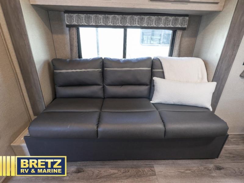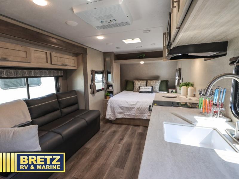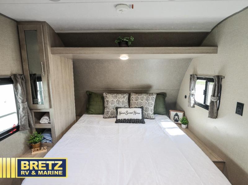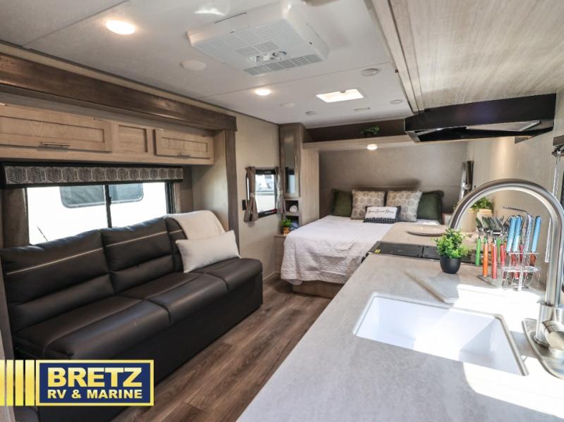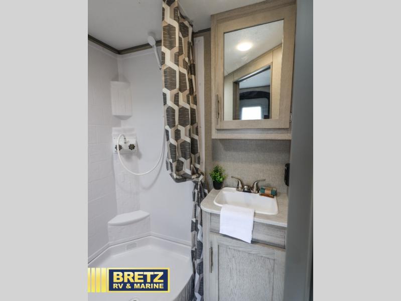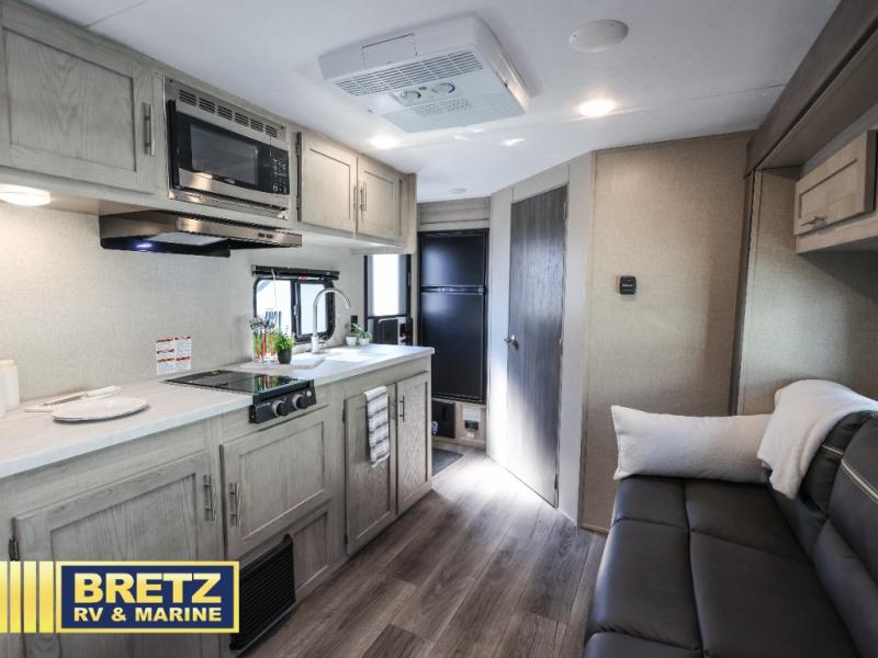 When you're ready to escape the hustle and bustle of the city life, head to the woods in this cozy travel trailer for two. The sofa slide out with a table will provide a place to relax, eat, and even sleep an overnight guest. Preparing at-home meals each day will be a breeze with a two burner cooktop and a microwave oven, plus there is ample counter space for your work in the kitchen. The spacious full bath on board means you won't have to use the camp's facilities, and the front queen bed will make this model feel just like home. After dinner is cleaned up, head outdoors to relax under the 15' electric awning with multicolored LED lights and a remote. Camping has never been easier!