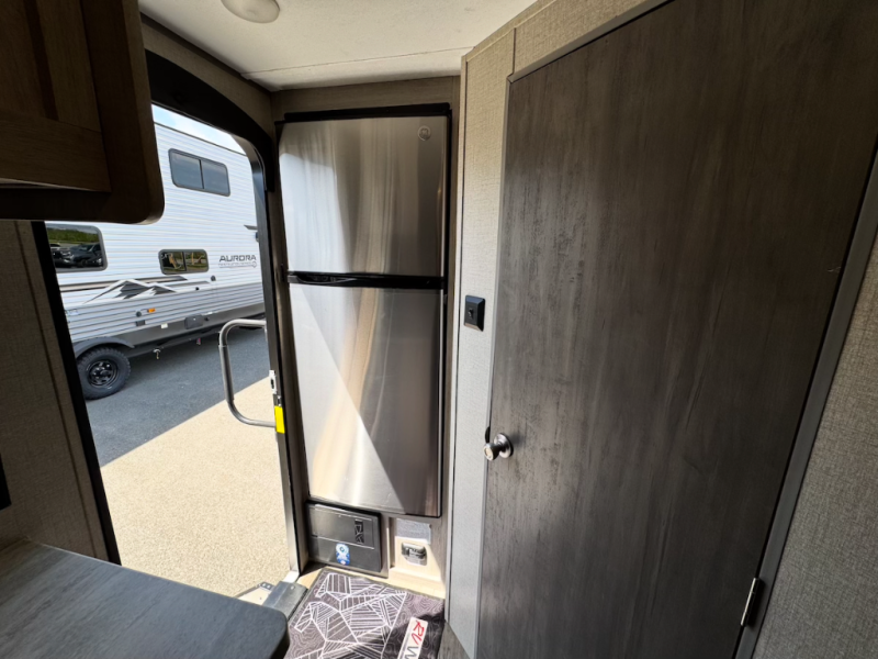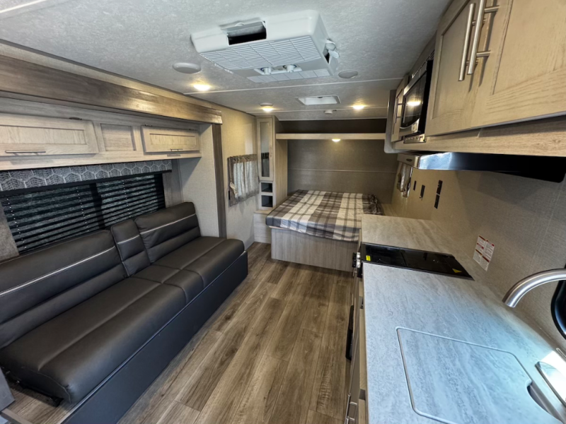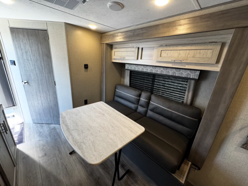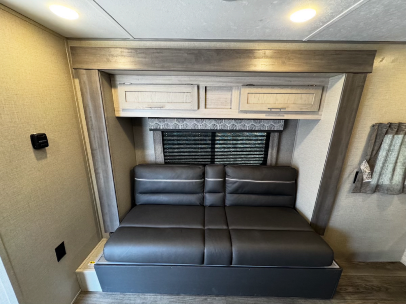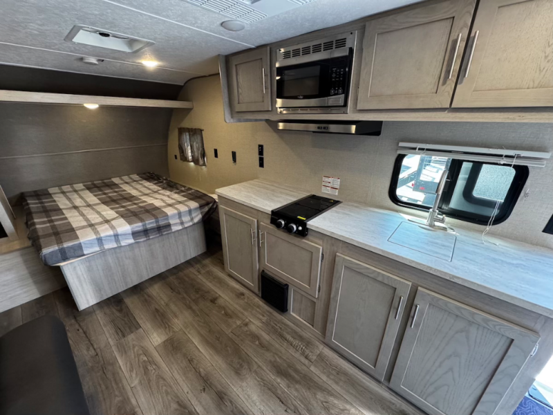 When you're ready to escape the hustle and bustle of the city life, head to the woods in this cozy travel trailer for two. The sofa slide out with a table will provide a place to relax, eat, and even sleep an overnight guest. Preparing at-home meals each day will be a breeze with a two burner cooktop and a microwave oven, plus there is ample counter space for your work in the kitchen. The spacious full bath on board means you won't have to use the camp's facilities, and the front queen bed will make this model feel just like home. After dinner is cleaned up, head outdoors to relax under the 15' electric awning with multicolored LED lights and a remote. Camping has never been easier!