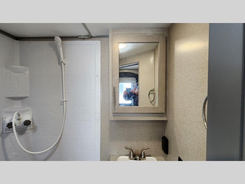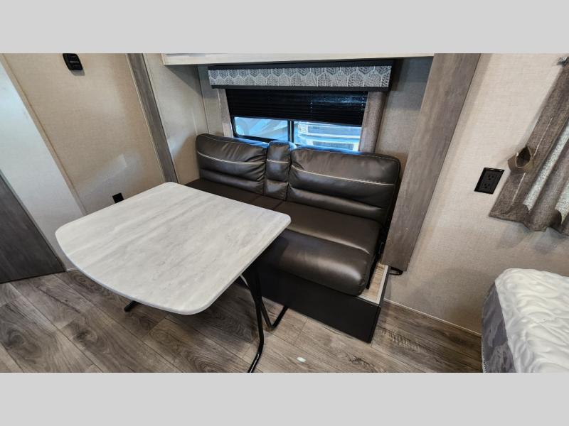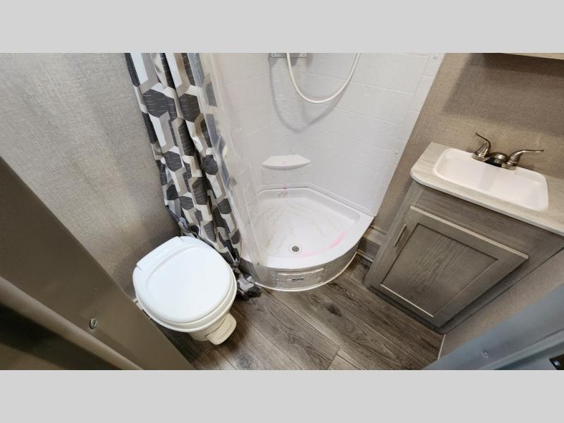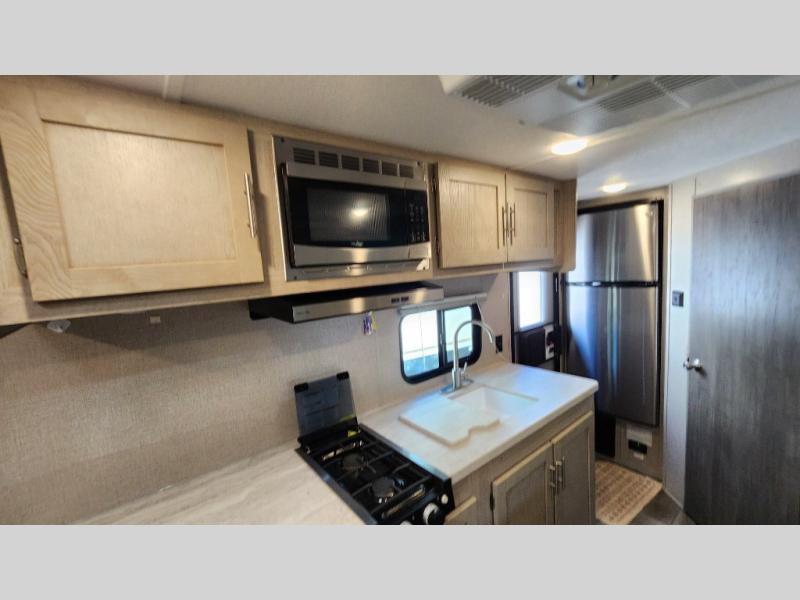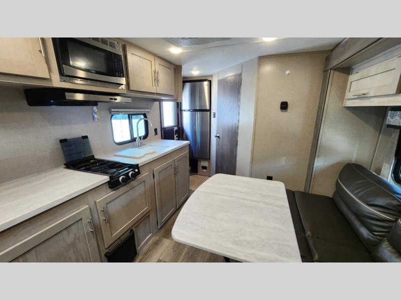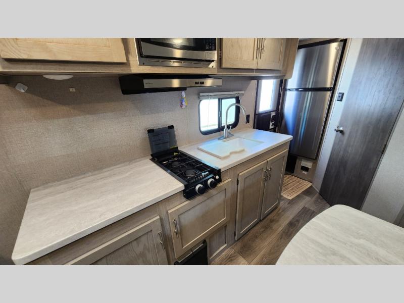 When you're ready to escape the hustle and bustle of the city life, head to the woods in this cozy travel trailer for two. The sofa slide out with a table will provide a place to relax, eat, and even sleep an overnight guest. Preparing at-home meals each day will be a breeze with a two burner cooktop and a microwave oven, plus there is ample counter space for your work in the kitchen. The spacious full bath on board means you won't have to use the camp's facilities, and the front queen bed will make this model feel just like home. After dinner is cleaned up, head outdoors to relax under the 15' electric awning with multicolored LED lights and a remote. Camping has never been easier!