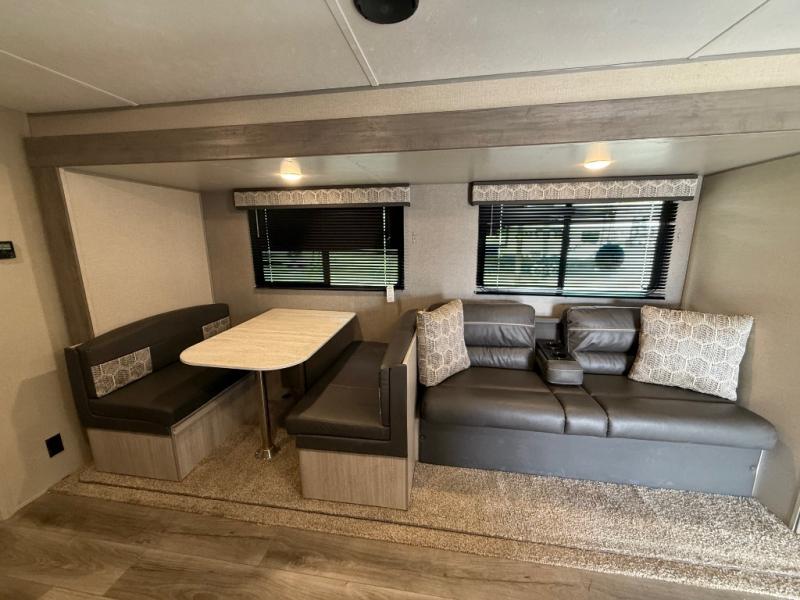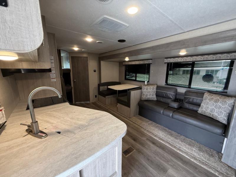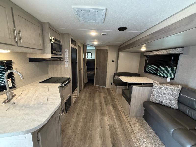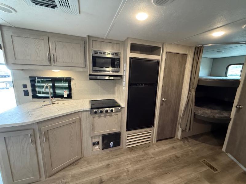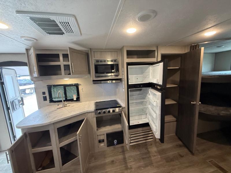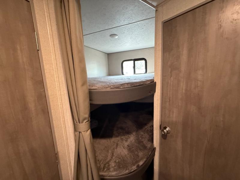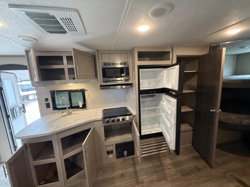 This is the perfect mid-size travel trailer for you and your family! The 49" x 70" double over double bunk beds offer a comfortable sleeping space for the kids and you will have your own private sleeping space with the 60" x 74" queen bed in the front private bedroom. Freshen up each morning in the rear corner bathroom with the tub/shower which has a skylight above it for more headroom and natural lighting. You can prepare your best home cooked meals with the three burner cooktop and 10 cu. ft. refrigerator then enjoy them together at the booth dinette. The sofa has cupholders for you to set your drink while you watch your favorite movie with the entertainment center. Don't leave any of your outdoor gear behind either thanks to the front pass-through storage area and the exterior outside storage area!