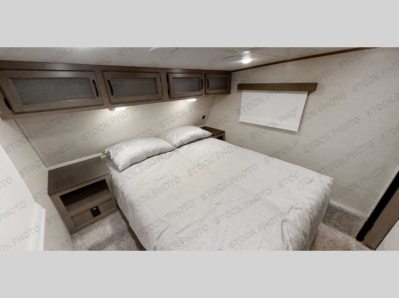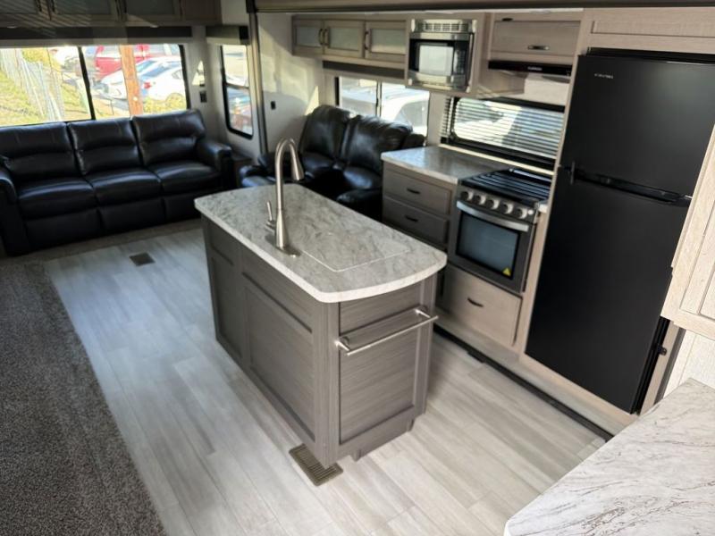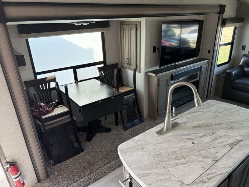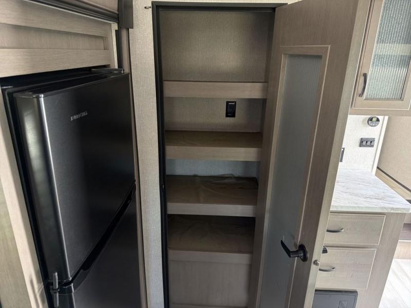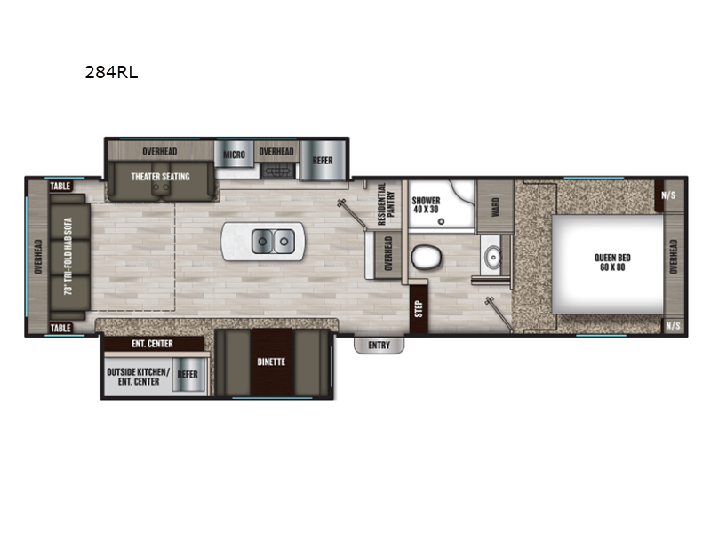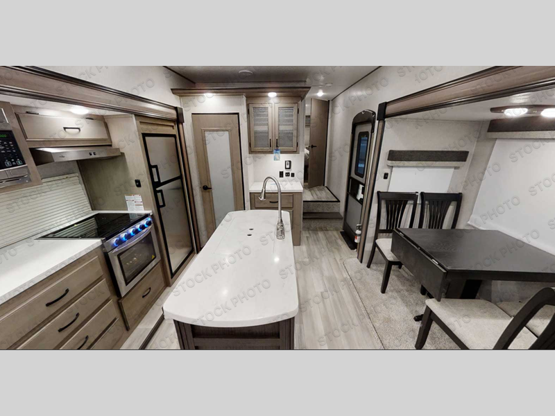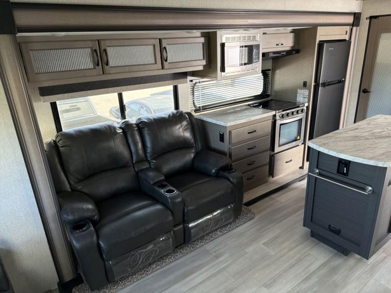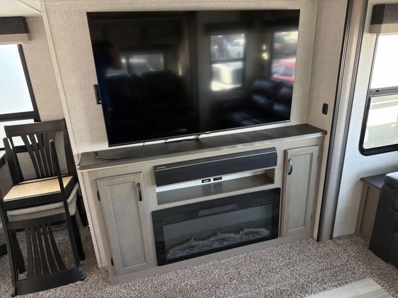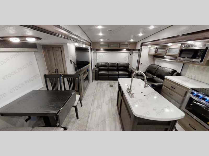 You will feel right at home while camping in this fifth wheel! The front private bedroom has a queen bed to lay your head on at night and nightstands on either side to set your glass of water. The chef can prepare their best meals either indoors with the three burner cooktop or head to the outside kitchen and breathe in some fresh air while they cook, plus there is an exterior entertainment center to watch the big game outdoors too. Enjoy all of your meals at the booth dinette and then play a card game, but if you're not one for games then you can grab a snack from the residential pantry and relax in the rear living area on either the rear 78" tri-fold hide-a-bed sofa or the theater seating across from the entertainment center. After a fun day at the beach, you can rinse the sand out of your hair in the 40" x 30" shower with a seat in the full bathroom!