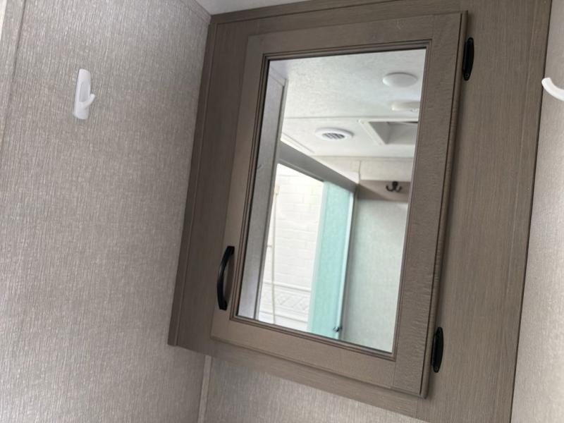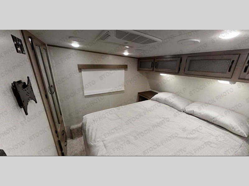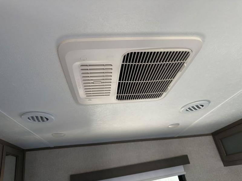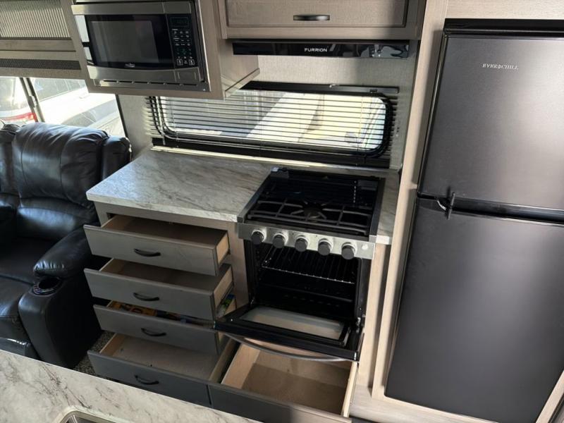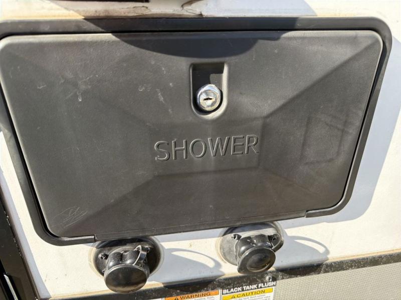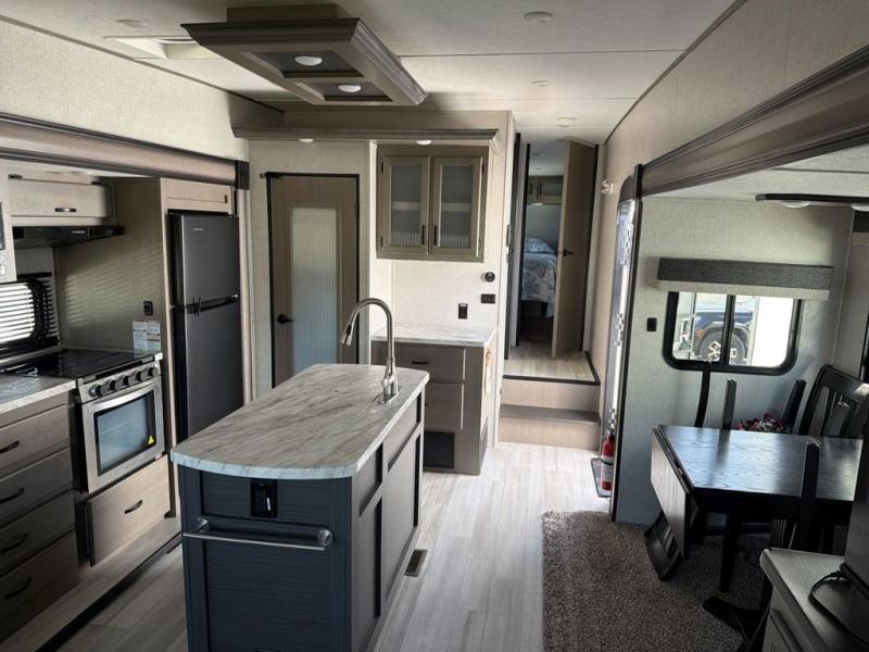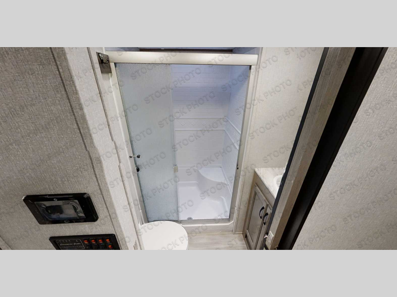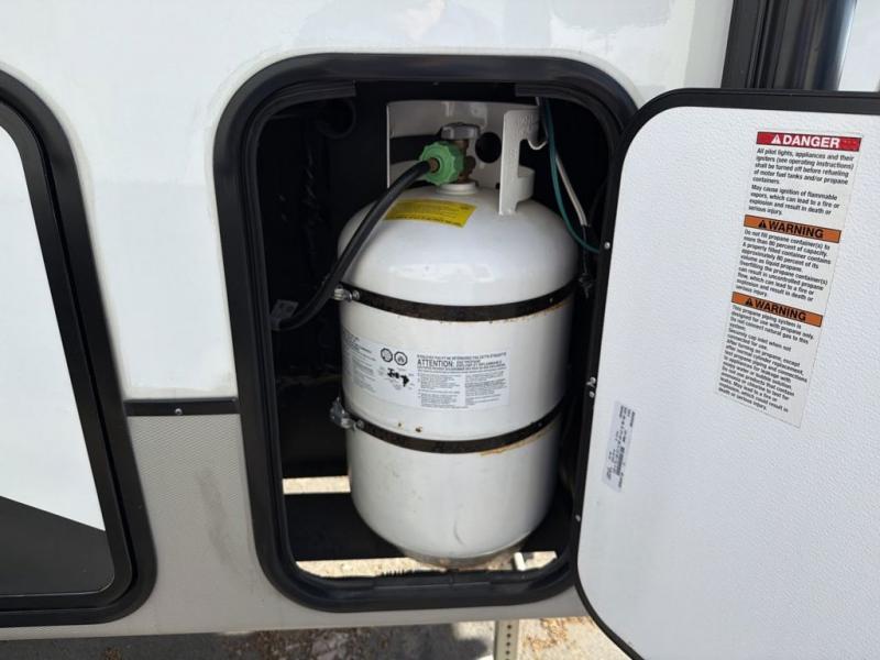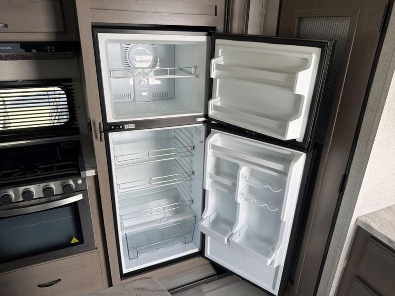You will feel right at home while camping in this fifth wheel! The front private bedroom has a queen bed to lay your head on at night and nightstands on either side to set your glass of water. The chef can prepare their best meals either indoors with the three burner cooktop or head to the outside kitchen and breathe in some fresh air while they cook, plus there is an exterior entertainment center to watch the big game outdoors too. Enjoy all of your meals at the booth dinette and then play a card game, but if you're not one for games then you can grab a snack from the residential pantry and relax in the rear living area on either the rear 78" tri-fold hide-a-bed sofa or the theater seating across from the entertainment center. After a fun day at the beach, you can rinse the sand out of your hair in the 40" x 30" shower with a seat in the full bathroom!