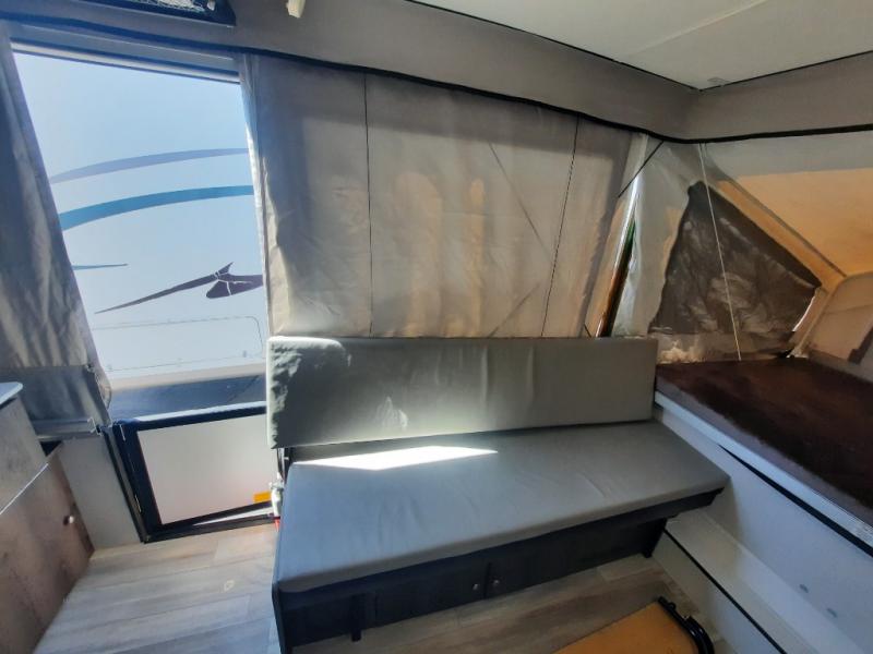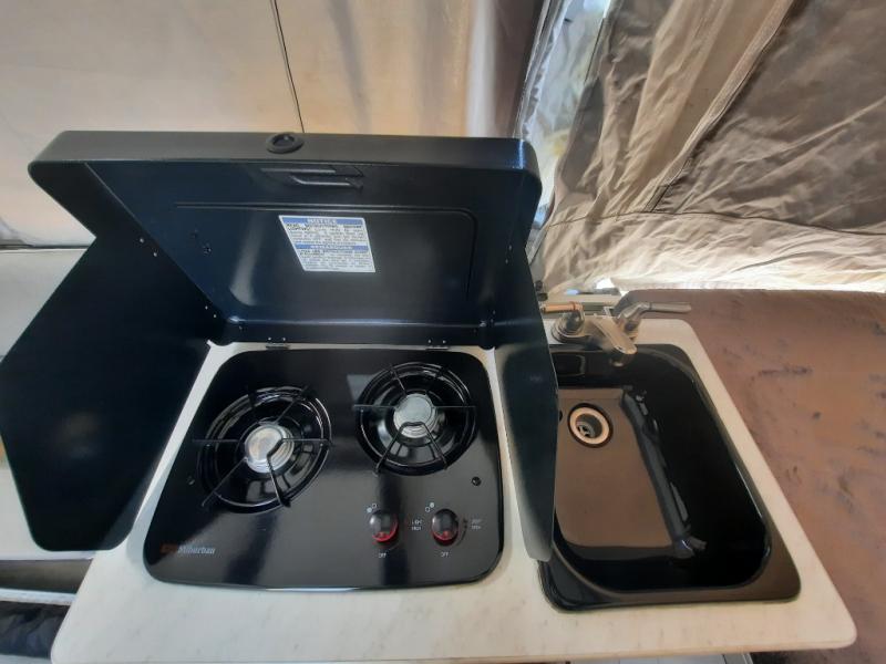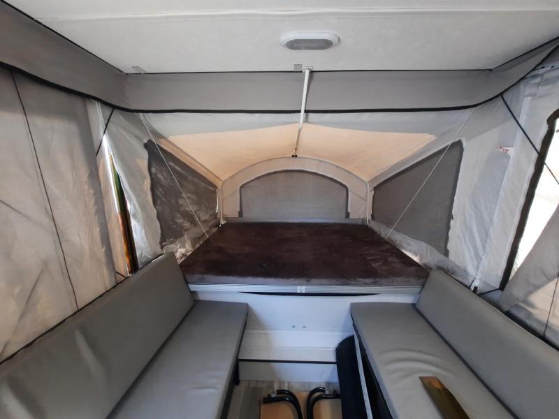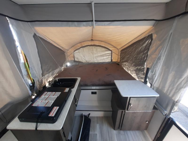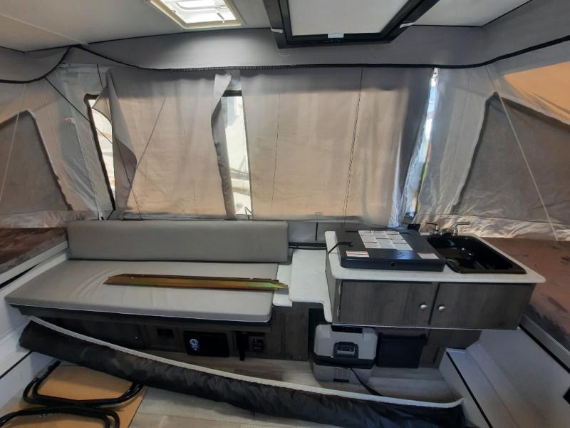 Get out and explore all the state parks easily with this easy to load, set up, tow and store folding pop-up. If you enjoy relaxing outside, the awning offers some protection from the elements, and if you enjoy relaxing inside, the 70" gauchos will provide that comfort. You can cook meals using the two burner range and wash dishes in the deep bowl acrylic sink, and the residential laminated countertop offers space to place your things. You might even like to choose the optional Off-Road package offering 15" off-road tires and a spare, plus length stabilizing extended jacks and more for you to explore even further each trip!