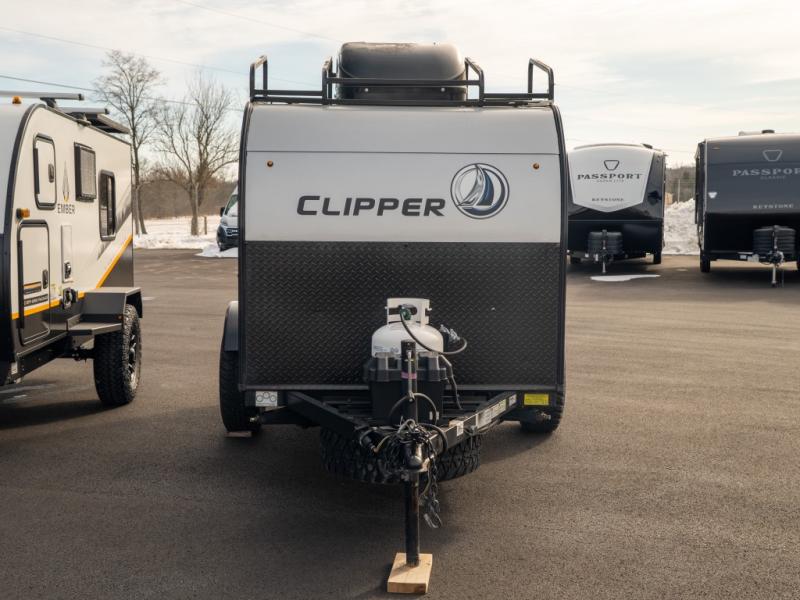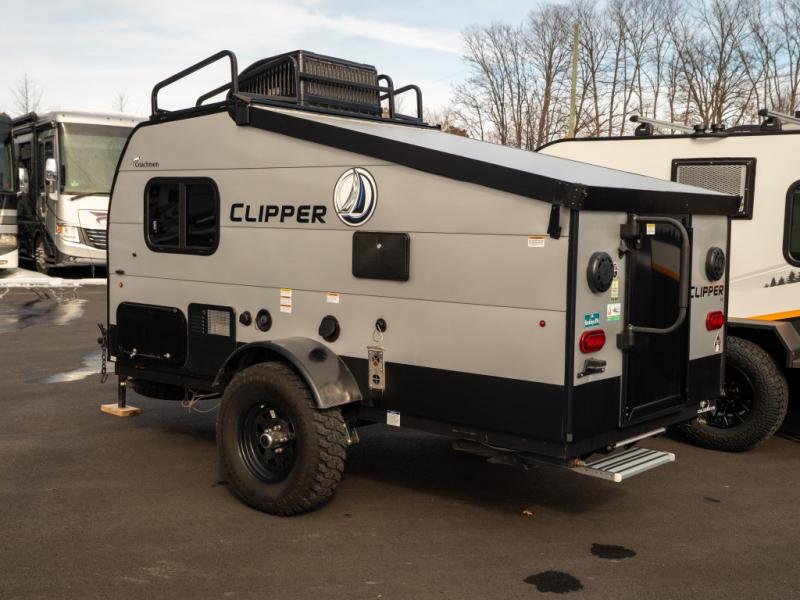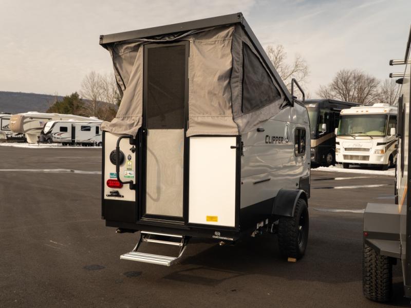 Each Clipper Camping Trailers Express hybrid folding pop-up by Coachmen is built on an E-coated tubular steel frame with a Wide Trac ultra lube spring axle, a laminated fiberglass roof, and durable, automotive grade metal exterior walls. The inside offers Dark Ash cabinetry, 100% adhesion residential grade linoleum, and residential laminated countertops plus more depending on the Express you choose. Enjoy the easiest way to get up and go camping with a lightweight Clipper Express that is towable by most cars, crossovers, and small SUVS.