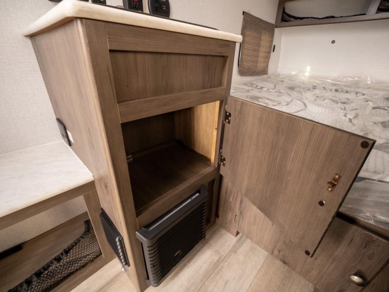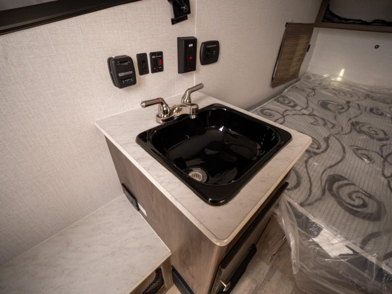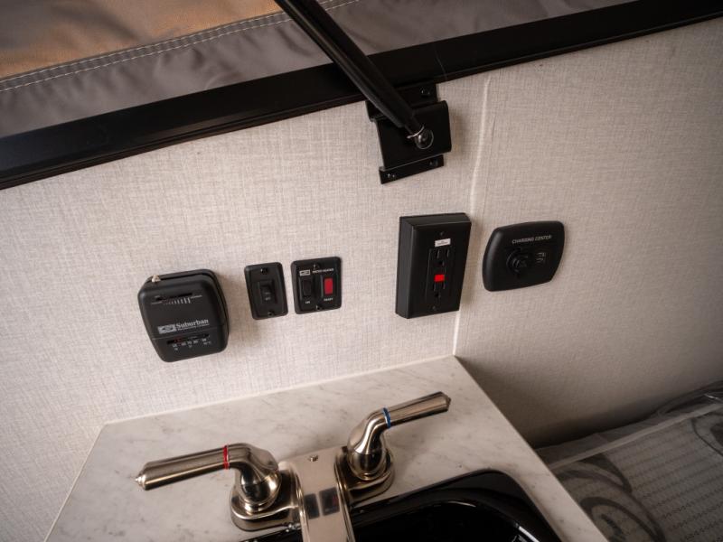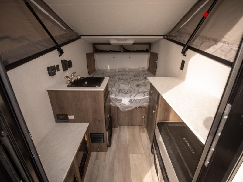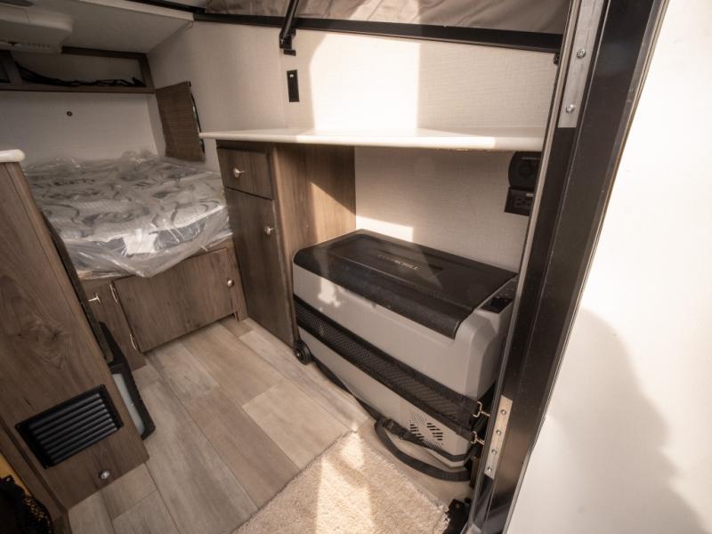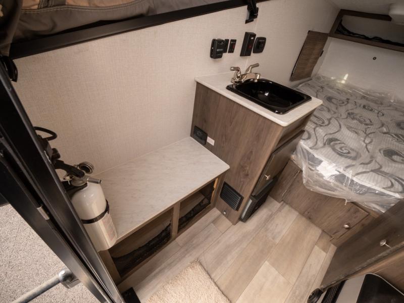 When you enjoy sleeping above ground while camping and getting away quickly, take this Express with you! Not only is it easy to tow, it is easy to store! You will have a 54" x 74" bed to sleep on, a residential laminated countertop to place your cellphone and keys, and a bench seat to easily take your shoes off. You can stand upright and walk around as well. Some options you might want to add include the optional "Jack It" bike rack so you can ride some trails, a 13,500 BTU air conditioner to stay cool on those hot summer days, and a Thetford Porta Potti so you don't have to use public facilities. There is even an optional Off-Road package for even more convenience!