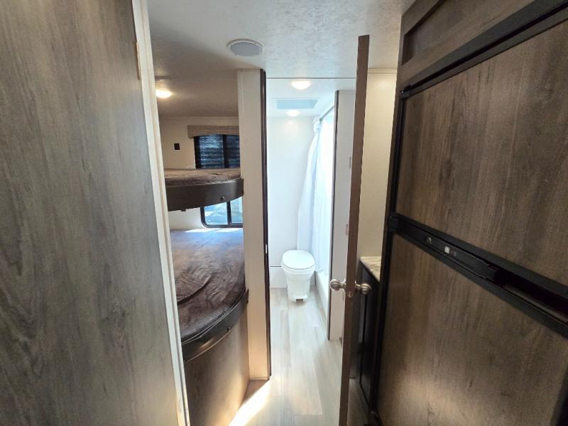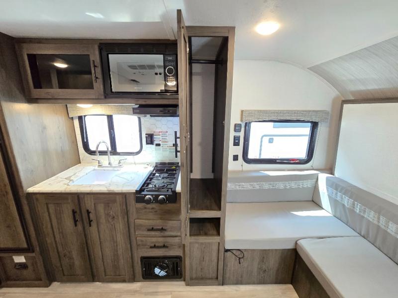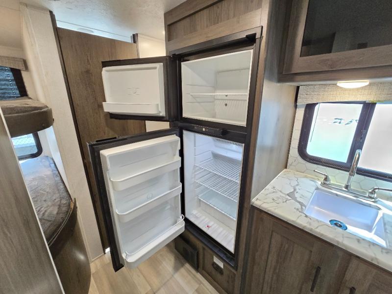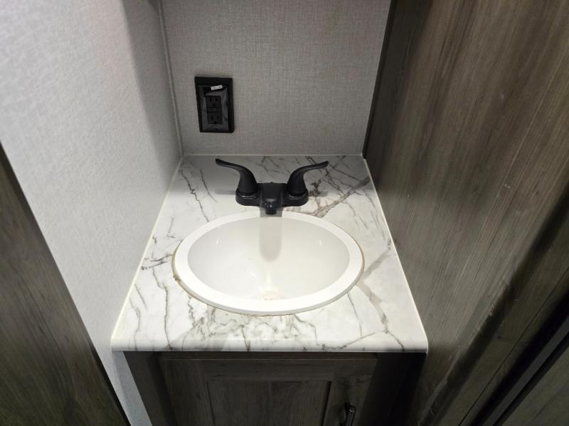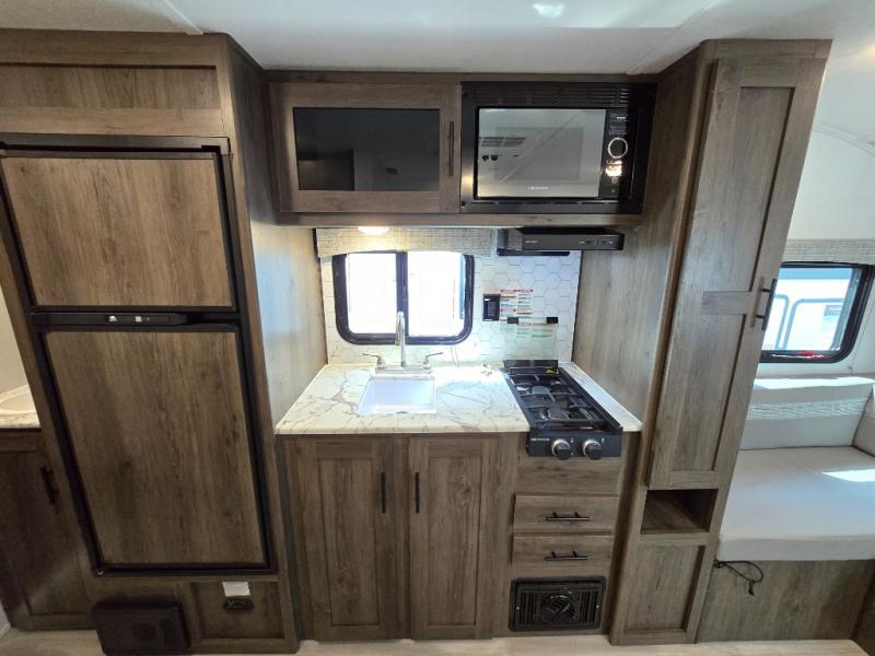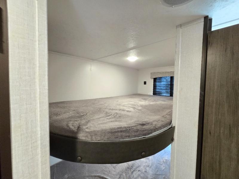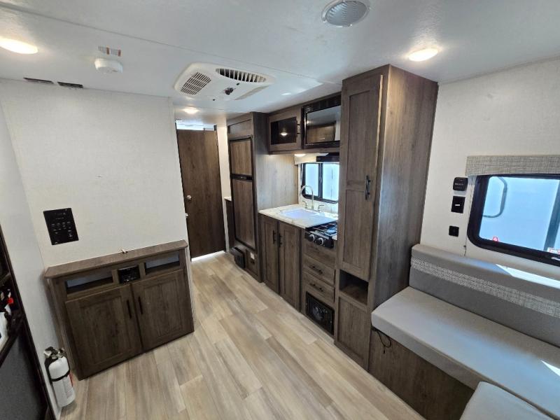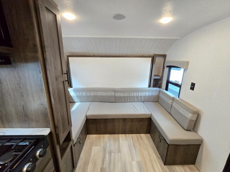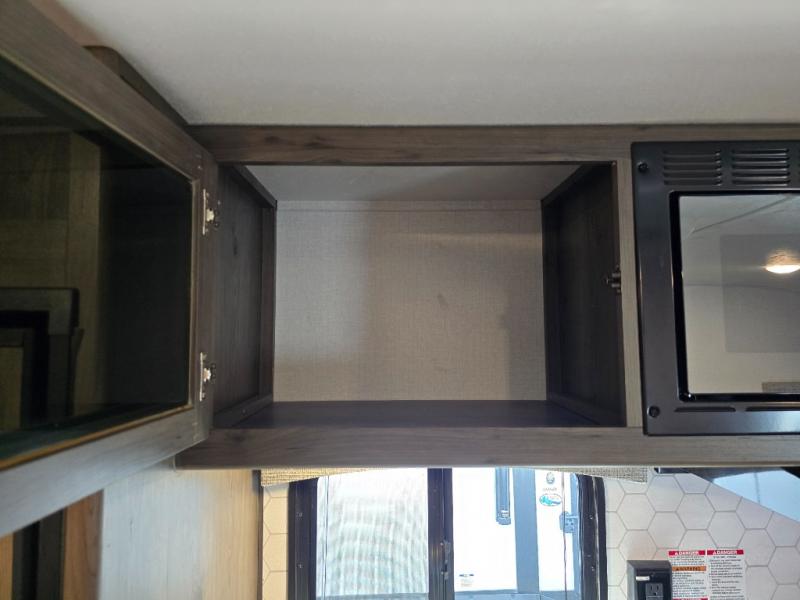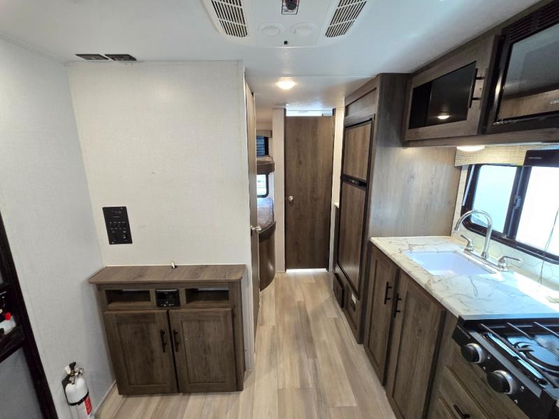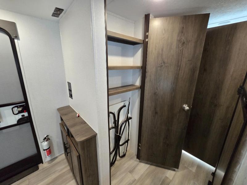 The chef will love cooking at the outside kitchen of this travel trailer! The inside kitchen is fully equipped too with a two burner cooktop, a 7 cu. ft. gas/electric refrigerator, an undermount sink with sink cover, and a pantry with upper bunk storage space. There is also a vanity, a wardrobe, and a linen closet inside the rear corner bathroom for your storage needs. The kiddos can sleep on the set of 42" x 74" bunk beds and you can sleep on the front 75" x 54" Murphy bed which transforms into a U-shaped dinette with a free standing table. Watch your favorite movies at night with the entertainment center too!