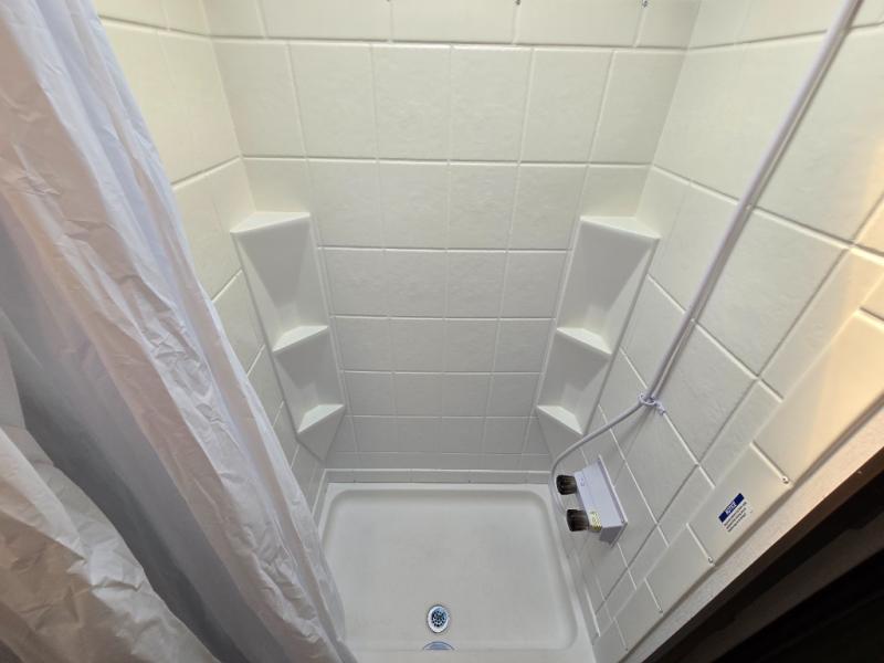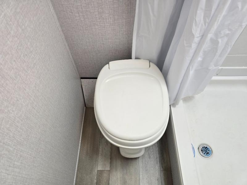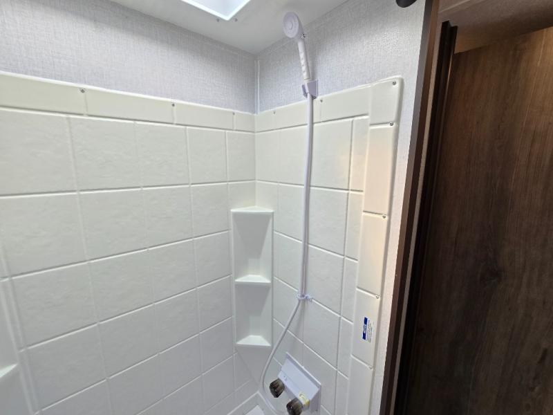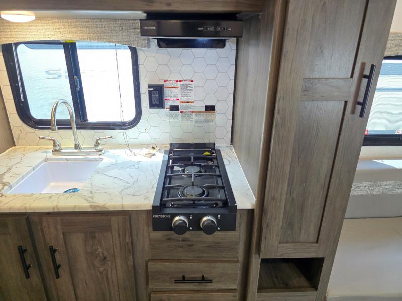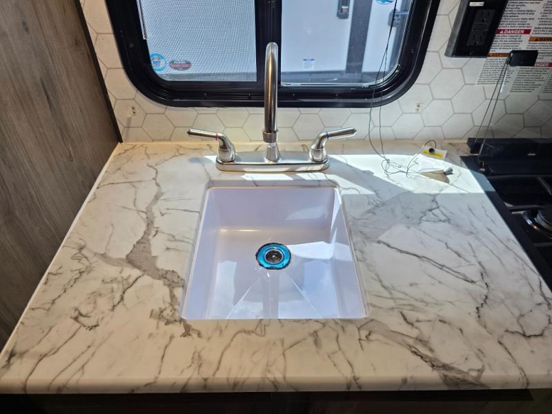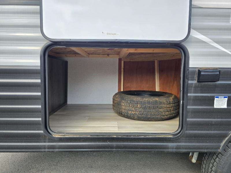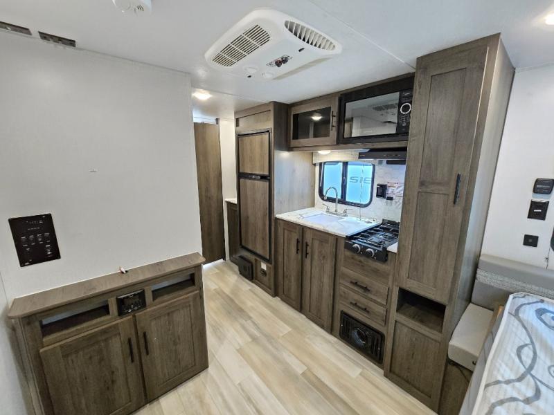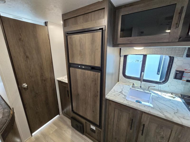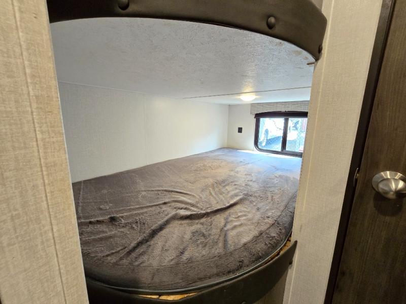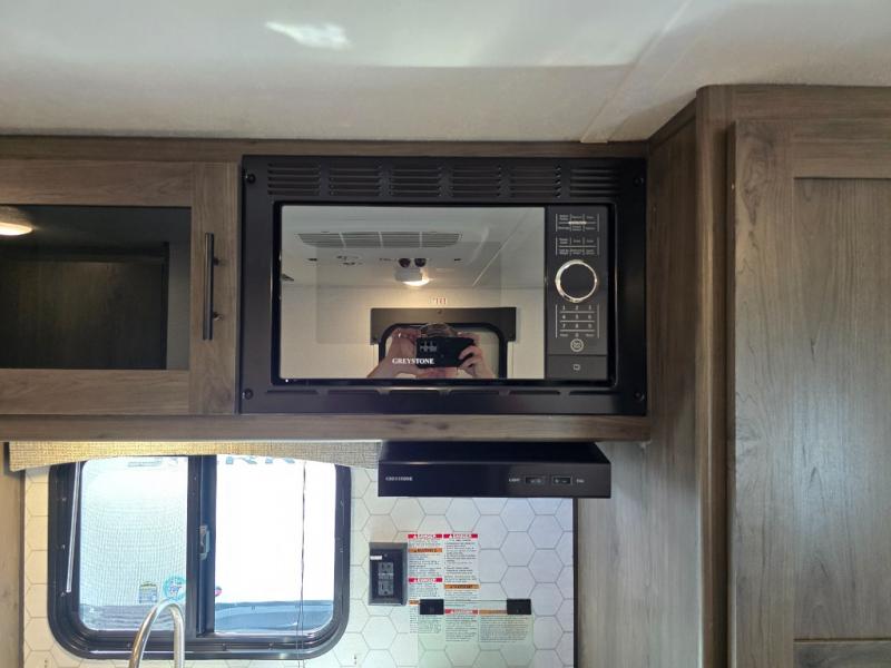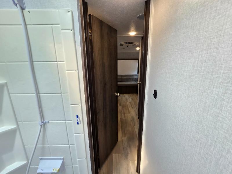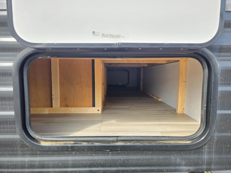 The chef will love cooking at the outside kitchen of this travel trailer! The inside kitchen is fully equipped too with a two burner cooktop, a 7 cu. ft. gas/electric refrigerator, an undermount sink with sink cover, and a pantry with upper bunk storage space. There is also a vanity, a wardrobe, and a linen closet inside the rear corner bathroom for your storage needs. The kiddos can sleep on the set of 42" x 74" bunk beds and you can sleep on the front 75" x 54" Murphy bed which transforms into a U-shaped dinette with a free standing table. Watch your favorite movies at night with the entertainment center too!