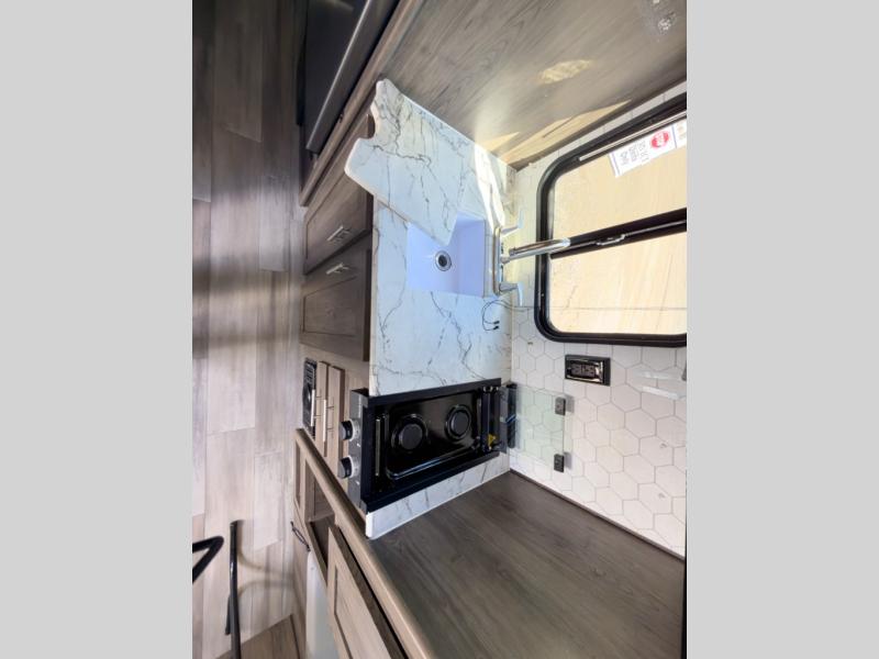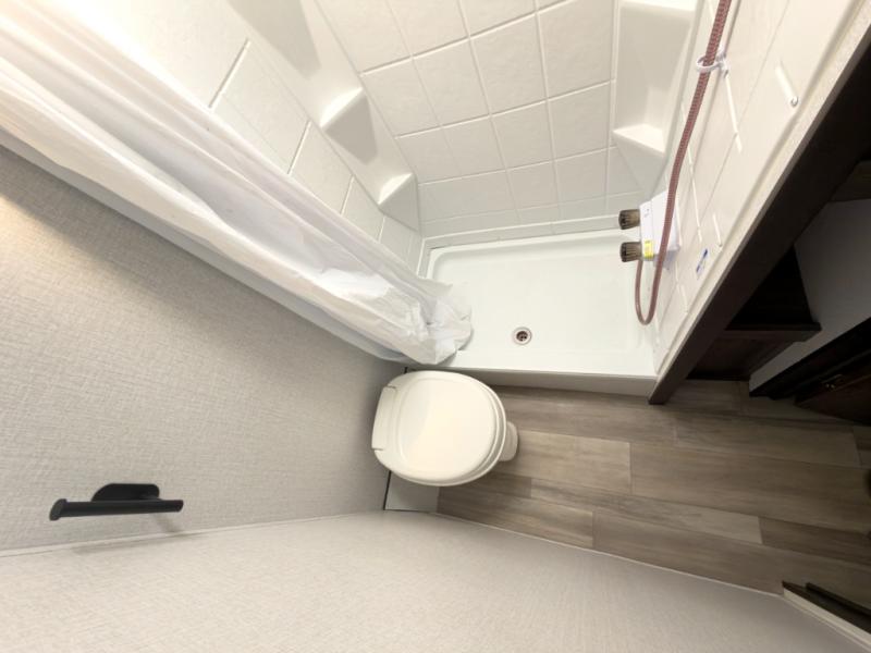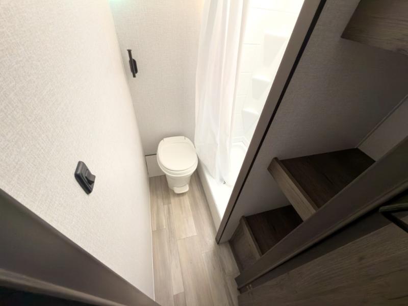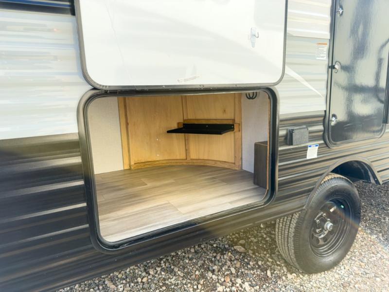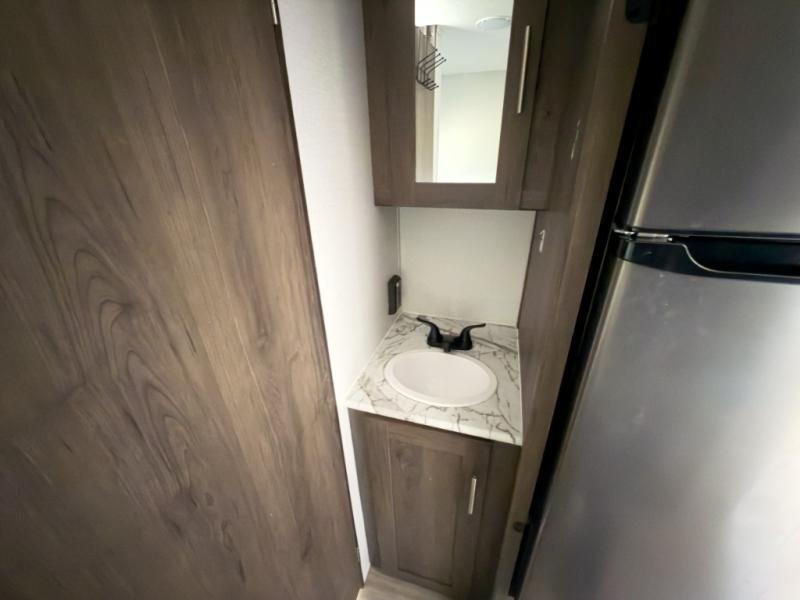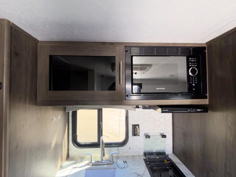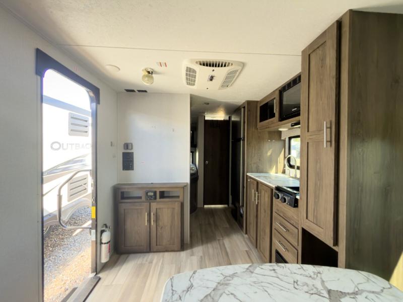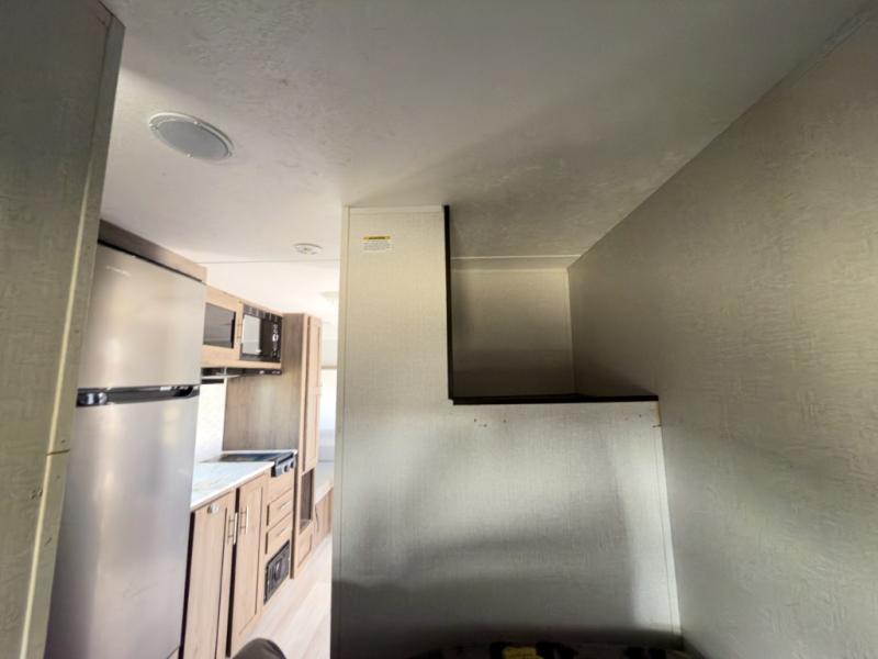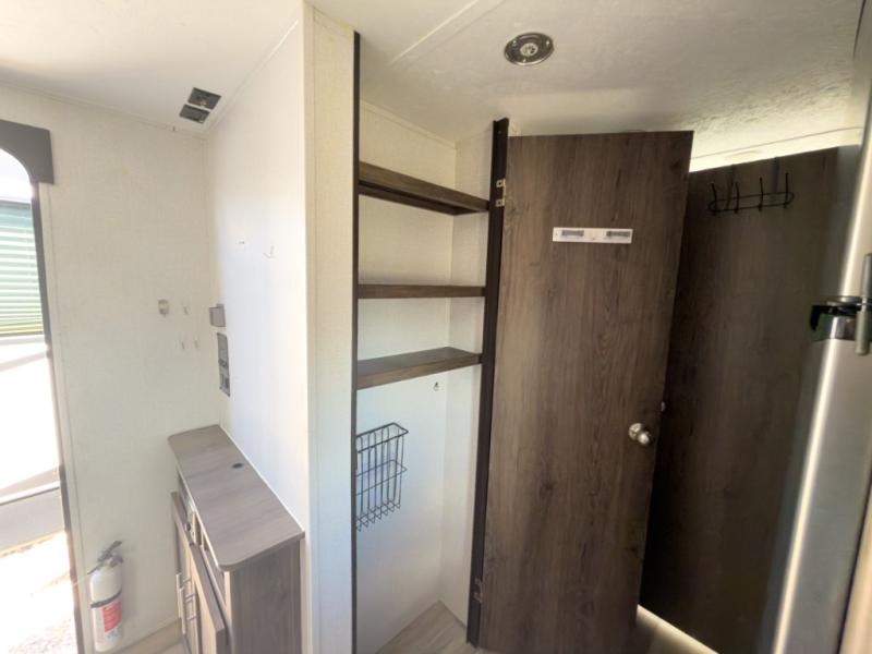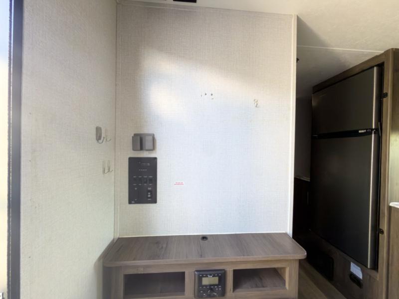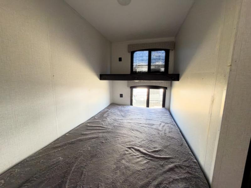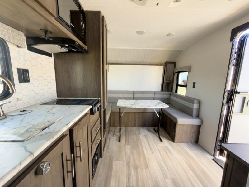 The chef will love cooking at the outside kitchen of this travel trailer! The inside kitchen is fully equipped too with a two burner cooktop, a 7 cu. ft. gas/electric refrigerator, an undermount sink with sink cover, and a pantry with upper bunk storage space. There is also a vanity, a wardrobe, and a linen closet inside the rear corner bathroom for your storage needs. The kiddos can sleep on the set of 42" x 74" bunk beds and you can sleep on the front 75" x 54" Murphy bed which transforms into a U-shaped dinette with a free standing table. Watch your favorite movies at night with the entertainment center too!