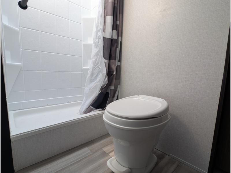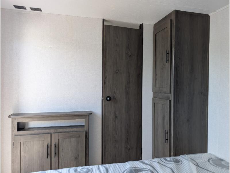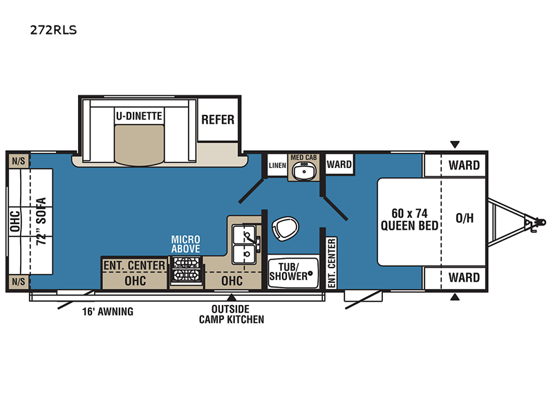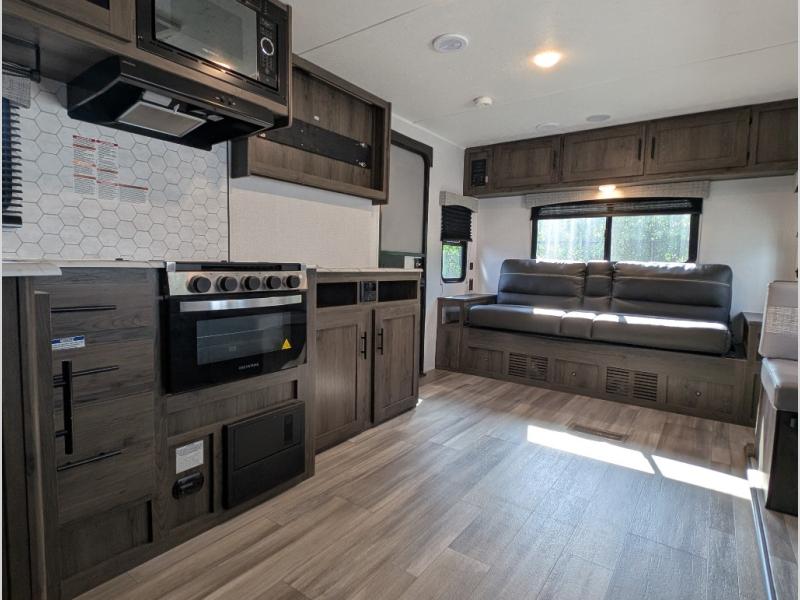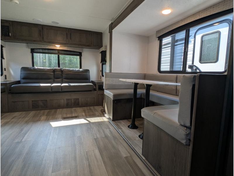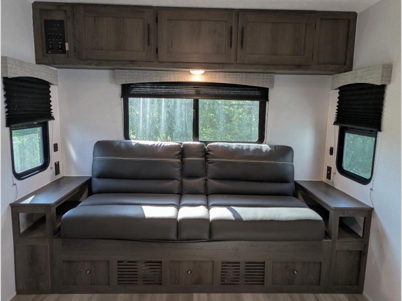 Camp in true luxury with this travel trailer! With dual entry doors, you will have a smooth flow of traffic in and out of the unit. One of the entrances even leads directly into the front private bedroom which has a 60" x 74" queen bed with wardrobes on either side, another wardrobe, an entertainment center, and an entrance into the walk-through bathroom. Prepare your best home cooked meals either with the indoor three burner cooktop or head to the outside camp kitchen and breathe in some fresh air while grilling up some juicy burgers. Eat your meals and play card games at the U-shaped dinette then relax on the rear 72" sofa while watching a movie with the entertainment center!