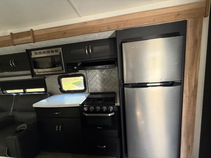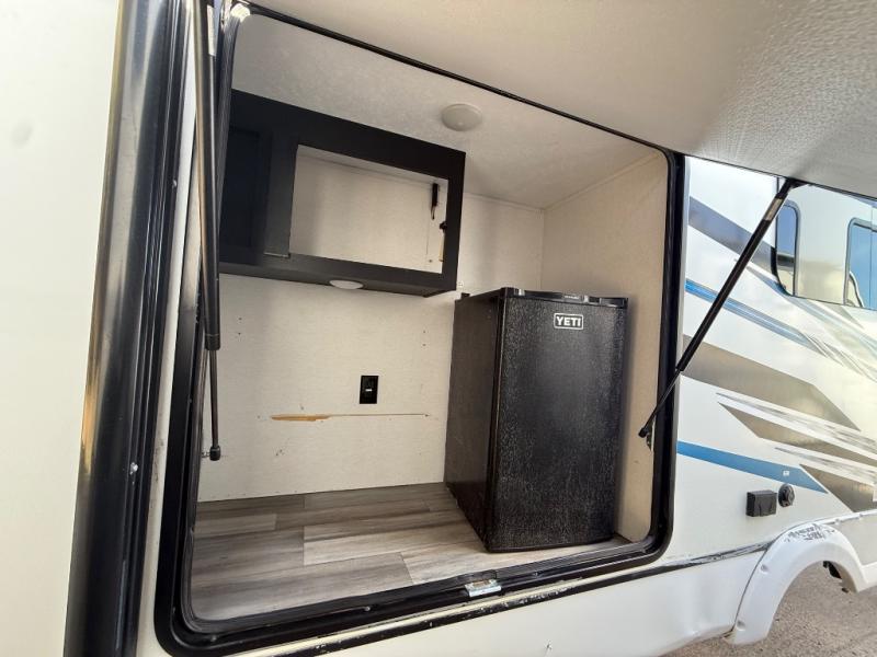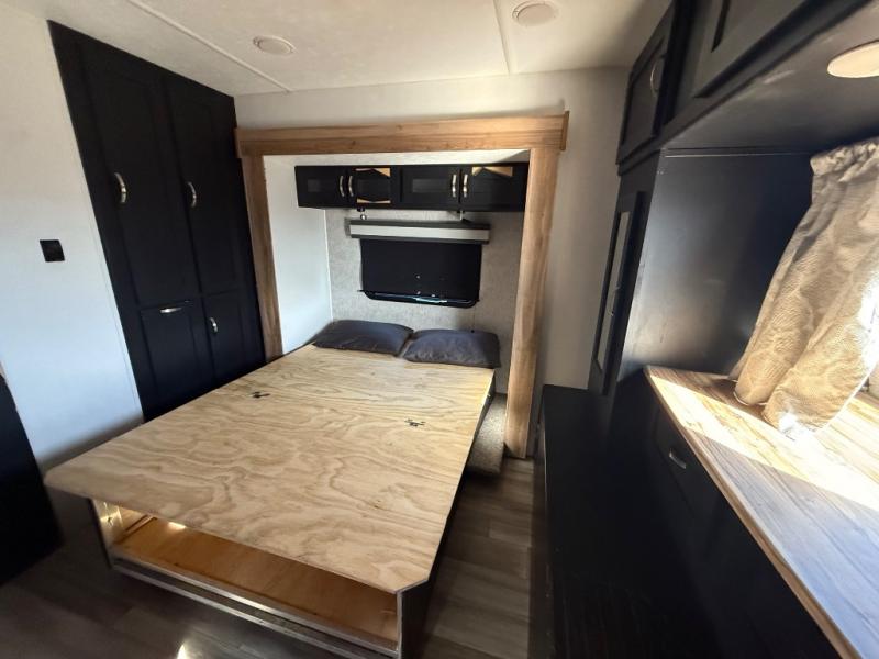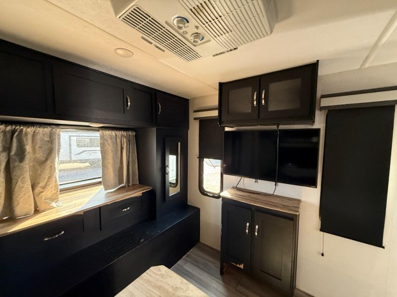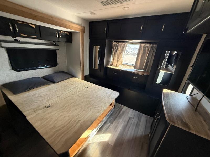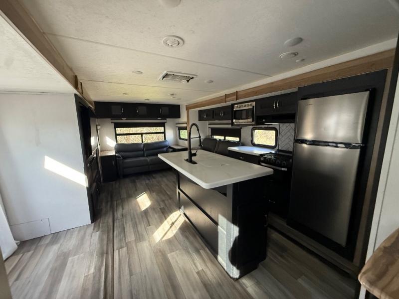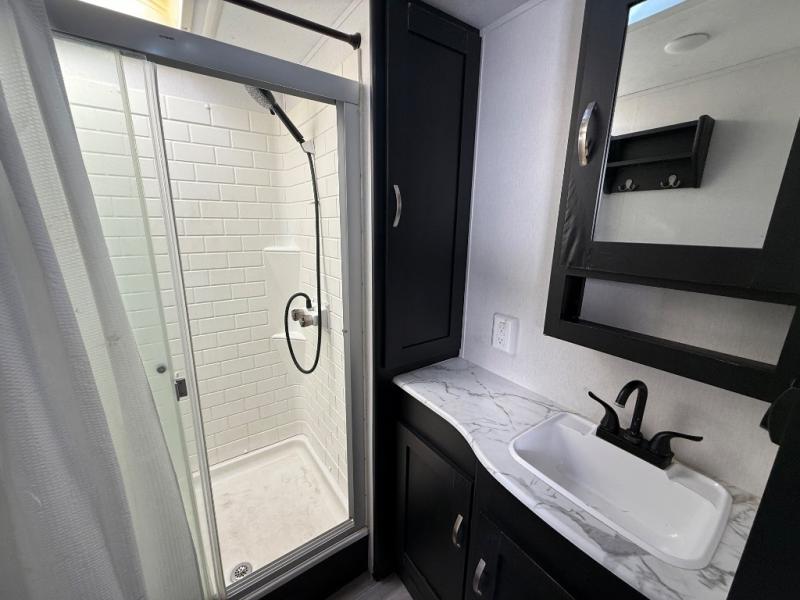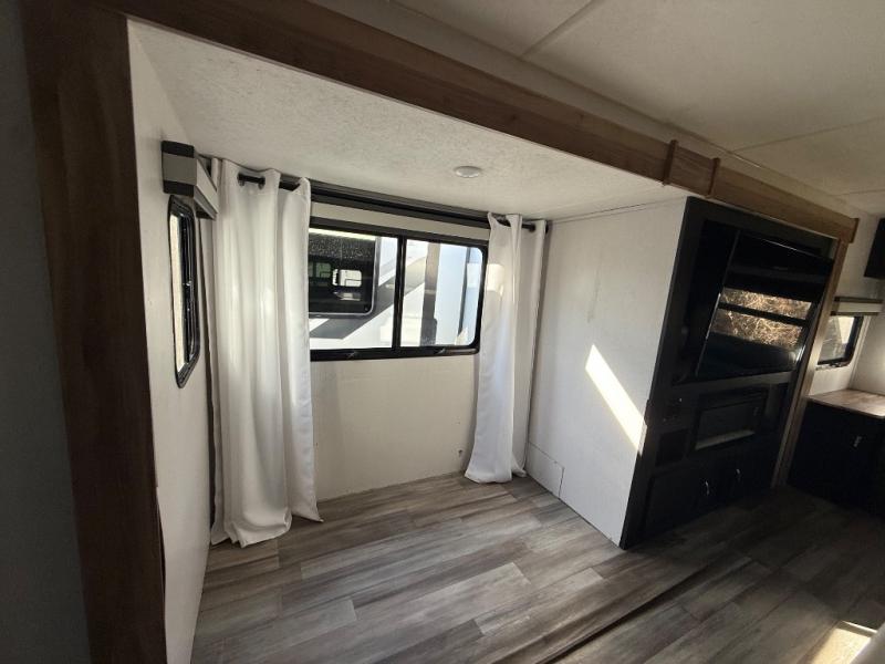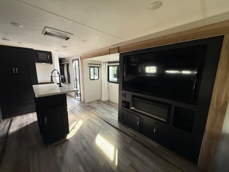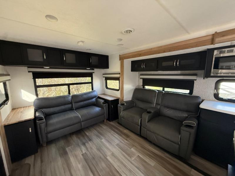 This spacious trailer offers dual opposing slides in the main living and kitchen area and a queen bed slide in the bedroom giving you lots of floor space in both areas! The kitchen offers full amenities including a large pantry, extra counter space, a center island, and a booth dinette. And the cook will be able to enjoy the LED TV and fireplace while making meals. Everyone can relax on the theater seats and the hide-a-bed sofa with end tables when visiting, and the furniture can double as sleeping space if needed. You will have your own bedroom to unwind with plenty of storage in the dressers and wardrobes. And the full bathroom offers a shower, linen storage and laundry bag, plus extra counter space for your toiletries.